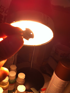 Now came the VERY TRICKY part! I struggled for a LONG TIME — close to a half-hour — trying to insert the small length of pole into the hole in the underside of the hand — without success — until the solution finally hit me: DRILL AN ACCESS HOLE THROUGH THE BOTTOM OF THE BASE, which would enable me to simply slide the pole straight through and up into the hole in the bottom of the left hand, like so: