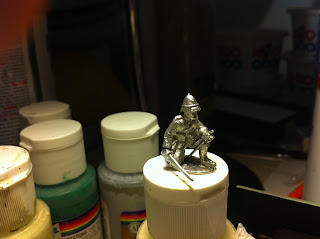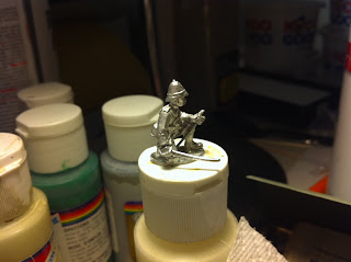 I used a push-pin to make a guide-hole in the underside of the infantryman’s clenched left fist, then widened the hole with a jeweler’s screwdriver, in preparation for inserting the small length of flagpole.