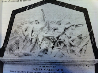 Early this past Summer I wanted to find a figure who looked like Colonel James Galbraith, commanding officer of the 66th Regiment, does in the above memorial plaque, which was raised to his memory, in an Irish church, by his brothers and sisters — down on one knee, with a colour in one hand and his sword in the other.