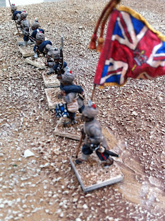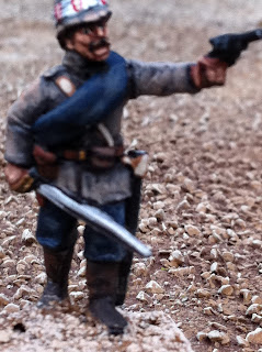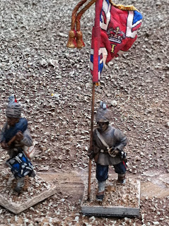 The other thing in these pics that I have yet to blog about is converting the turbans of Perry Sudan Bombay/Bengal Infantry into 1880 Bombay Grenadiers, wearing uncovered turbans with visible folds, kullahs sticking up in the middle and one end of their wrapped lungis poking out in front. It’s a simple conversion process, all focused on the figure’s headgear. Doing it twice for my pair of standard bearers was no problem at all, but doing it for an entire unit — which I’m still in the midst of — has been more of a challenge. When the entire unit is done I’ll put up a post about how I did it, in case anyone wants the details. I took a few pics with the converted Bombay Grenadier NCO side-by-side with the version that came straight-out-of-the-box. The British officer has a puggaree inspired by a waist-sash worn by a member of the regiment in this illustration from a decade or two later: