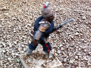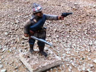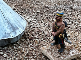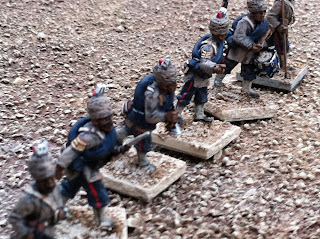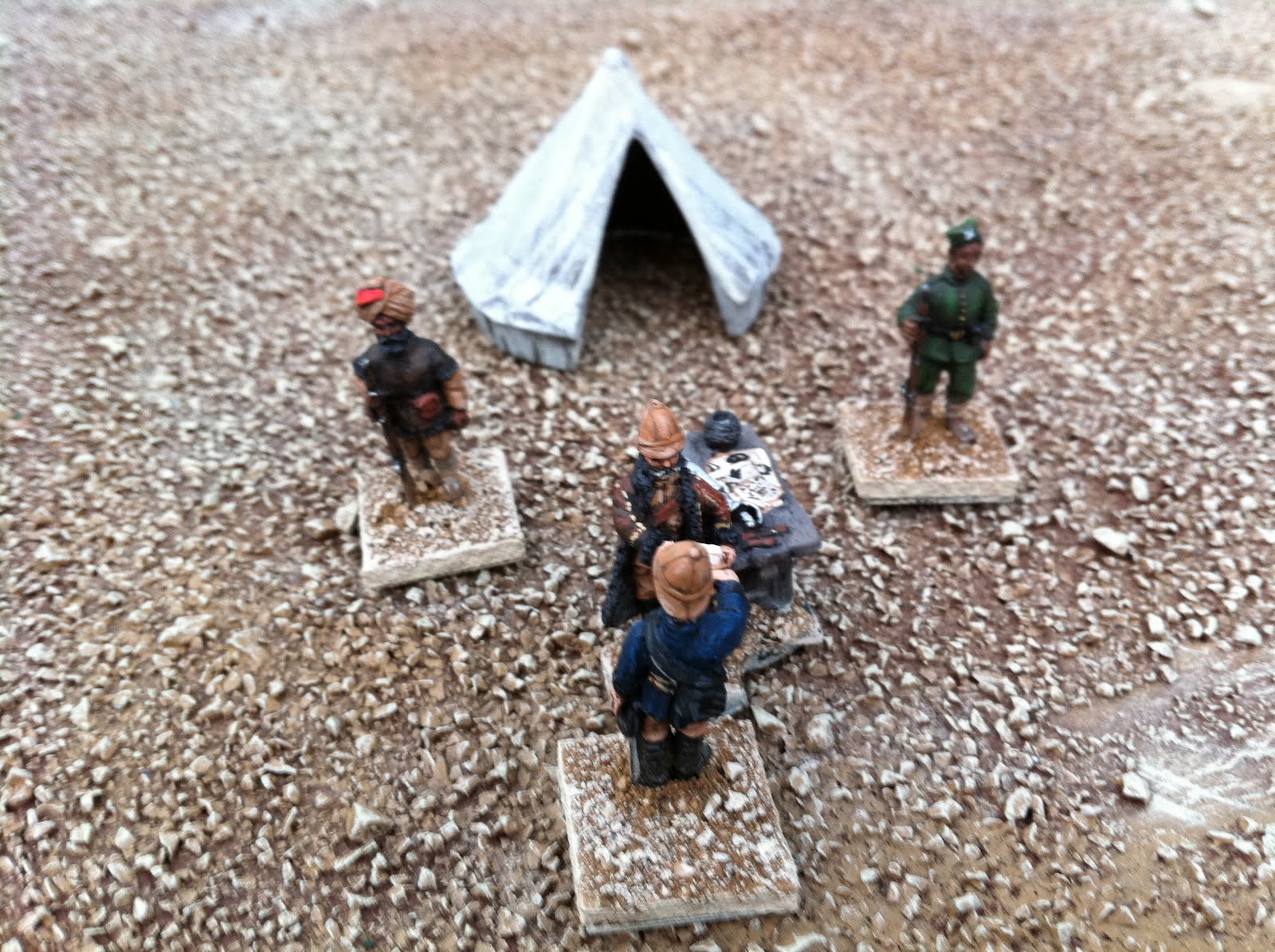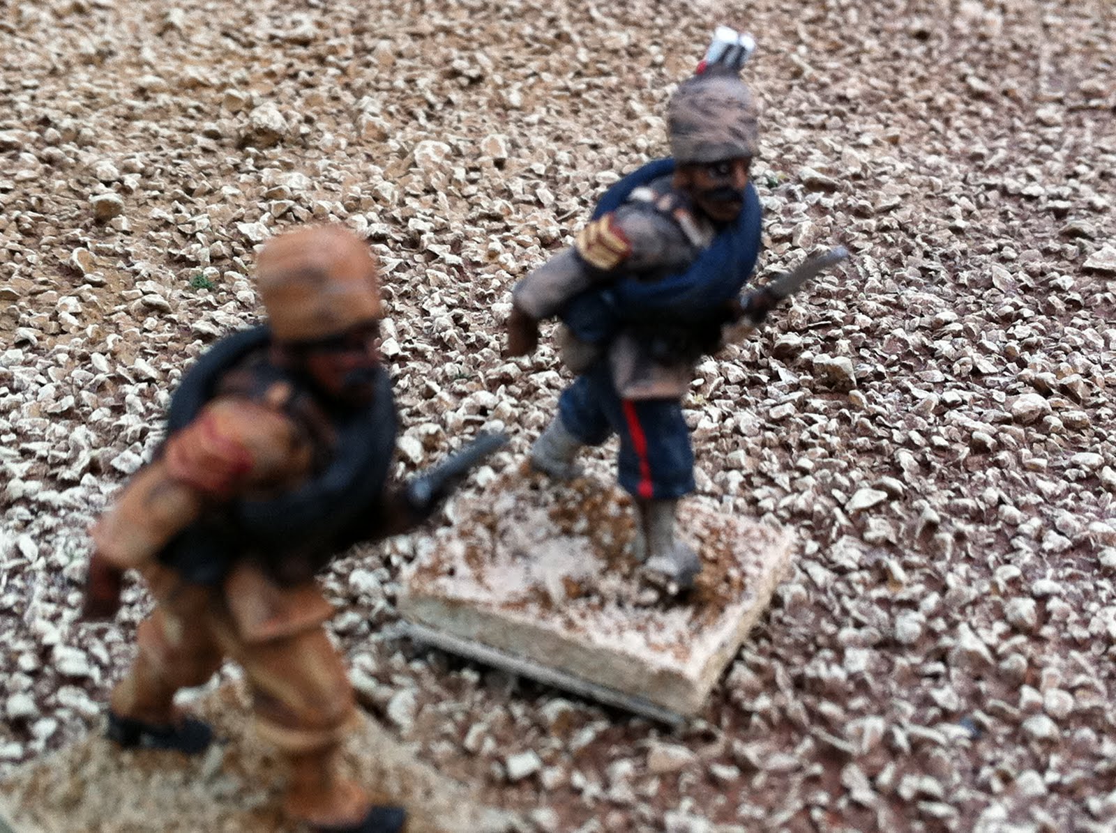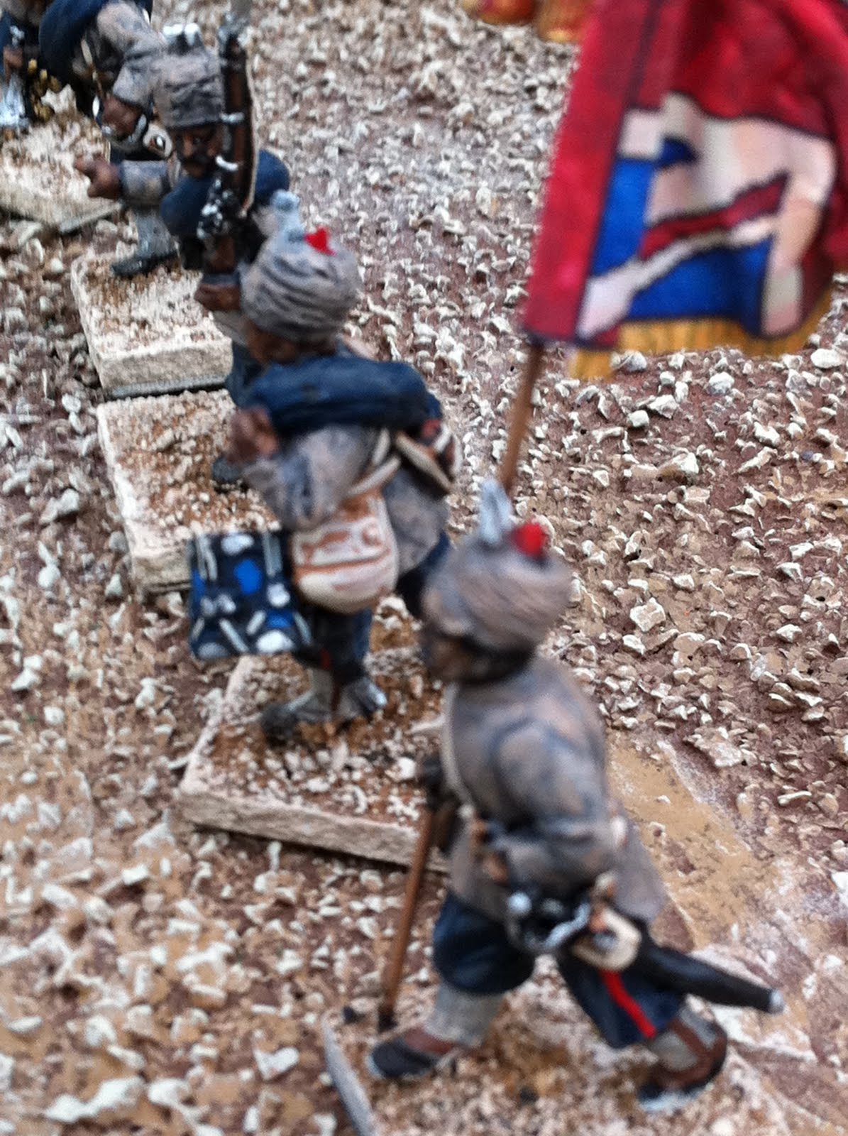 The other thing in these pics that I have yet to blog about is converting the turbans of Perry Sudan Bombay/Bengal Infantry into 1880 Bombay Grenadiers, wearing uncovered turbans with visible folds, kullahs sticking up in the middle and one end of their wrapped lungis poking out in front. It’s a simple conversion process, all focused on the figure’s headgear. Doing it twice for my pair of standard bearers was no problem at all, but doing it for an entire unit — which I’m still in the midst of — has been more of a challenge. When the entire unit is done I’ll put up a post about how I did it, in case anyone wants the details. I took a few pics with the converted Bombay Grenadier NCO side-by-side with the version that came straight-out-of-the-box. The British officer has a puggaree inspired by a waist-sash worn by a member of the regiment in this illustration from a decade or two later: