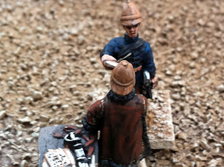 The pics below are the first I’ve ever taken OUTSIDE, rather inside my garage. I lugged one of the terrain boards out to the driveway and set up the figures, while the sun was still out. I think the natural light looks good. On the other hand, I wish I had a camera with true “selective” focus, since no matter how hard I tried to use the touch-screen select, my iPhone camera kept wanting to focus on the ground cover as much as the figures, but I think the ones below turned out okay.
