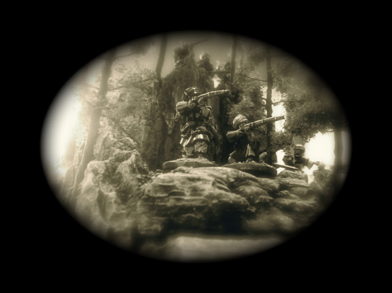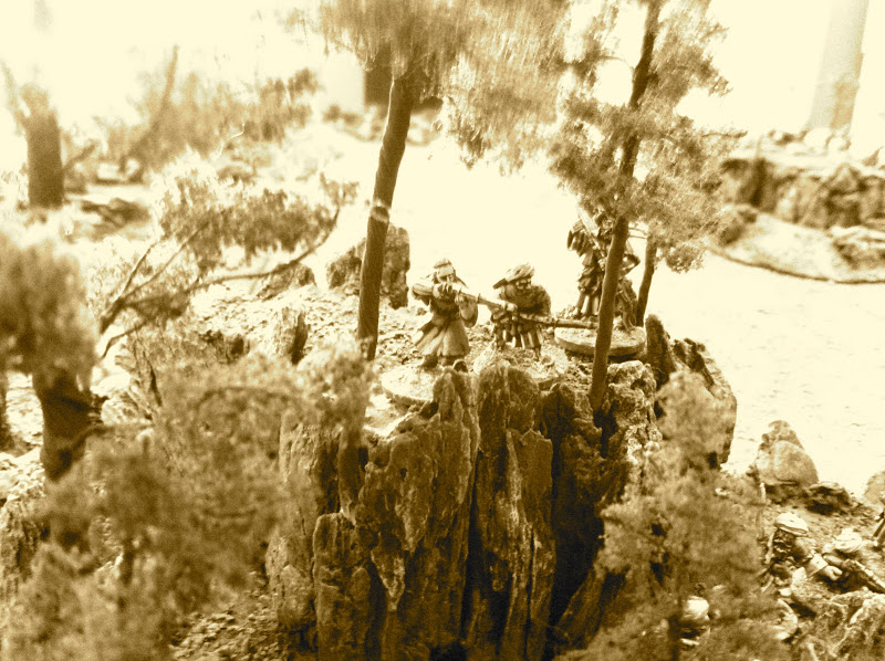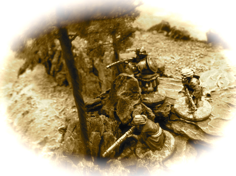 I took a pic of some figures laid out on a rocky hillside decorated with some trees and sent it to my good gaming friend Nick Stern, in Northern California, and he sent back a photoshopped SEPIA toned version that looks very cool, and which I think is worth sharing with others, so here it is to check out:
