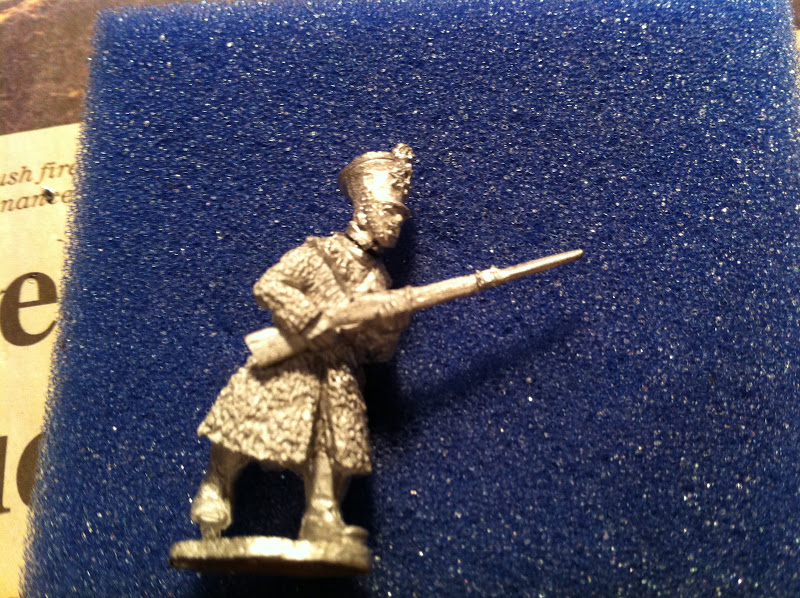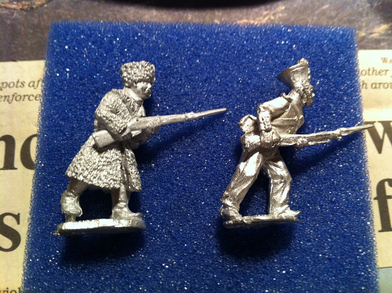 Here you can see the figure side-by-side with one of my eearlier all-Foundry conversions. The larger head from the Perry Royal Marine seemed to me to be a better fit for the slightly larger body it was going onto. Although this latest addition is a bit larger, I should be able to use them in the same unit.