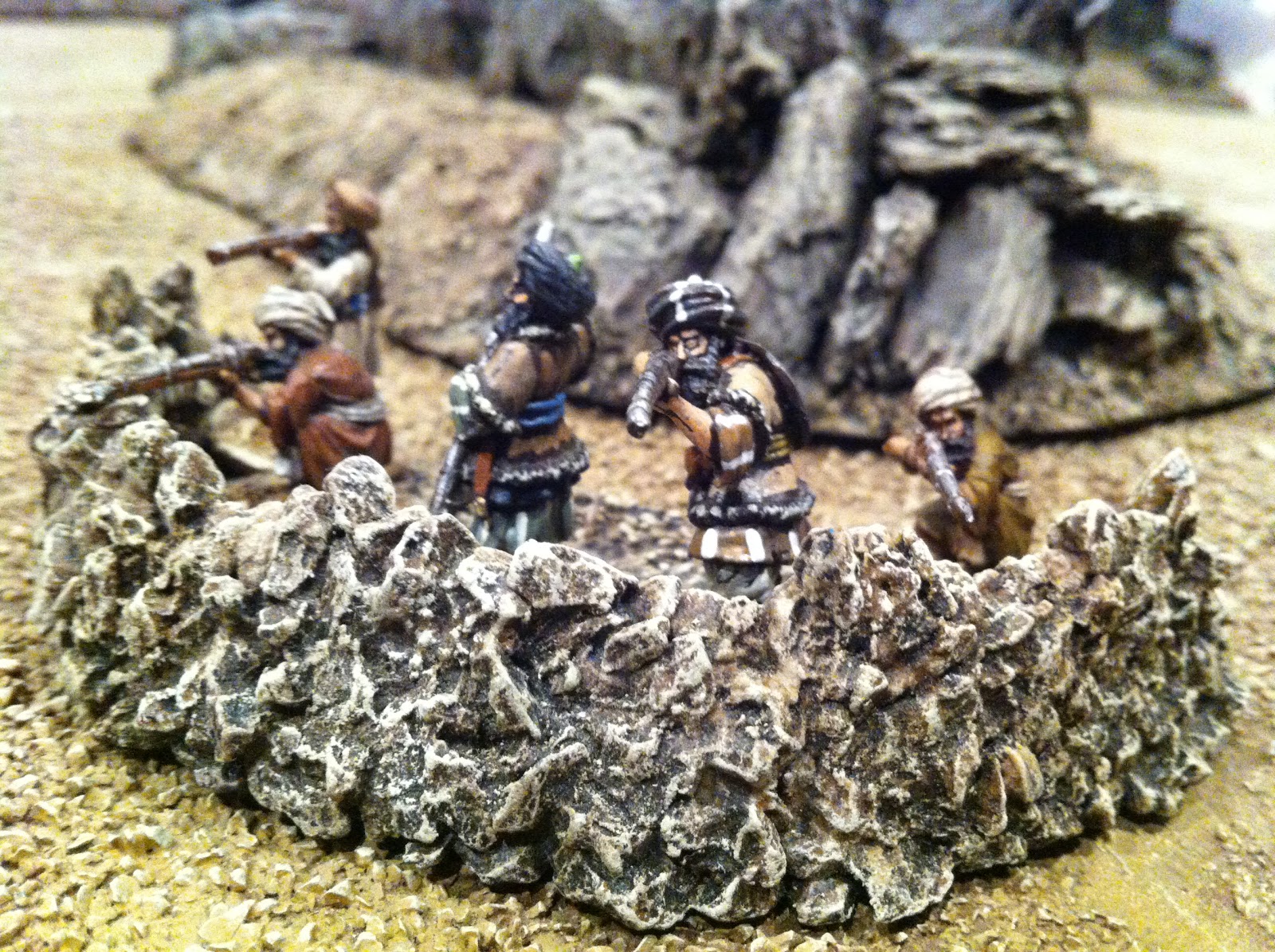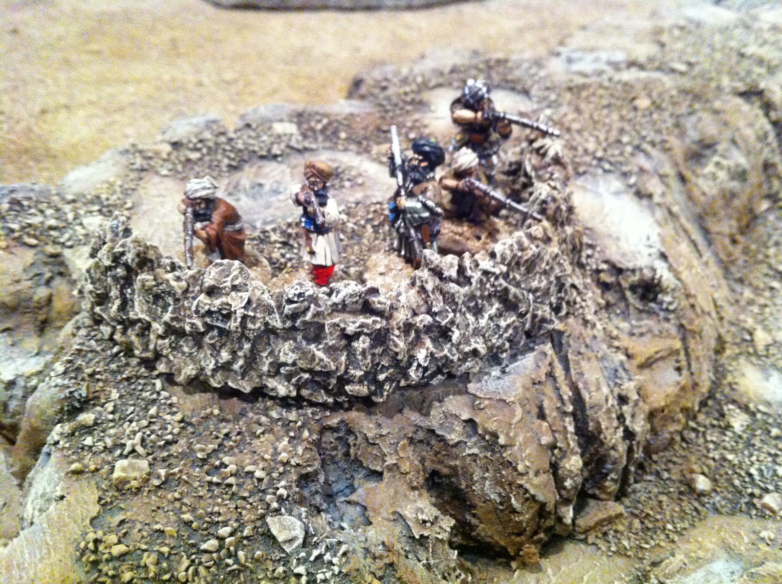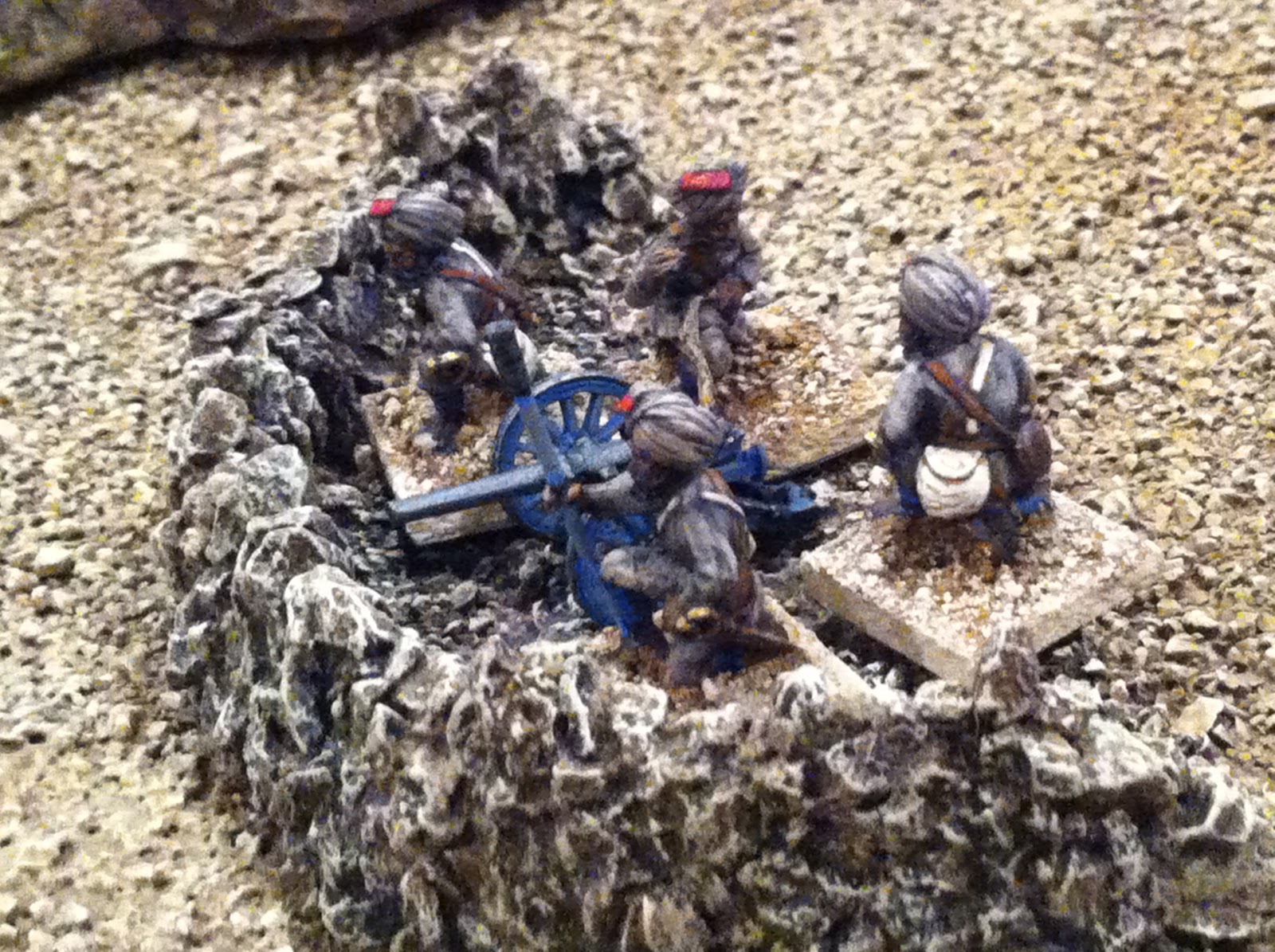 After putting some figures in position, I felt my sangars still needed more height, so added a few more layers of pebbles, using white glue in some spots and super-glue in others…