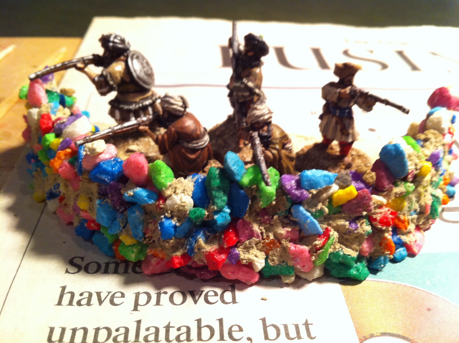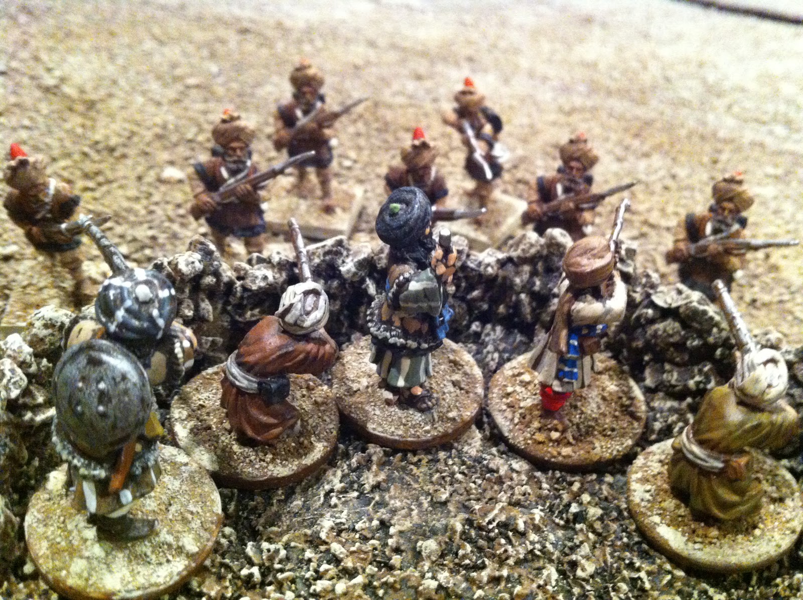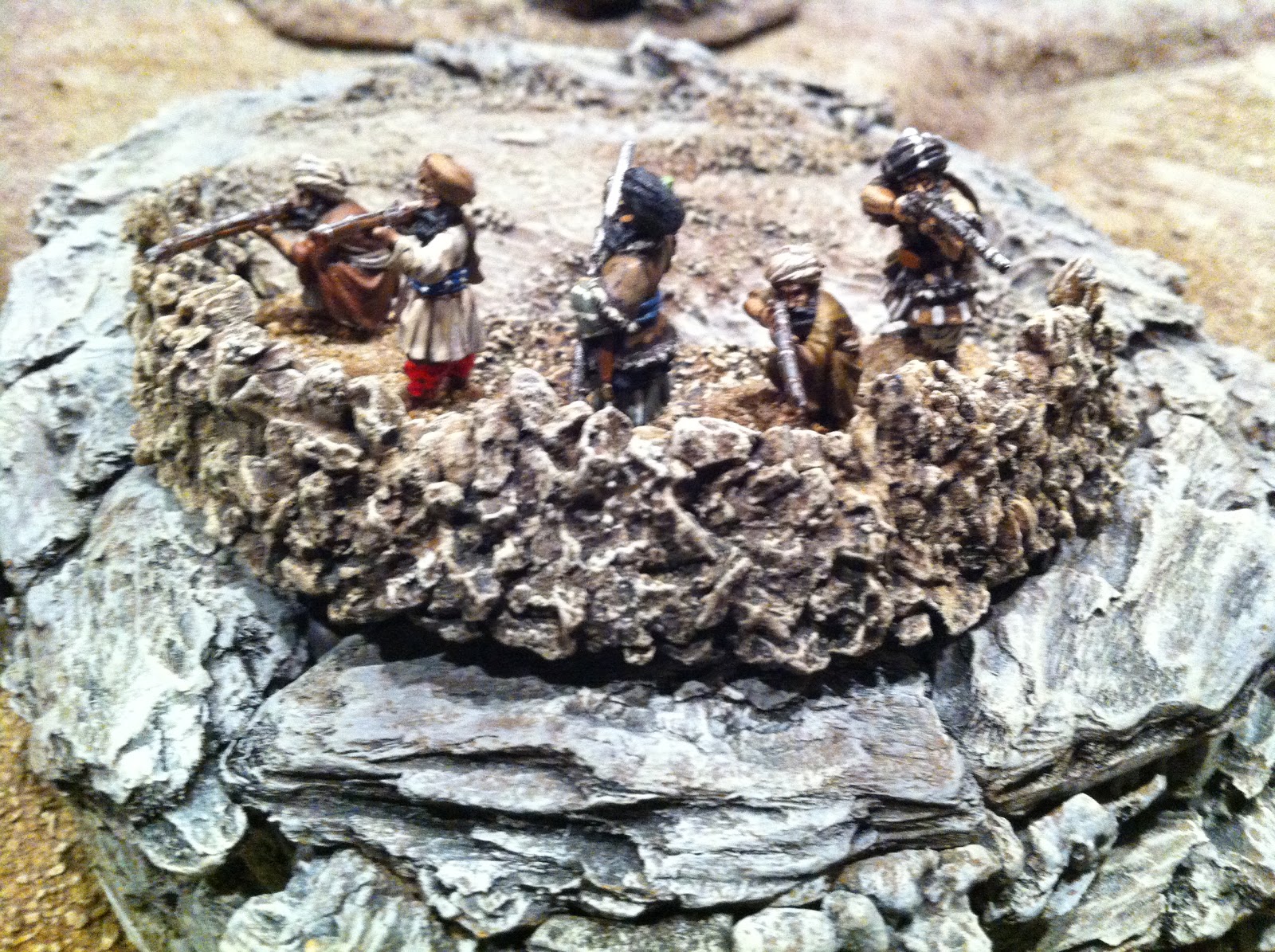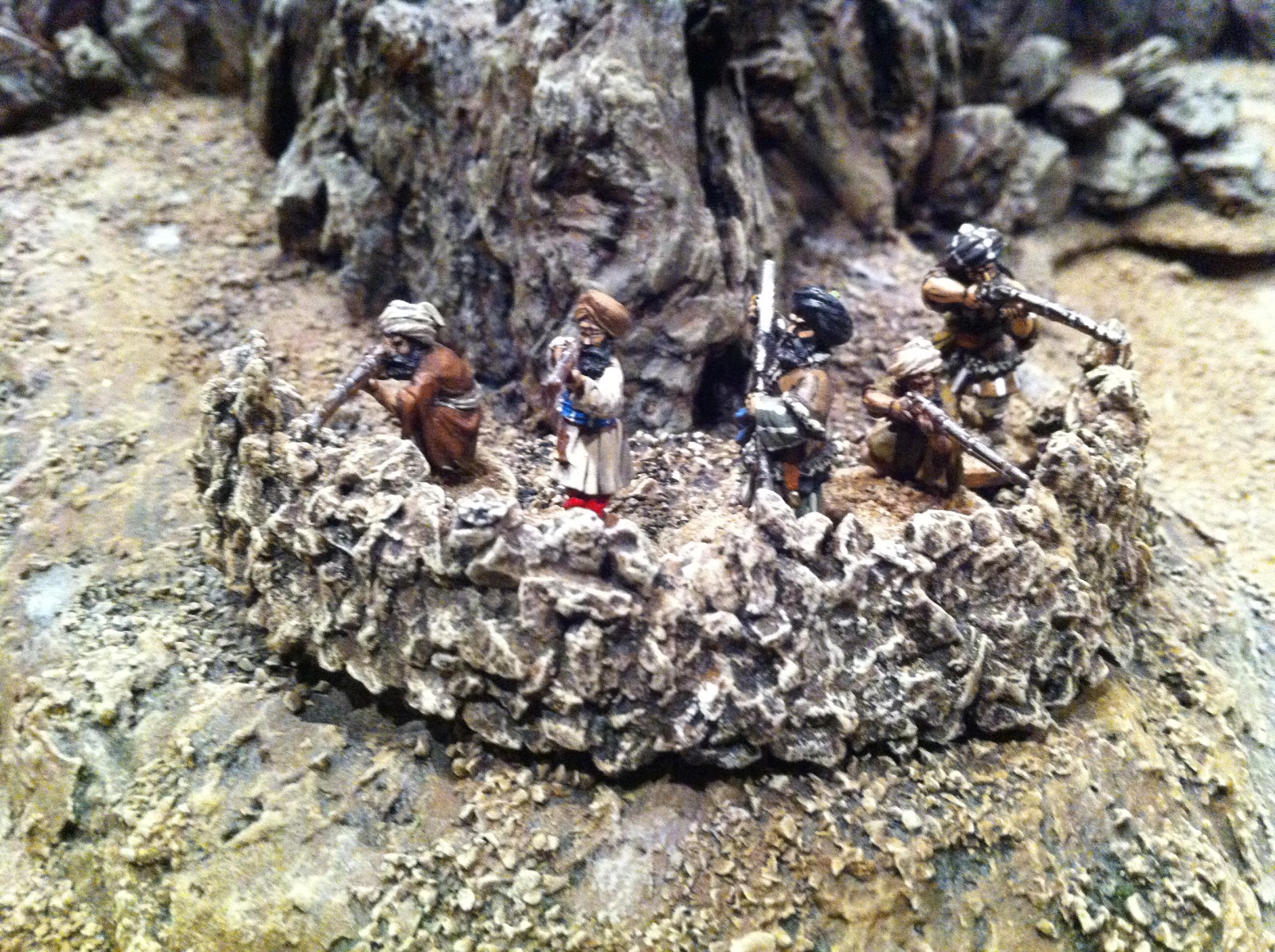 After putting some figures in position, I felt my sangars still needed more height, so added a few more layers of pebbles, using white glue in some spots and super-glue in others…