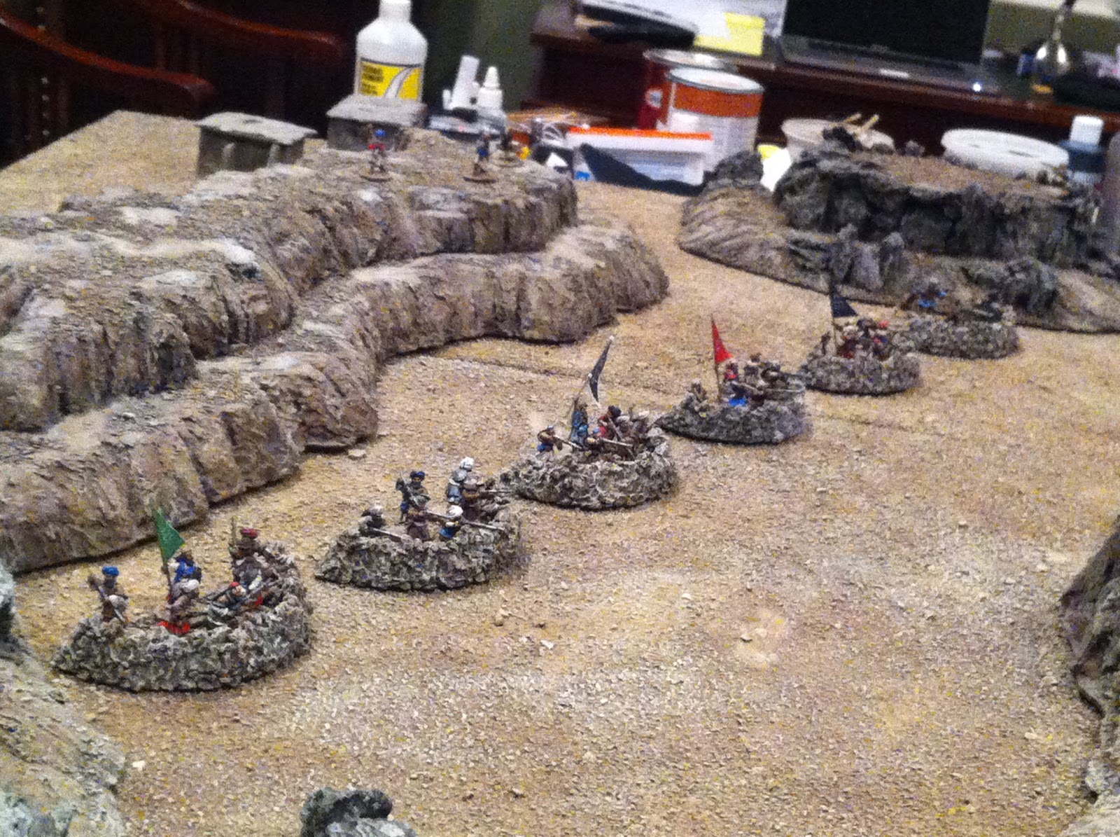 In fact I built my first several sangars using FISH-TANK GRAVEL, a combination of white glue and super-glue, but only because I had forgotten to buy the above-mentioned GORILLA GLUE.  And though these first rocky works turned out quite nice, they required a great deal more time and effort than their Gorilla Glued cousins.  I also spackled on a bit of Elmer’s Wood Filler, here and there, over the otherwise completed rocky works, to represent spots covered in dirt, fine gravel, &/or dried mud.