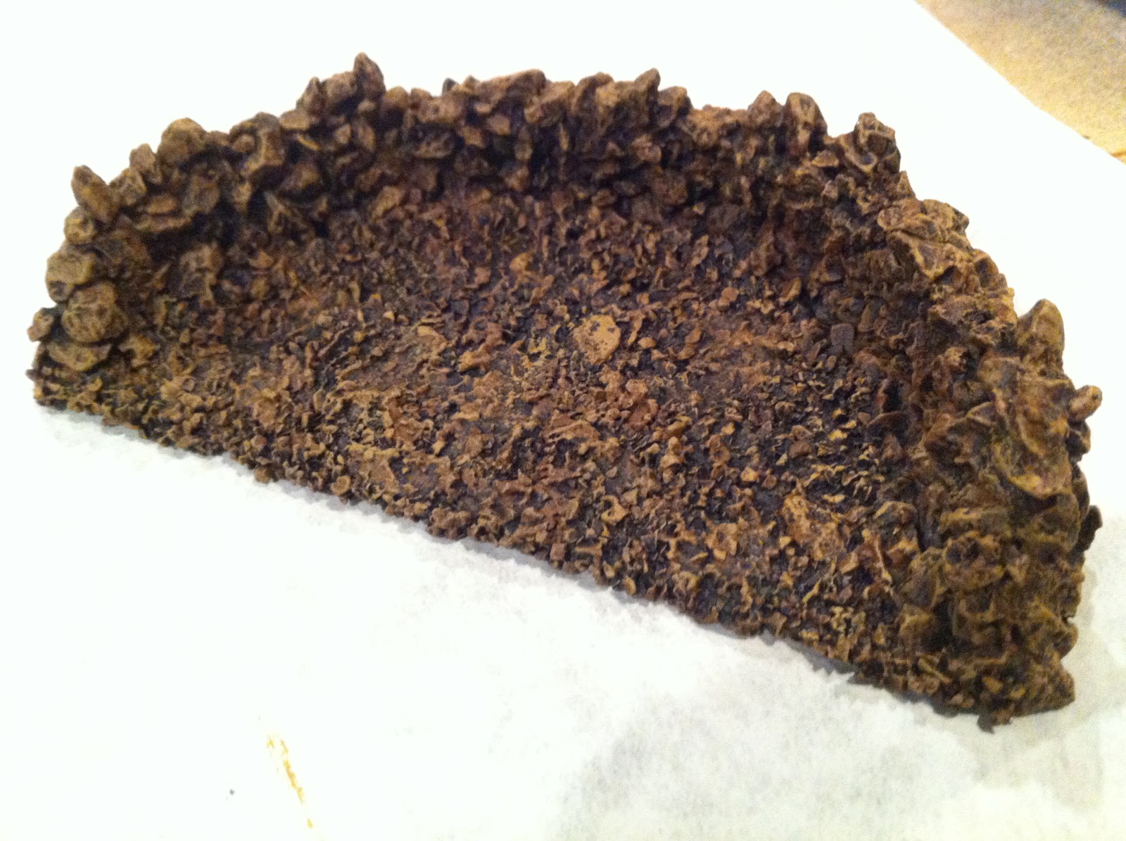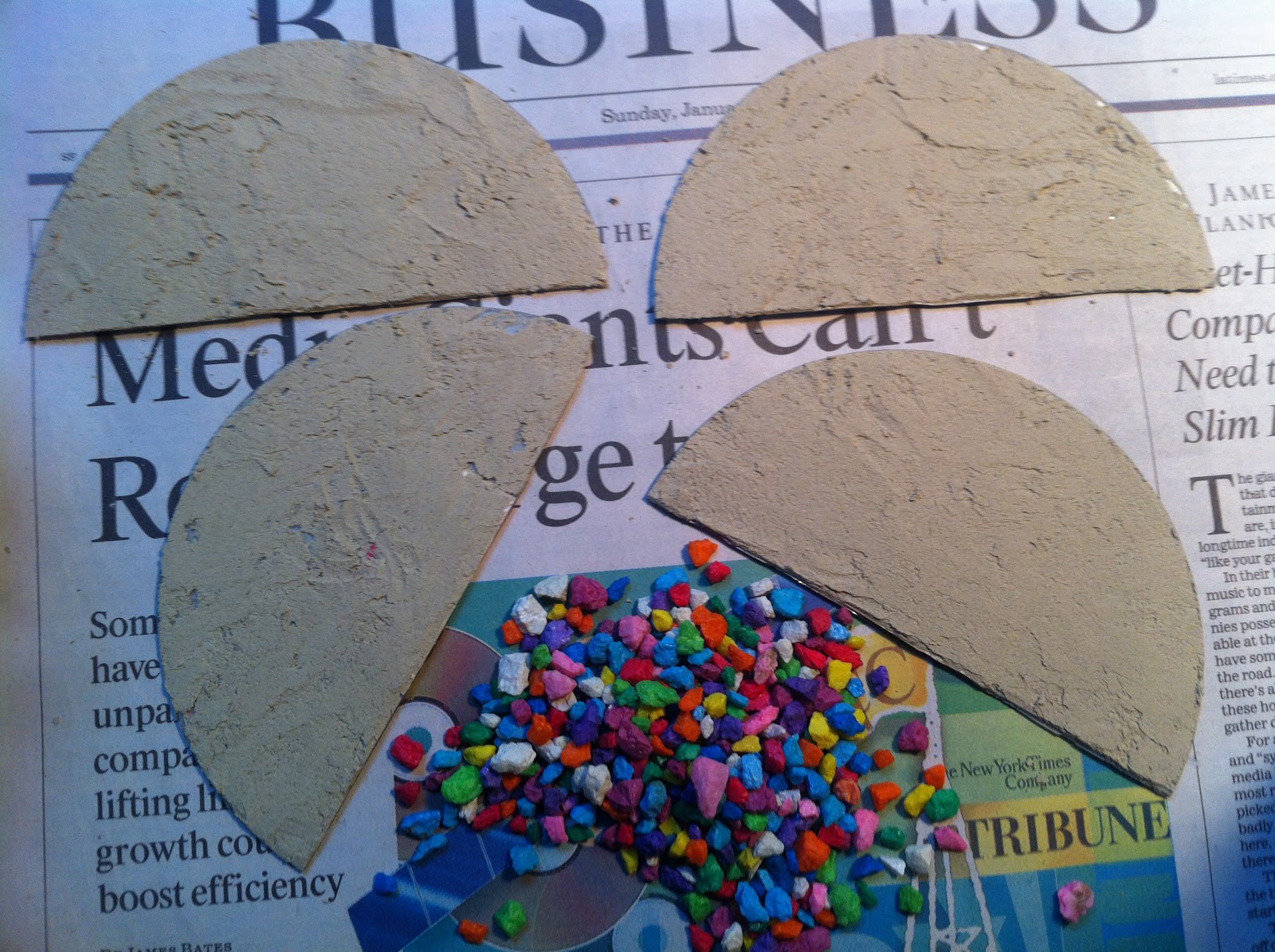 Gorilla Glue is “water activated” and the key is to SOAK your pebbles in water before placing them onto a bead of Gorilla Glue, laid along the semi-circular edge of the half CD/DVD.  The water causes the glue to EXPAND, filling in space between the pebble, kind of like mortar between bricks.  Leave it to dry for 12-24 hours, then lay down another bead and cover it with another line of pebbles.  Repeat until you reach desired height