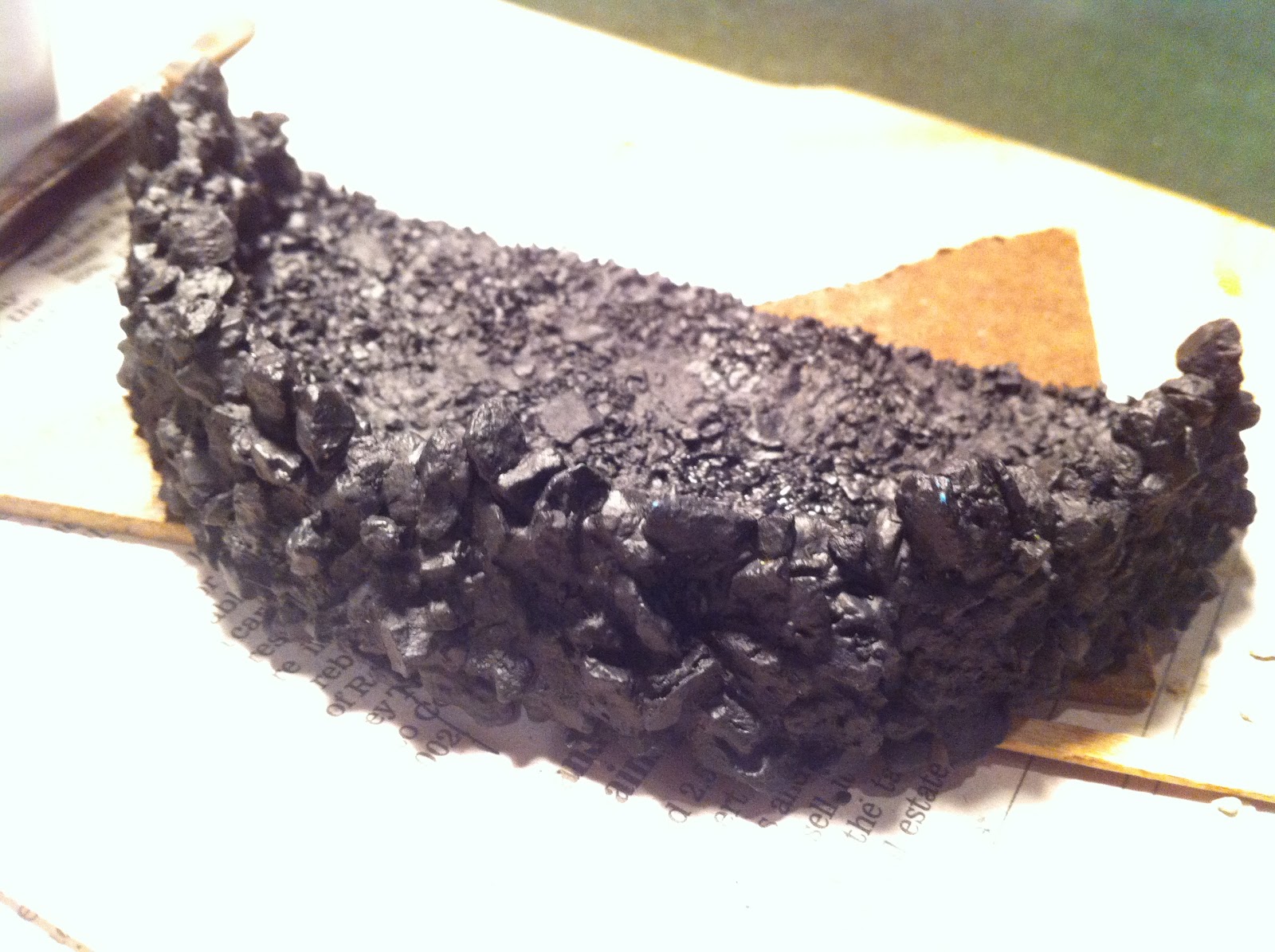 Decided I wanted to “roughen-up” the rear straight-edge of the piece, same as I’d done to the curved front edge.  Used a strip of tape, then put a bead of white glue on the edge and sprinkled on more ballast…