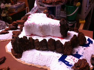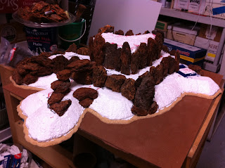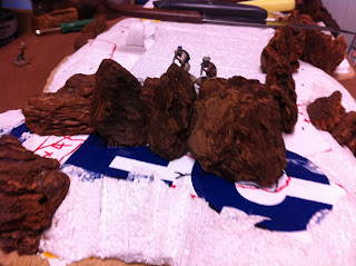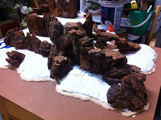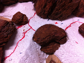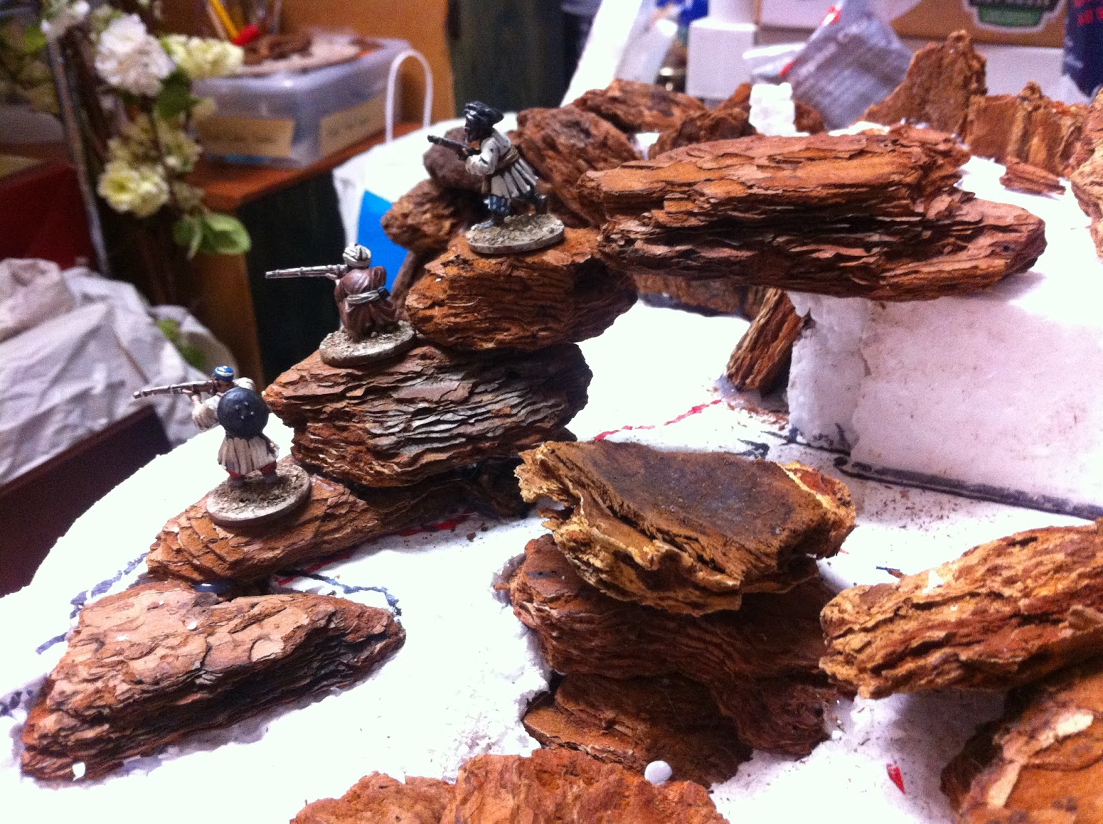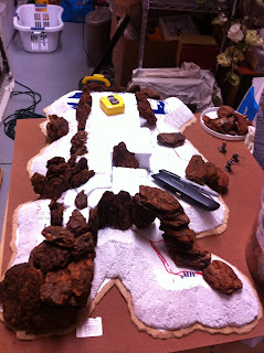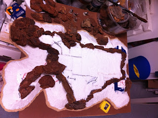With the first rocky elevation contour complete, I took the hill from my garage, where I do all the foam carving and hot-gluing, to my office, to set it down in its spot on the Charasiab table…
