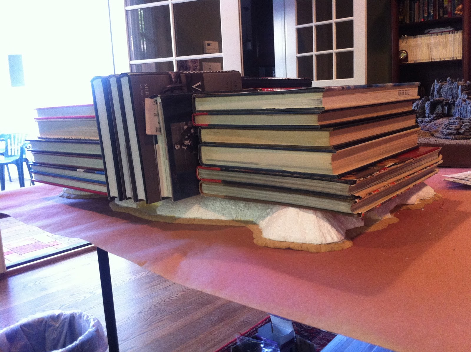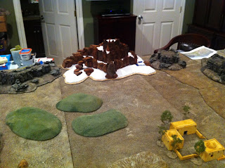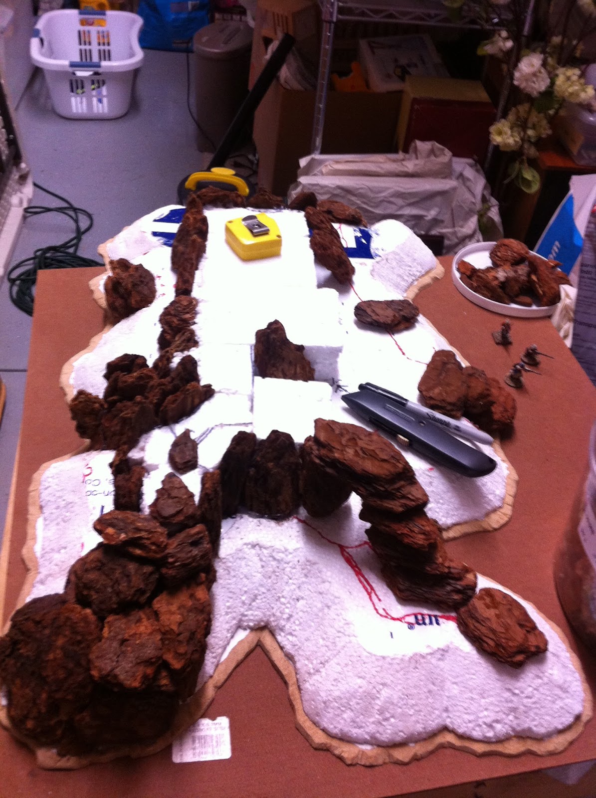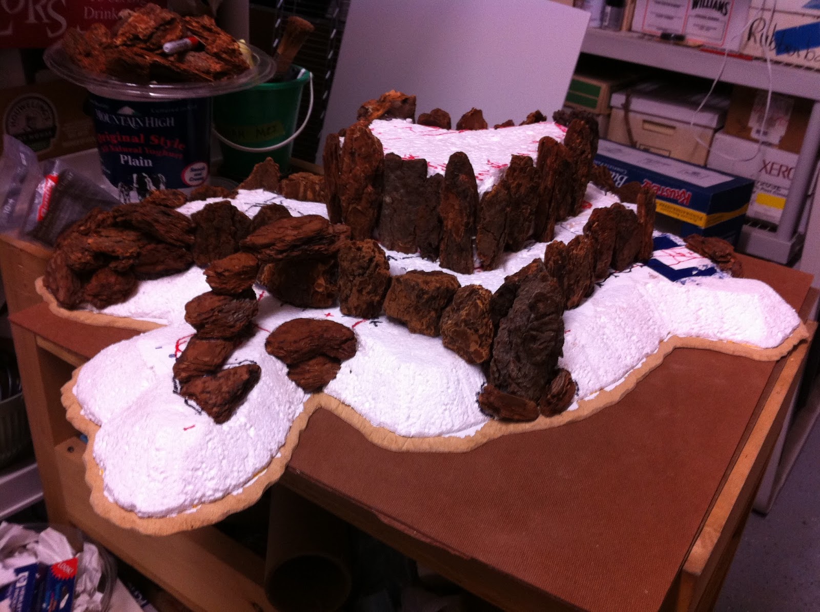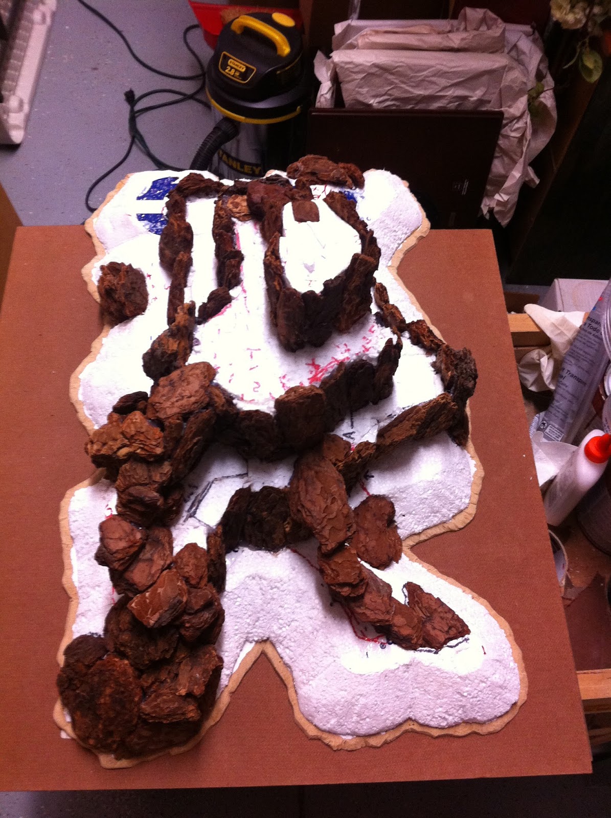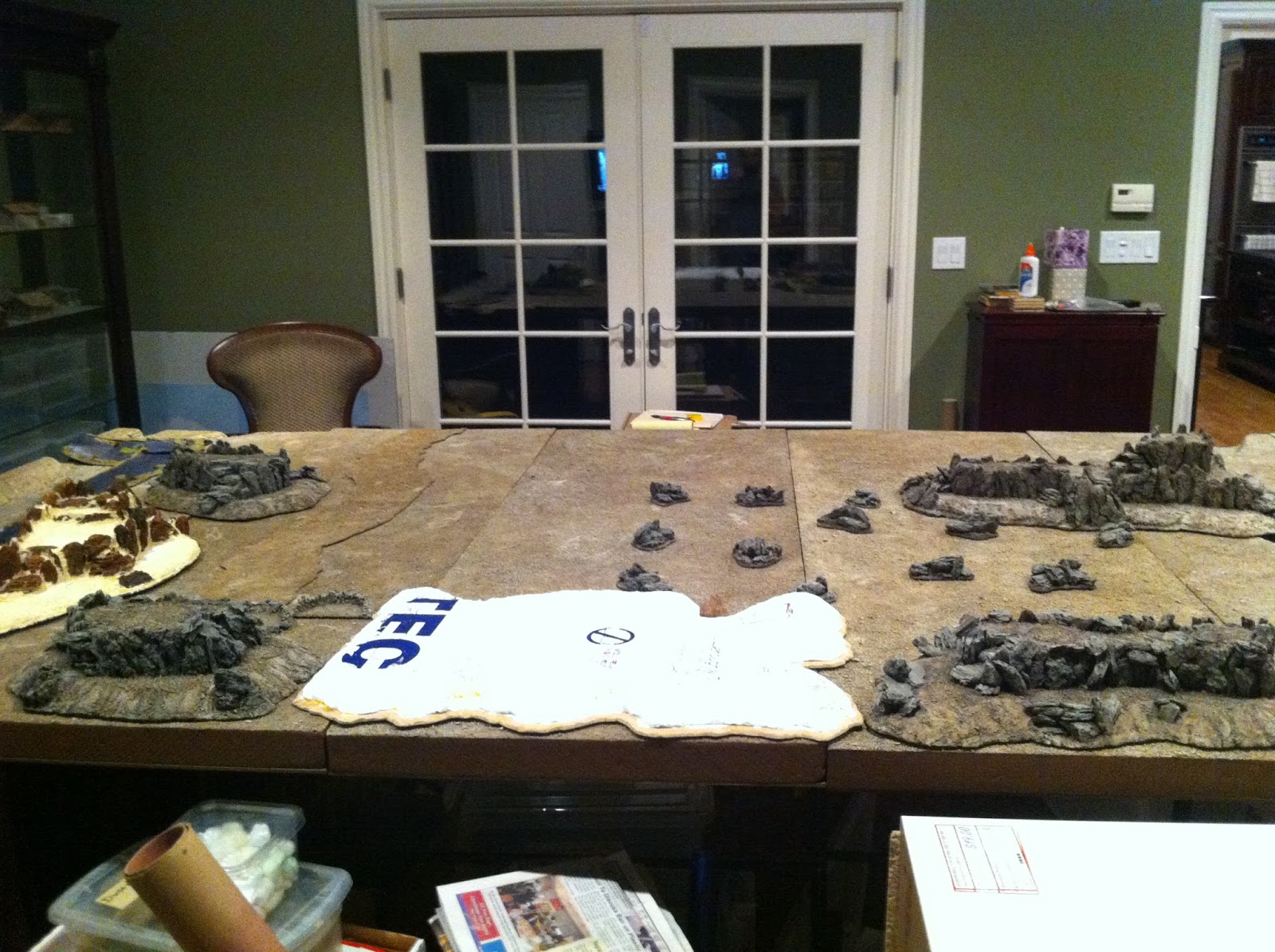 Having finished the second rocky contour, I put the hill back into its place on my table. It’s a 9’x5′ ping-pong table that’s been sitting there for quite some time, since my partner and I started working on our latest project, which has been providing office space for us since this past June. My office served as a hardcore work space for my partner and I, but since we’ve had this gig, I’ve been able to leave the table in place.