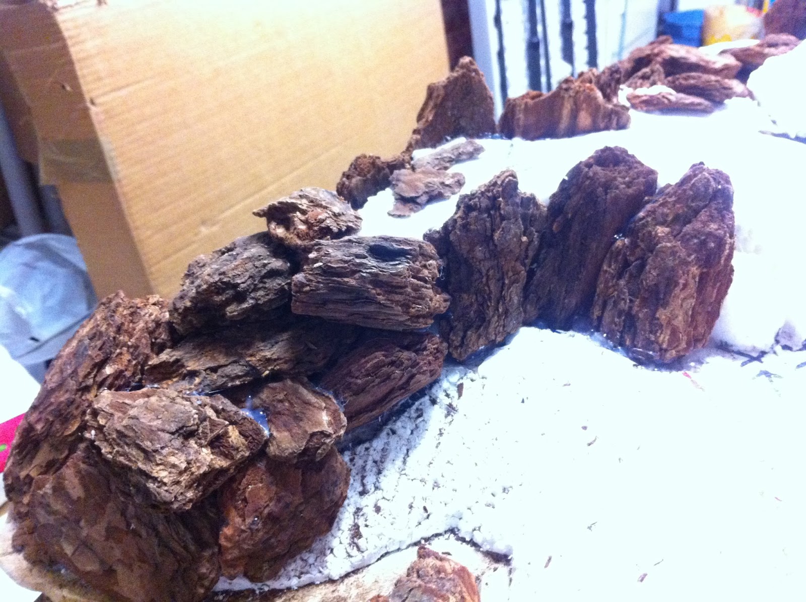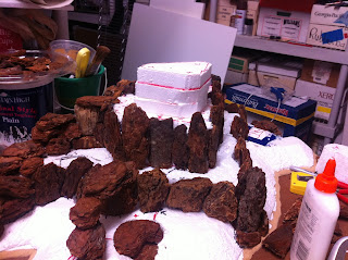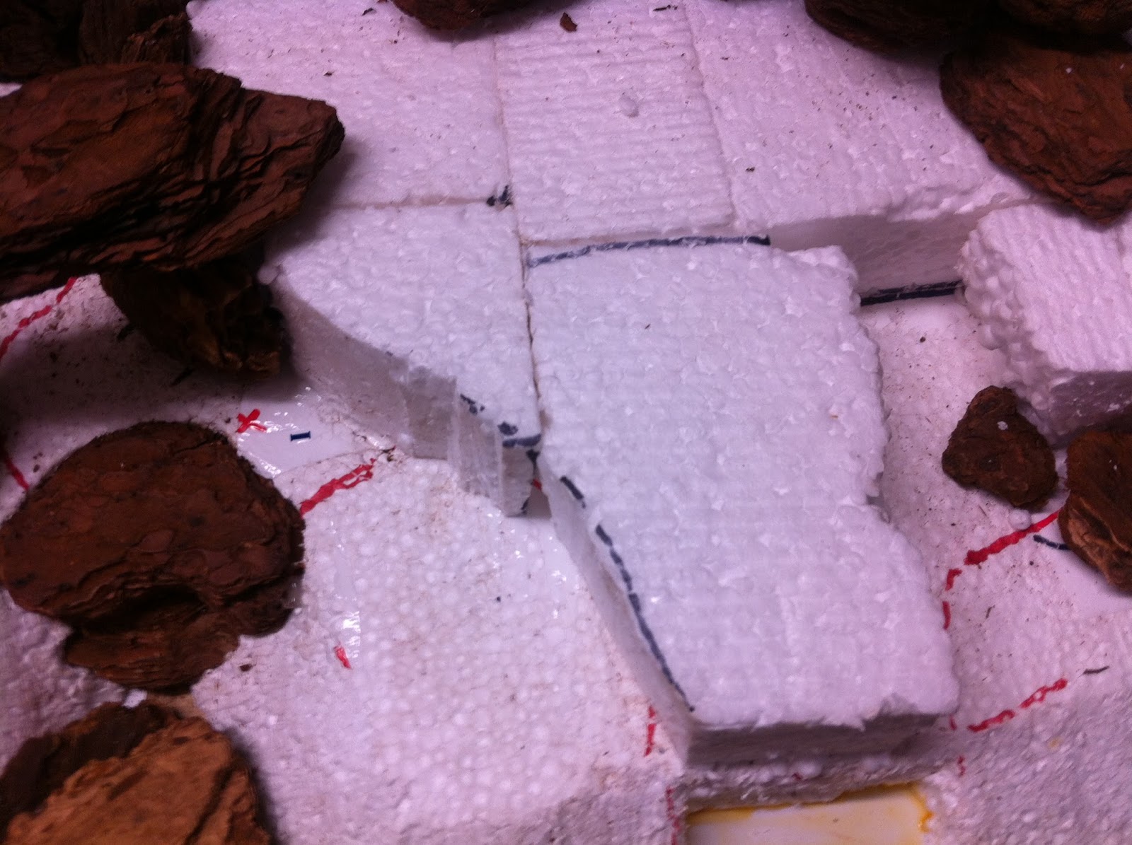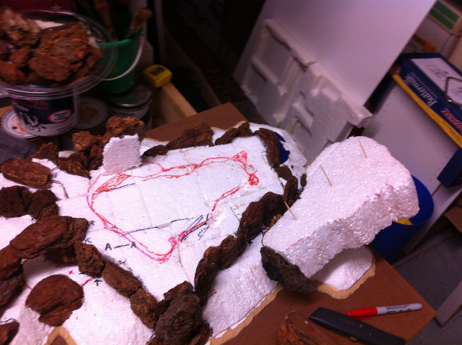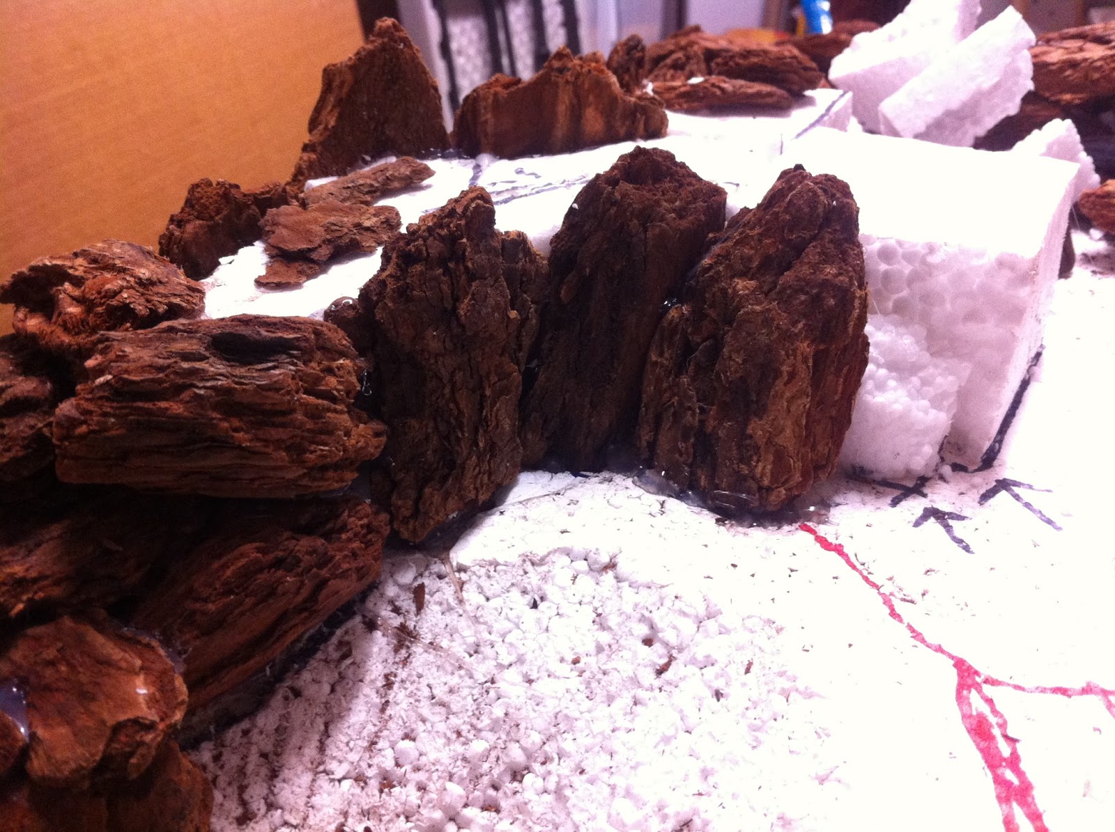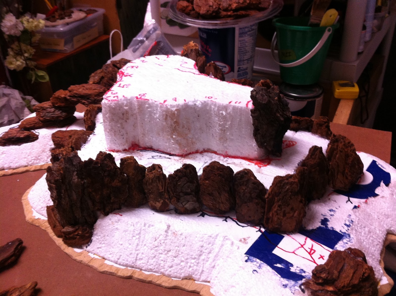 Hot-gluing of woodchips, and filling-in with 2″ tall styrofoam, begins…