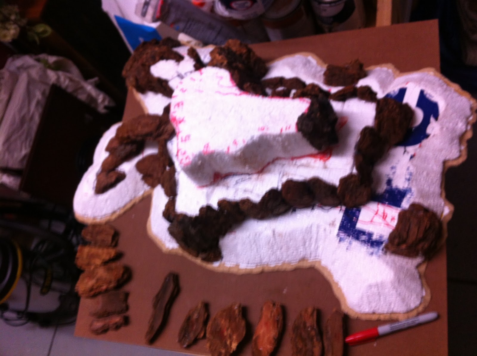 With that being said, here are some pics of the building process. It’s simple and straight-forward, though somewhat time-consuming. Kind of like putting a puzzle together, if there was no picture on the puzzle box. After cutting the Masonite/MDF baseboard and the base contour of insulation foam (in this case 1.5″ thick), the main tool required is a HOT GLUE GUN…
