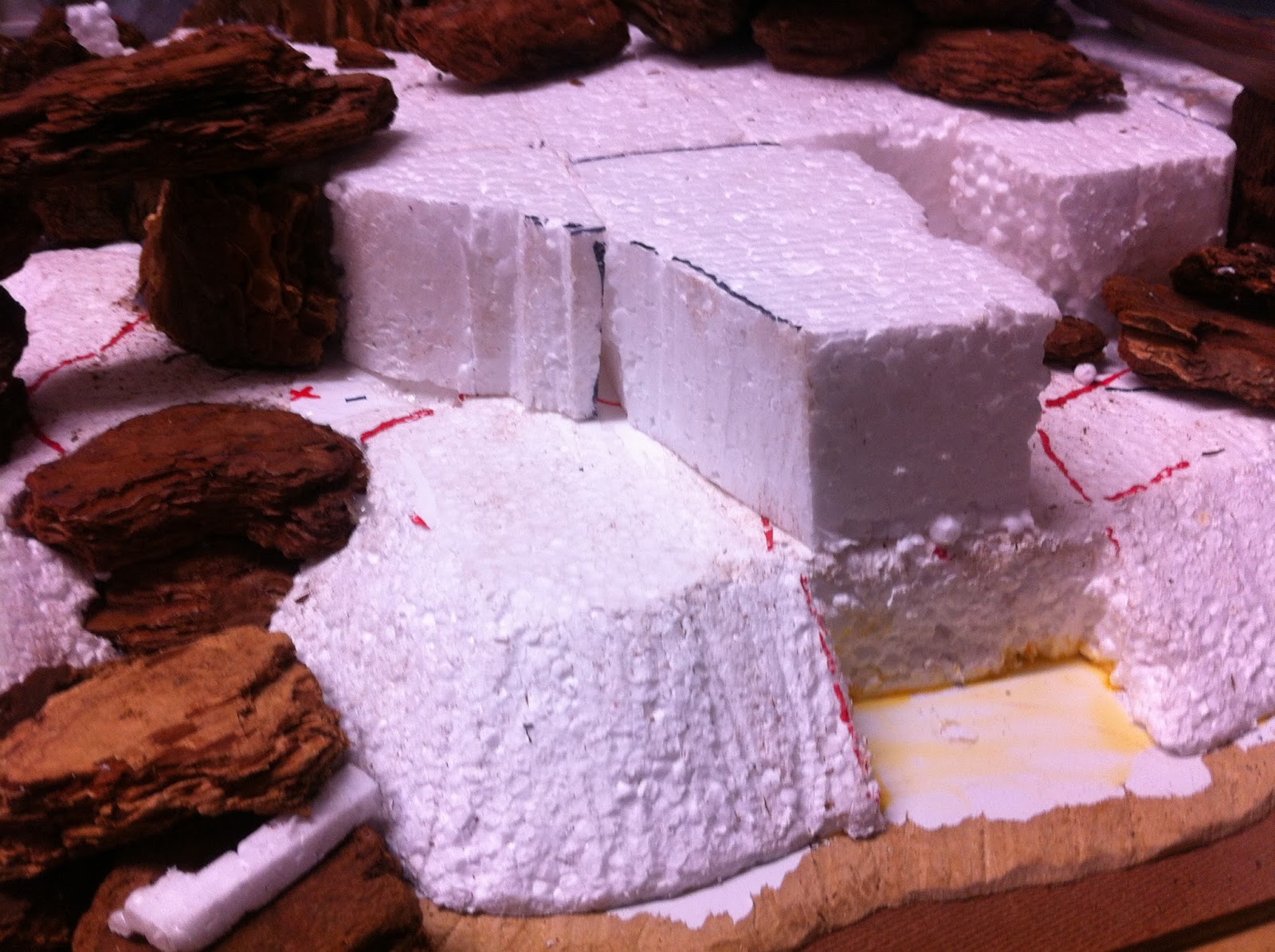 The next issue I had — there are always a few — was when I realized that the lower quality foam I’d been using since finishing the base of the hill was going to be a problem when it came to building this final, uppermost — smaller — contour. It just can’t stand up to the building process the way the higher quality insulation material can (here I’m only talking about the lesser “white” insulation material, not the REALLY good stuff that comes in blue and pink).