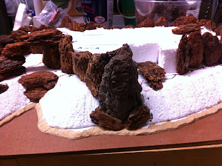Now it was time to do what I’d never done before, but been looking forward to for some time: build a THIRD rocky elevation. As with the second elevation, because it was so relatively small, I began the process by cutting out a single piece of styrofoam for the purpose, rather than piecing multiple pieces together…