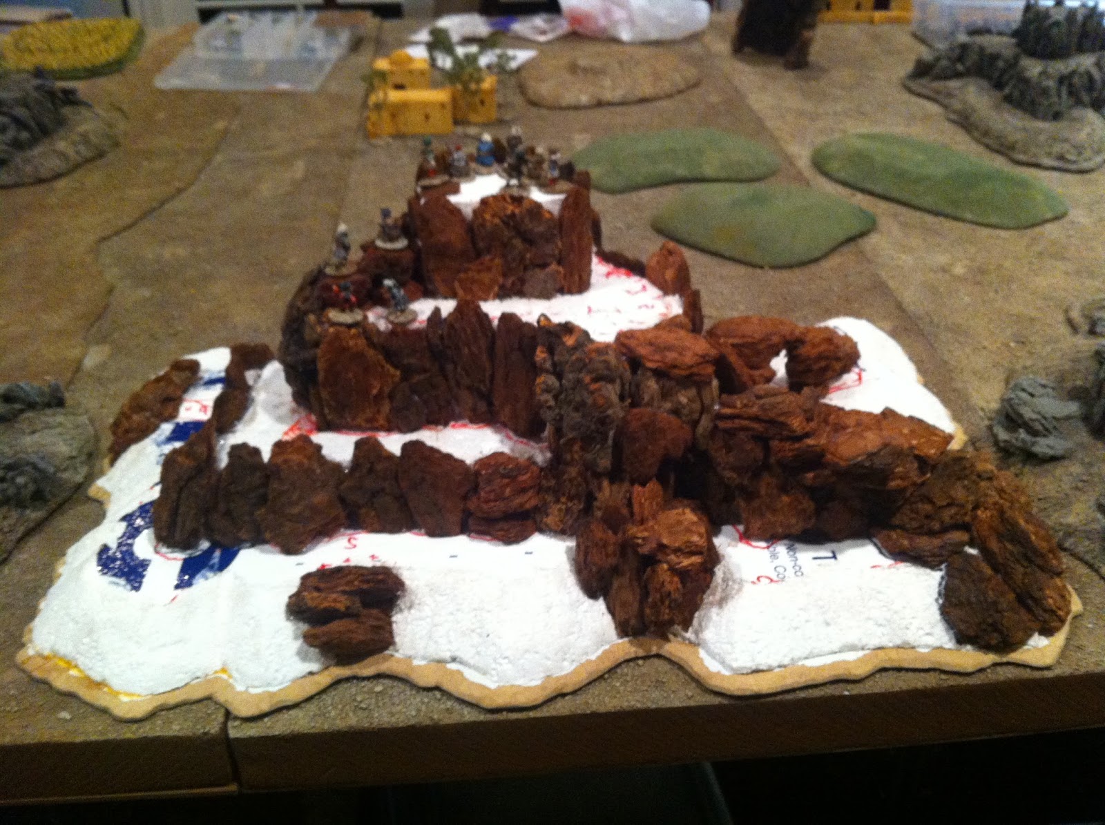 A big issue I had at this point was that I’d been dreaming of building that third rocky contour IN THE MIDDLE OF THE ONE BELOW — so as not to interefere with the movement of figures during a game by creating a “dead-end”.