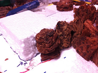 Then it was back to work on the second rocky elevation. For this, rather than piecing multiple pieces of foam together, I cut out a single tailor-made piece of foam, attached it with a combination of glue and toothpicks, then went to work hot-gluing woodchips to all its sides…