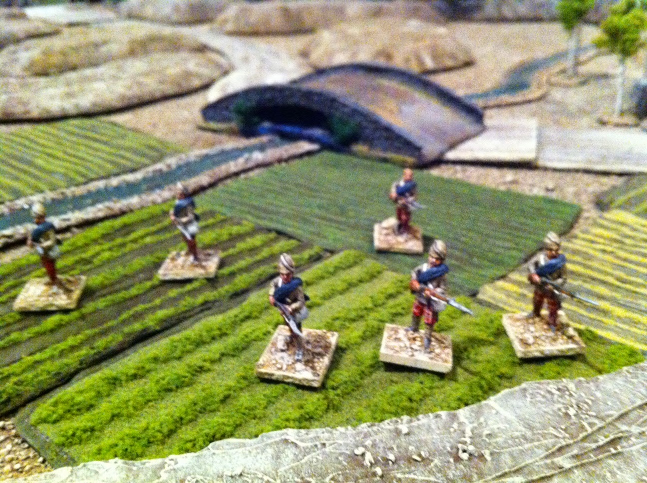 None of the contemporary histories of the battle that I’ve read make any mention of Anglo-Indian forces having difficulty traversing the walls or irrigation ditches which lined the fields, so I decided to leave the property line “dividers” out.  But I still wanted the fields themselves.  They were there, and still are there, so in order for the miniature battlefield to accurately resemble the real one, it needs to have them. I could potentially treat movement across them as open terrain, or assess a slight penalty, or even treat them as rough terrain.  My guess is I will have them assess a slight movement penalty.  In TSATF or 800 Fighting Englishmen, perhaps DROP THE LOW DIE FROM MOVEMENT ROLL.  Doing this will also give more than aesthetic purpose to the roads that wind their way through the crop-fields.