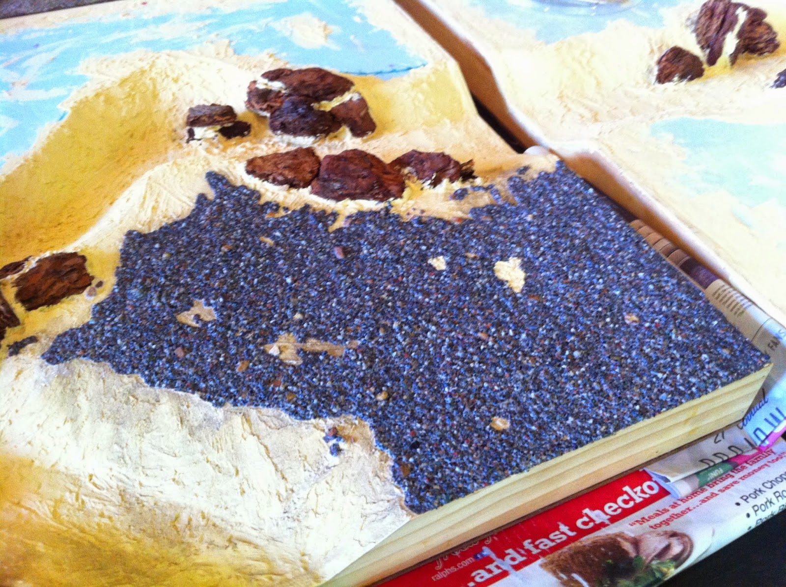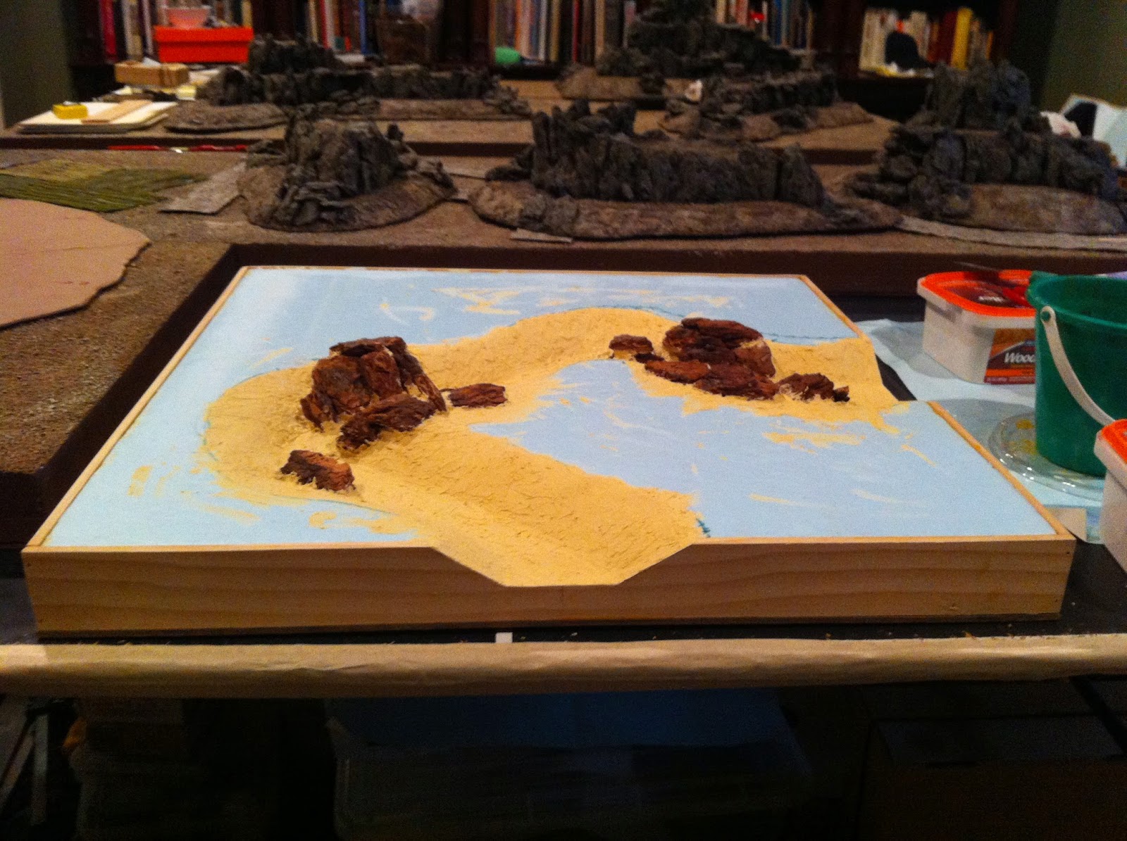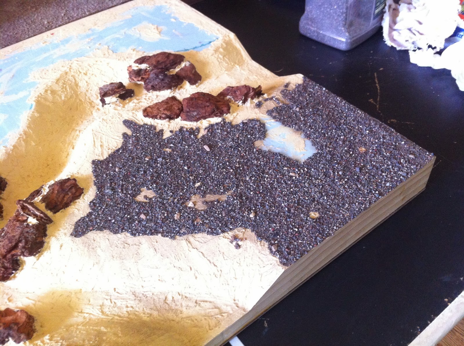 Next up the BASE COAT OF BROWN over everything, very heavily dry-brushed in the case of the previously black-coated rocks…