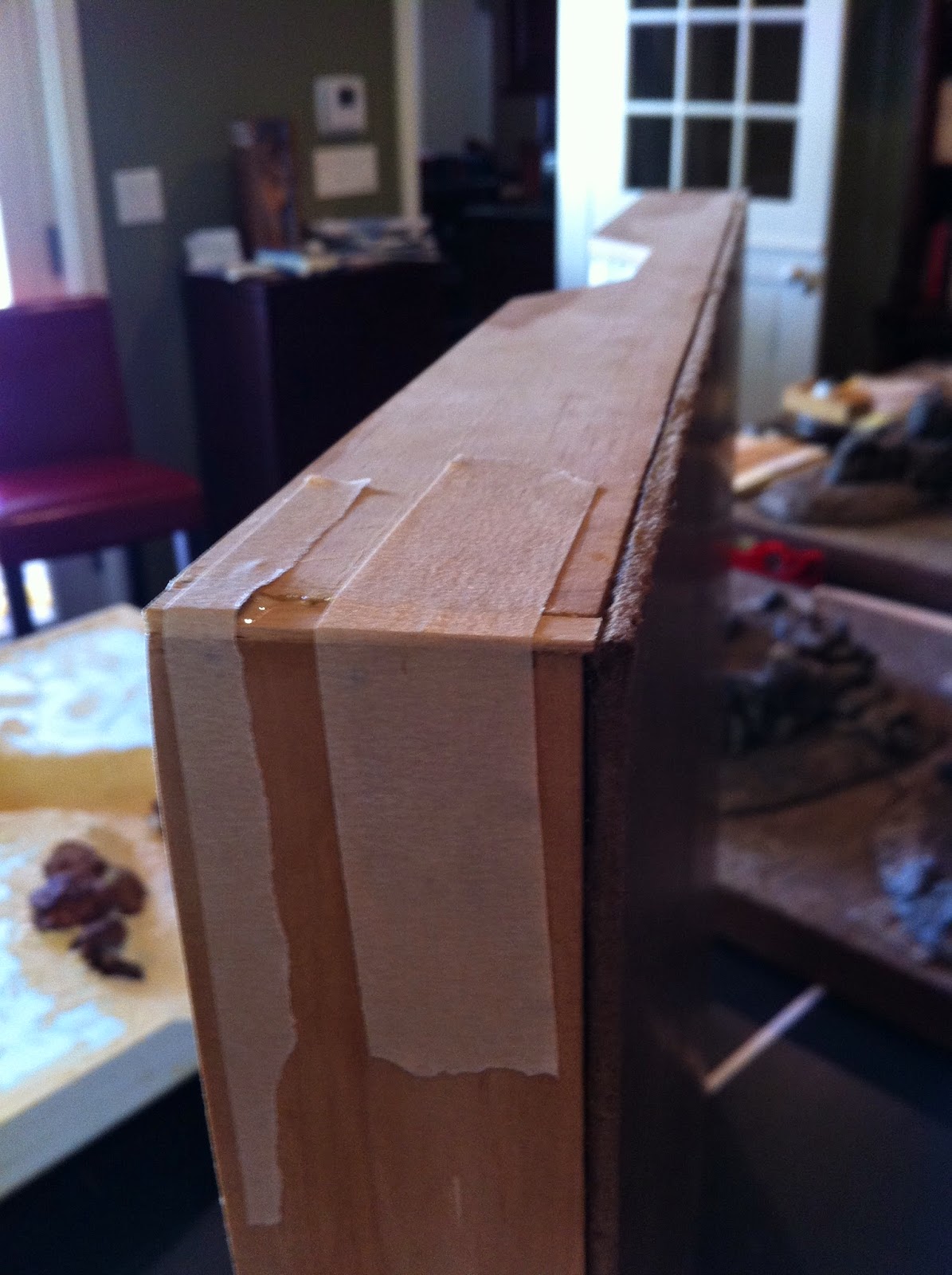 It came to my attention that the wood frame on one corner needed a slight addition in order to be truly flush.  I scrounged a 1/4″ thick coffee stirrer and went to work…