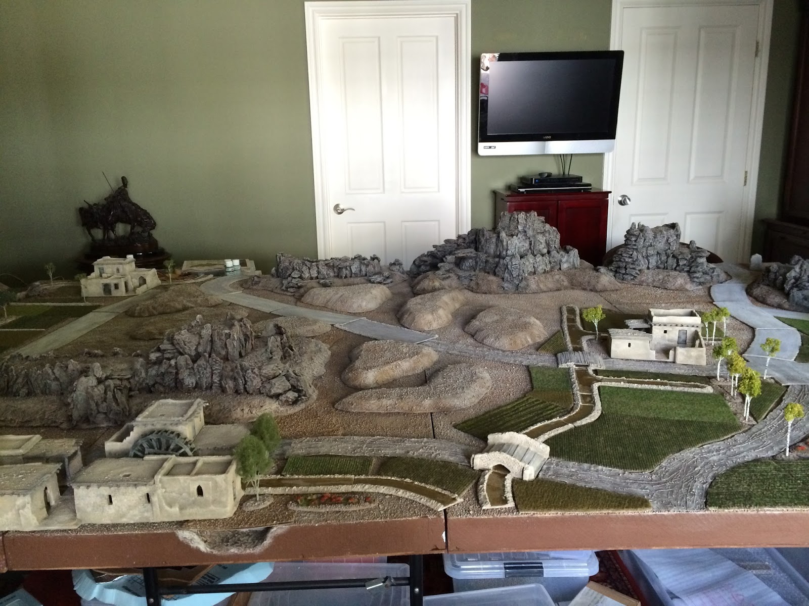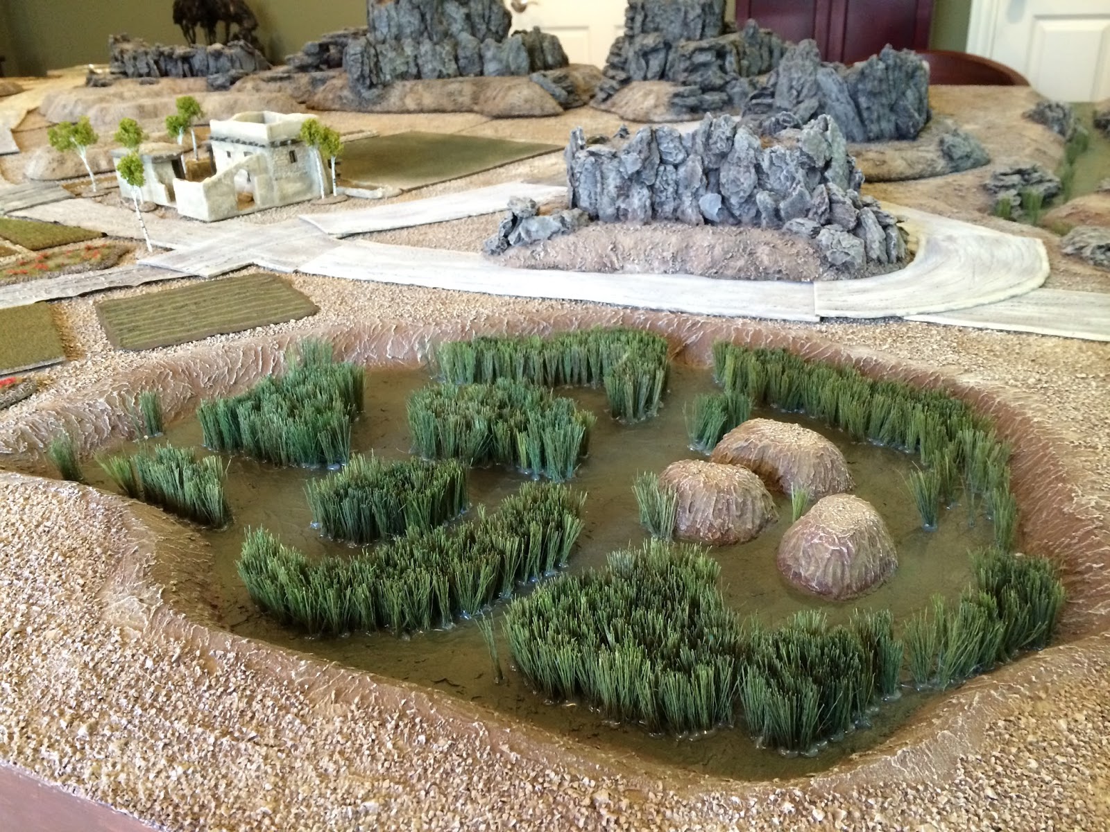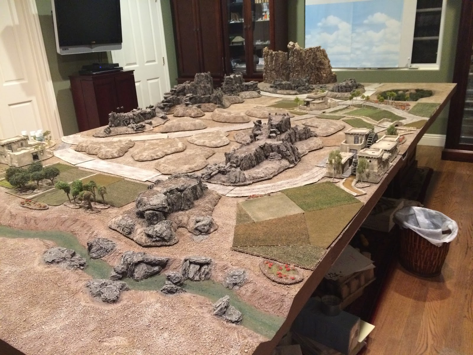 Well, I’m close to being done with my Charasiab terrain layout, very close.  It’s been a long time coming, having worked on all the elements of this set-up for more than 3 years now (?!?!?!), and of course the highlight is the trio of villages, each with their own watermill(s) and accompanying canal system made for me by the incredibly talented Chris The Model Maker.