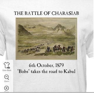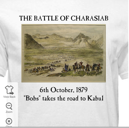 When I did my big “Maiwand Day” game, my friend Nick Stern — with help from his talented girlfriend, Joyce — created a commemorative t-shirt that looked great. This inspired me to do the same a few years later when I held a big game on the 150th anniversary of the Battle of Camerone, fought during the French Intervention in Mexico, the t-shirts for which also turned out nicely. So it’s only natural I felt compelled to create a similar t-shirt for the Charasiab game.