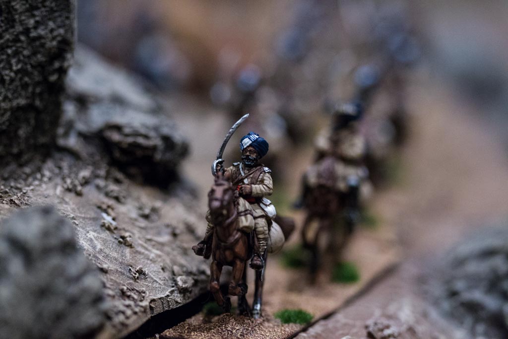 The best looking figures on the table weren’t mine but Michael Davis’s, who was kind enough to pack them up — very carefully — and bring them with him for use in the game.  Amongst these were his Perry Sudan range Bengal Lancers with their lances replaced with swords and exquisitely painted as the Guides Cavalry, seen in the pic below, who in our game played the role of the 12th Bengal Cavalry…