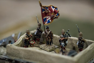 Michael’s 92nd Highlanders, also from the Perry Sudan range, played the role of… the 92nd Highlanders!  Here they are joined by a standard-bearing Ensign from my own 66th Regt., as Michael requested a Union Jack of some kind be planted on the rooftops to signify his troops having taken possession of Khairabad Village and — despite being one of the Afghan commanders — I accomodated him…