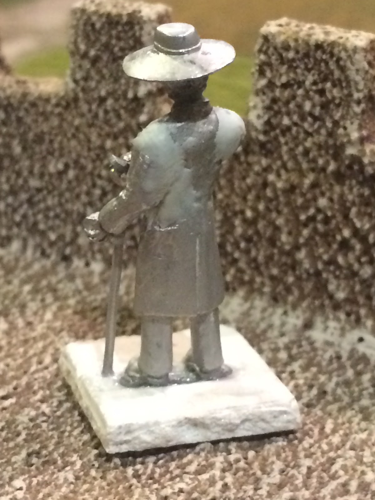 I looked around online for Victorian and/or Old West civilian figures to use, but most all of the ones with walking sticks held them in their right hands, and for some reason most all the ones with pocket watches held them in their left hands. Finally I got my hands on a collection of those old Foundry Victorian and Old West civlians which I thought could work — one for the body, one for the hat, one for the left arm with the walking stick… but there was still one problem: they were all too small. Placed beside the Perry Highland officer, they were physically inferior, which just didn’t work with the whole point and feel of the image, at least for me.