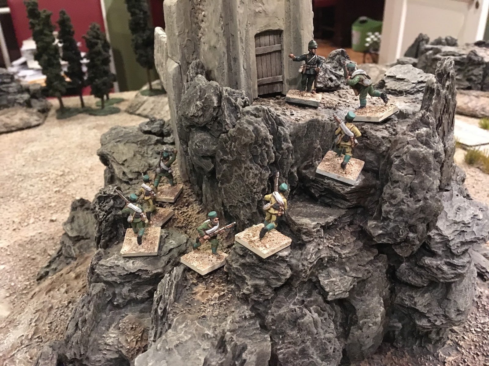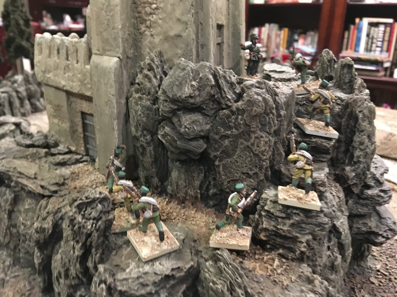 Predicting the other 10 Tribesmen — probably armed with rifles — would be hiding across the road on the Tower Mountain, the Gurkhas set up astride the road itself, in postion to potentially bring fire to bear at either flank, though with the Tribal Swordsmen so close, this time they went into CLOSE ORDER, as a number of them could not fire anyway as they’d spent the turn carrying wounded comrades, and if the Swordsmen did charge, this would afford the defending Gurkhas a +1 melee modifier…