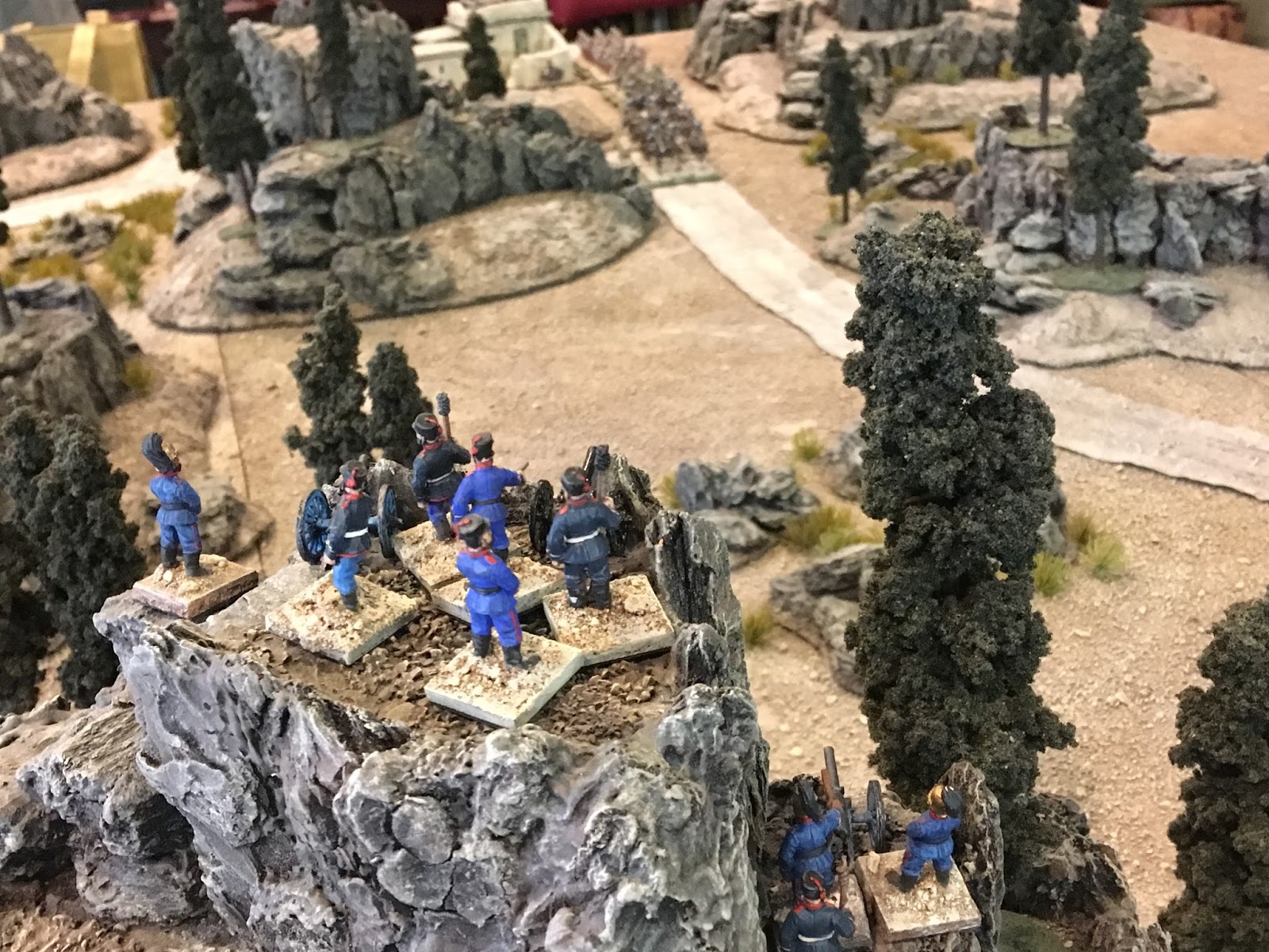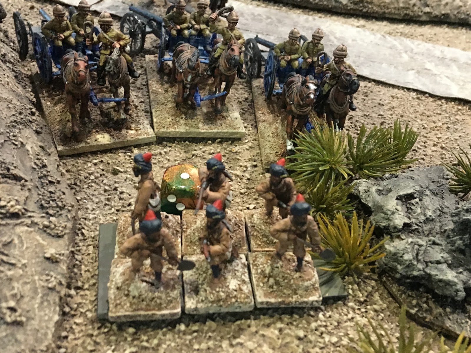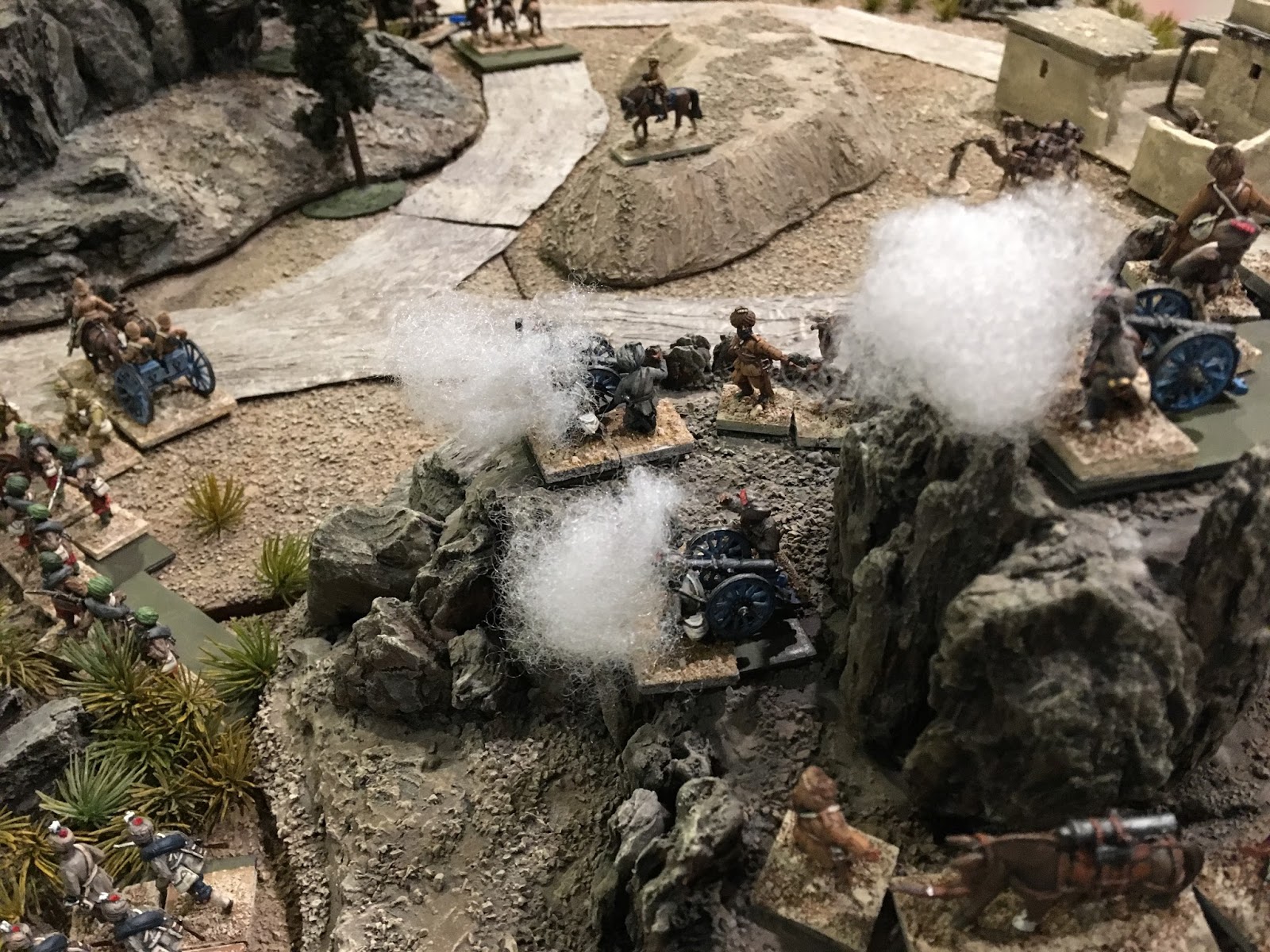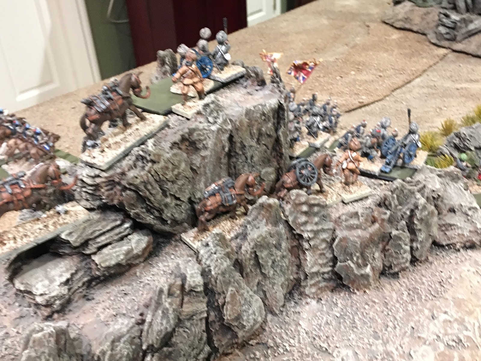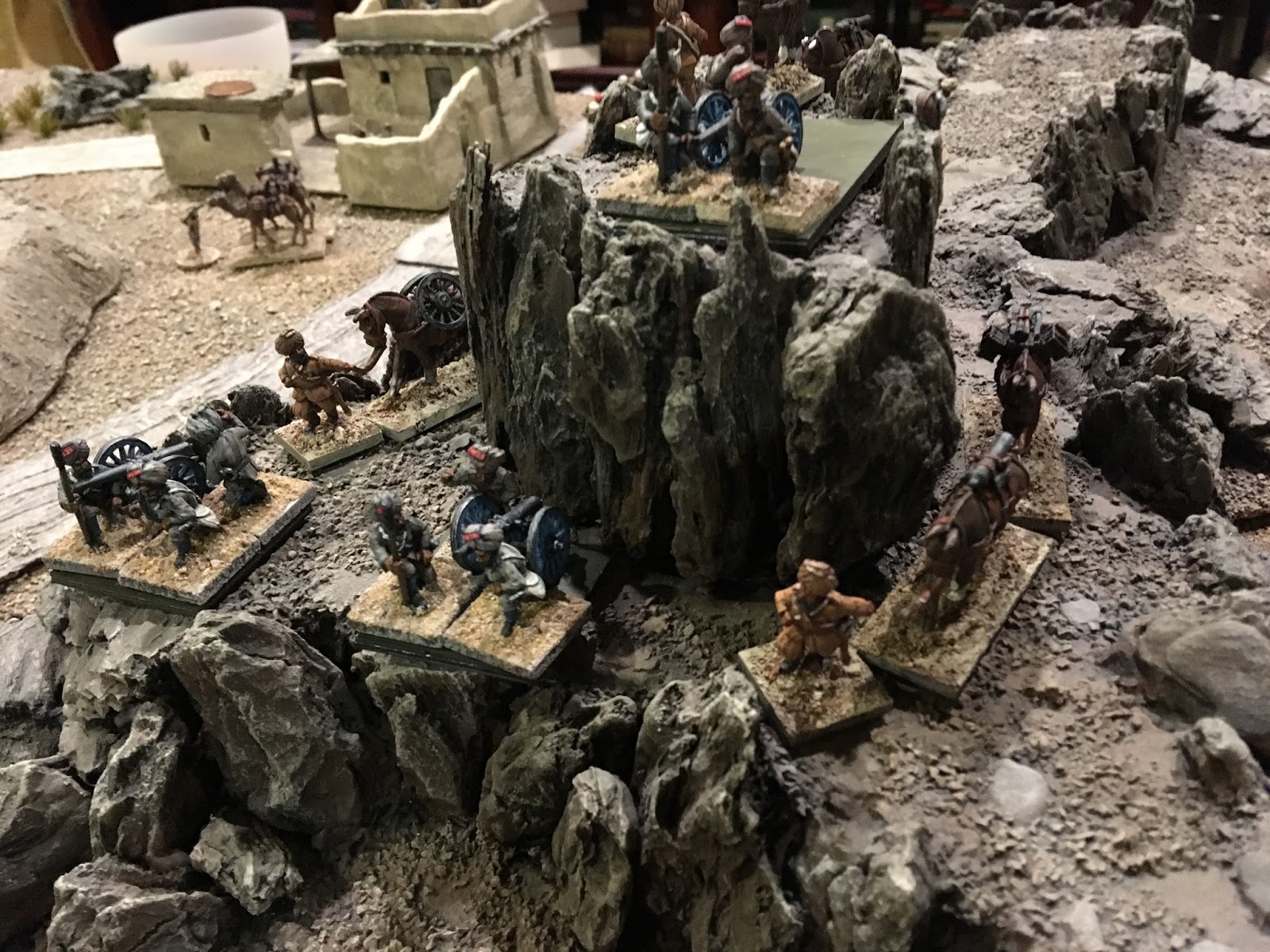 Battery of Afghan regular artillery field guns ensconced atop low sandy hill towards the far North-West corner of the table…