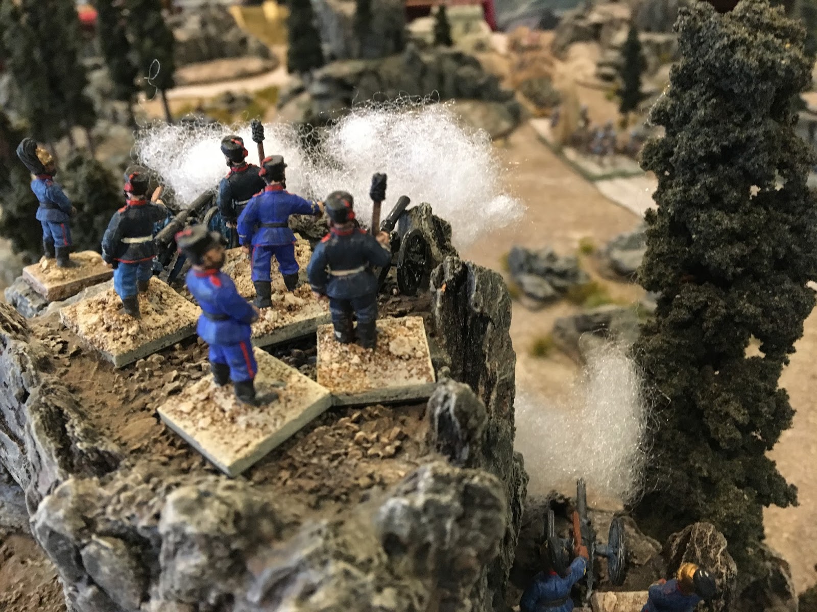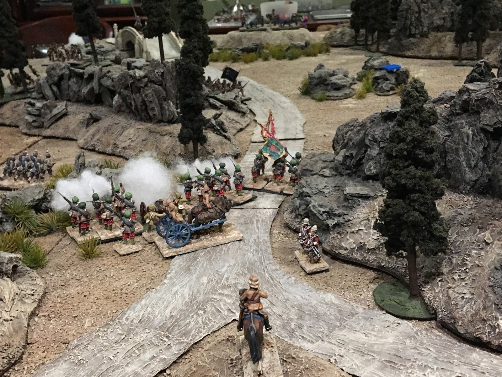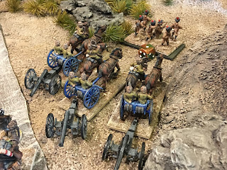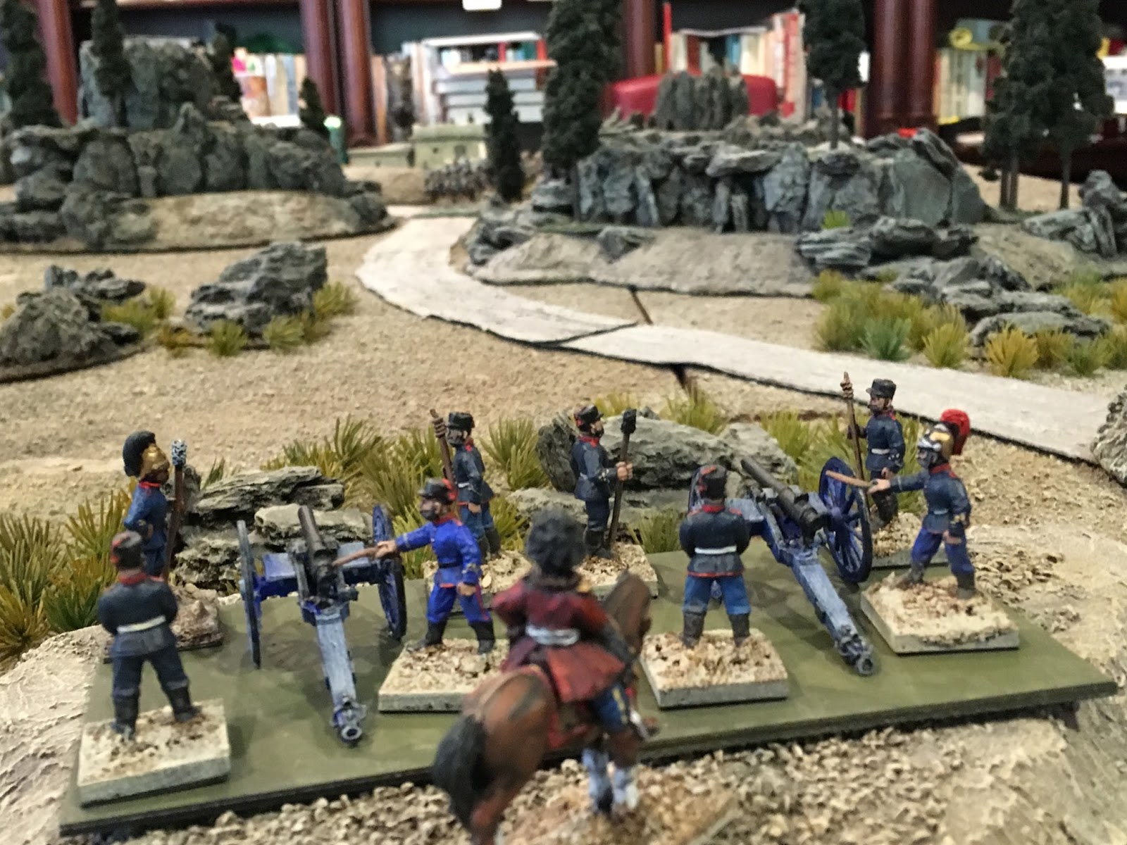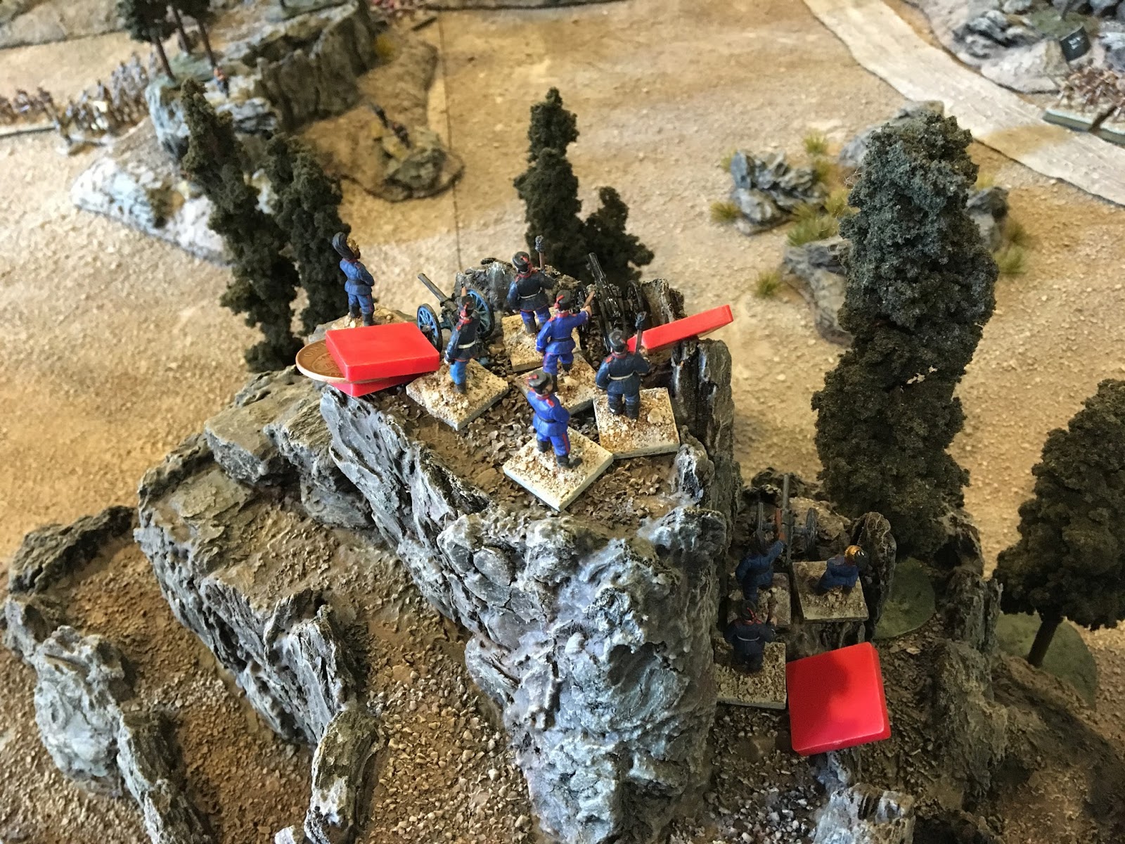 Battery of Afghan regular artillery field guns ensconced atop low sandy hill towards the far North-West corner of the table…