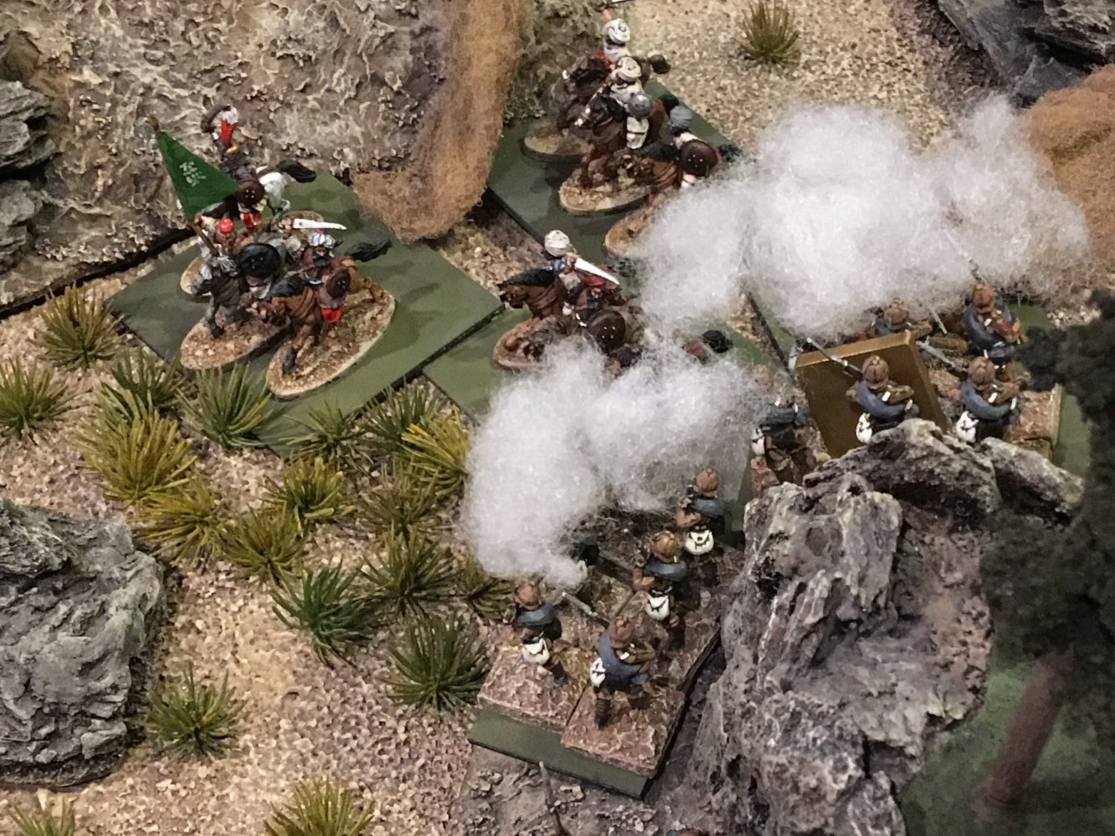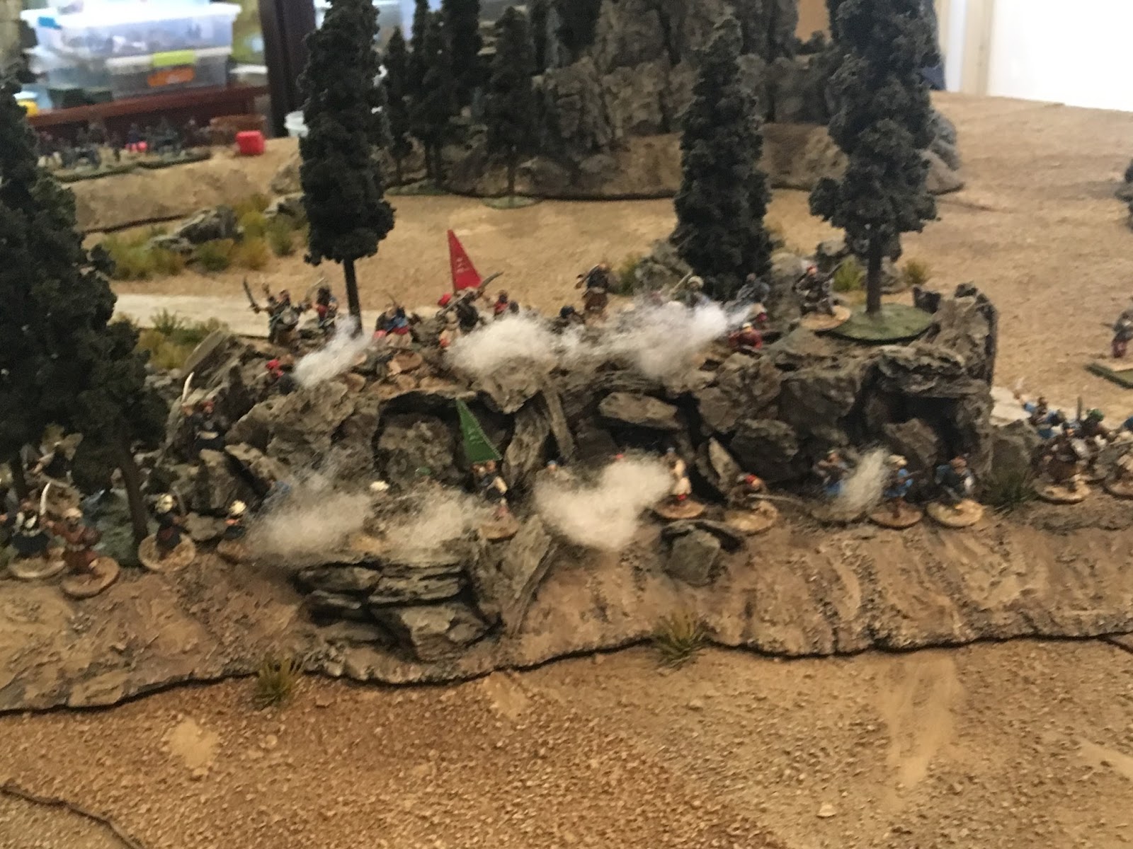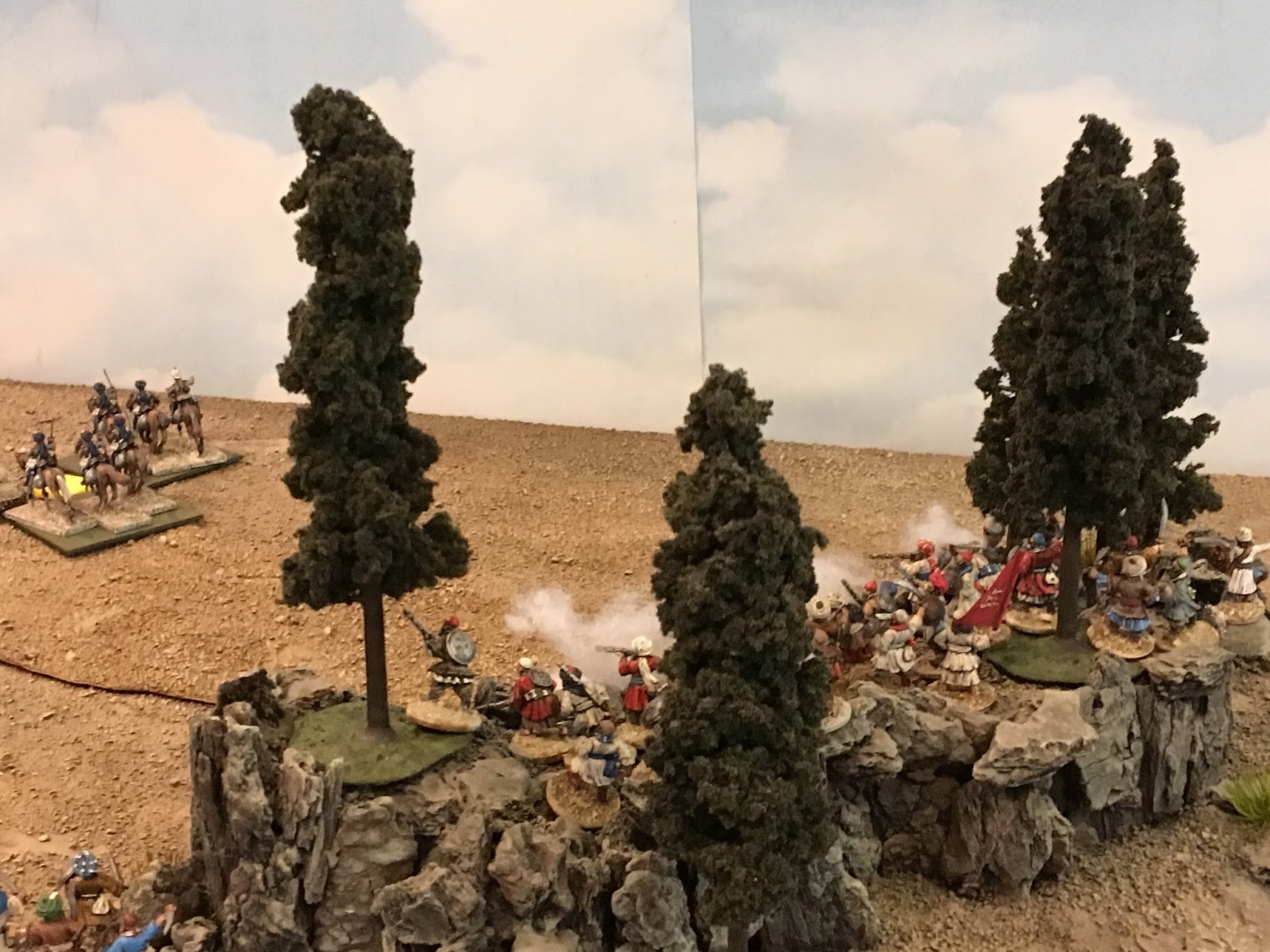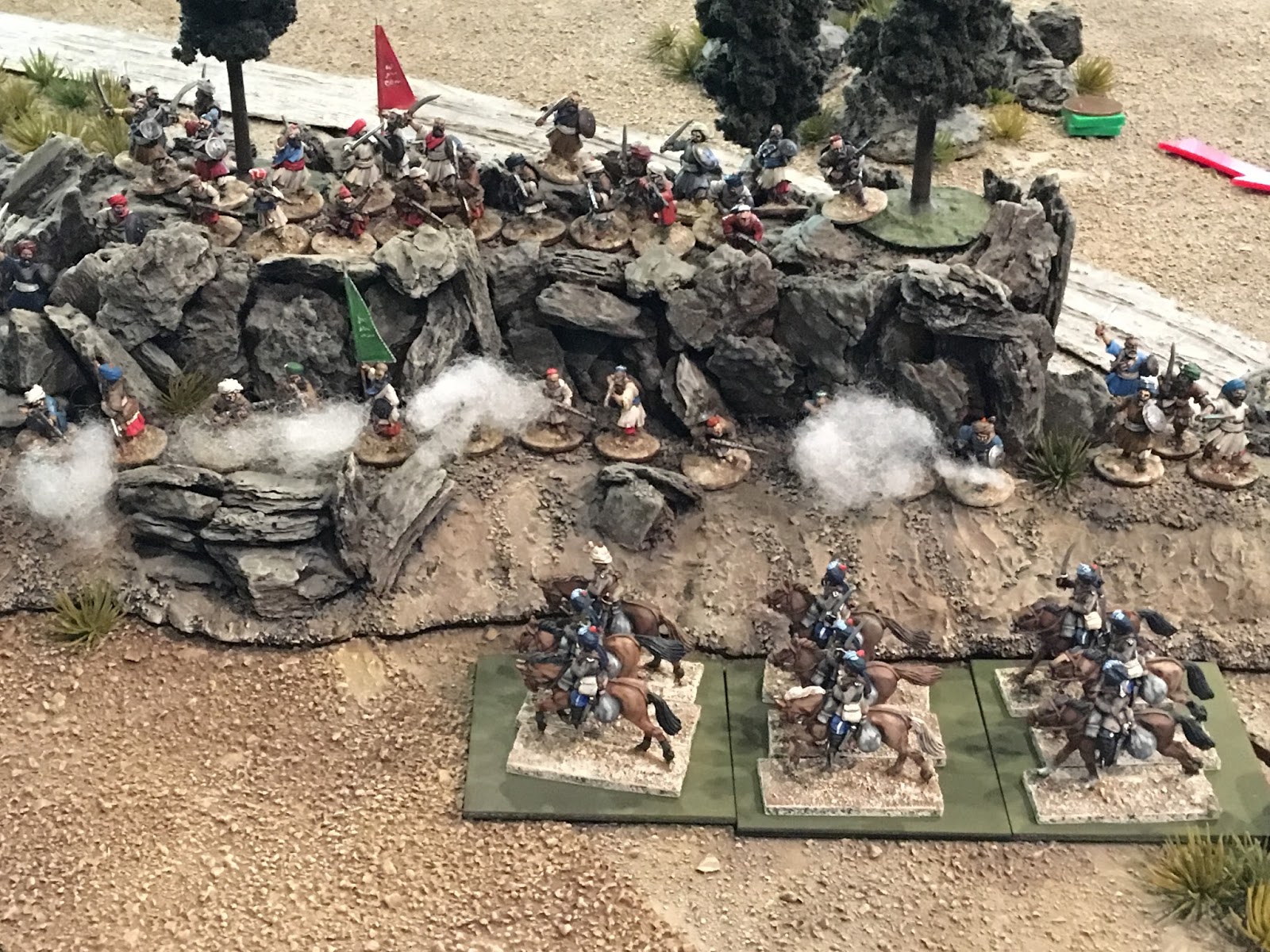 Yorks & Lancs now ensconced on the small rocky hill open fire on the Tribal cavalry…