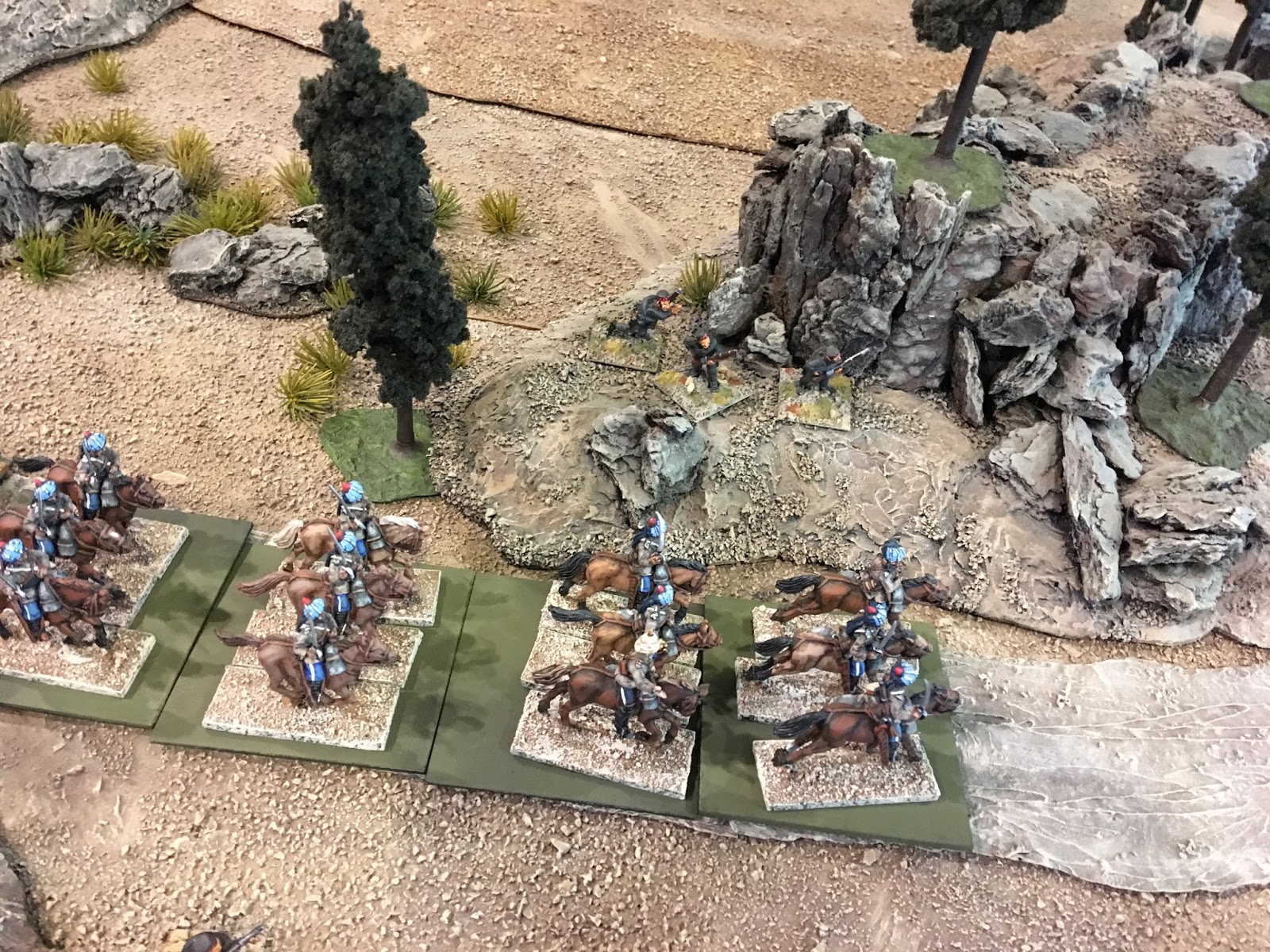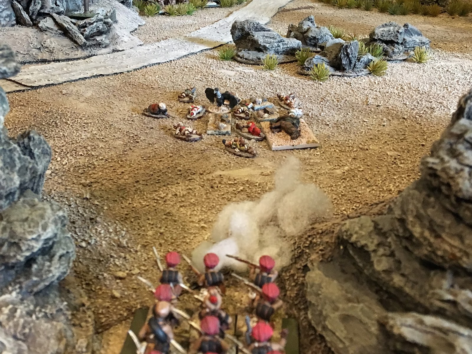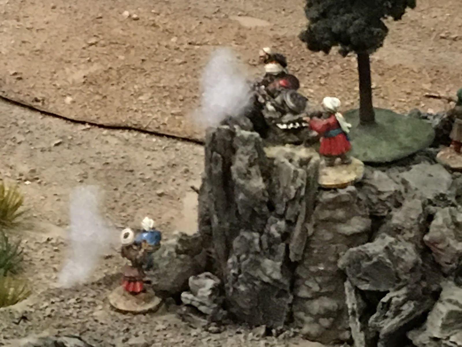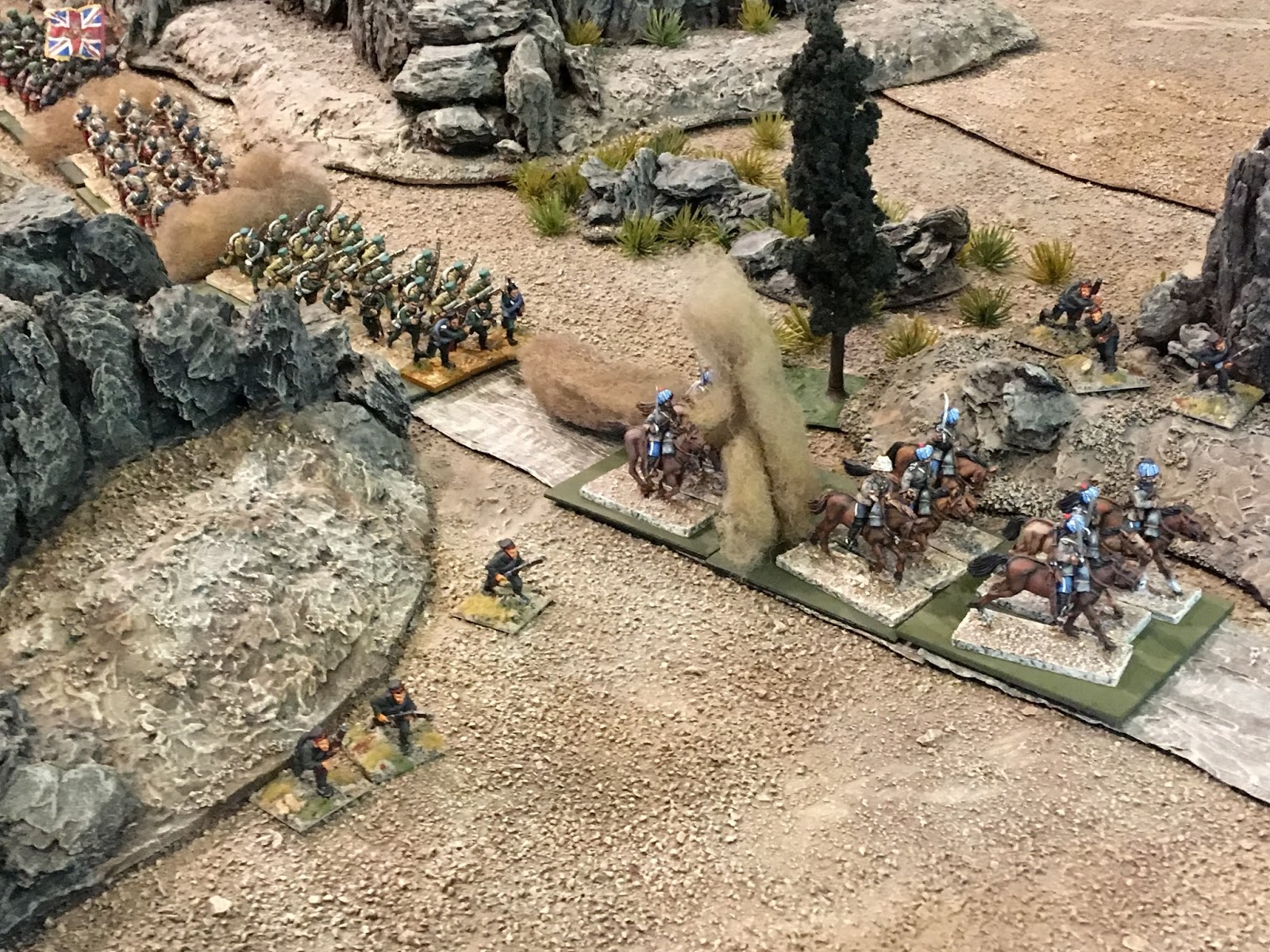 Yorks & Lancs now ensconced on the small rocky hill open fire on the Tribal cavalry…