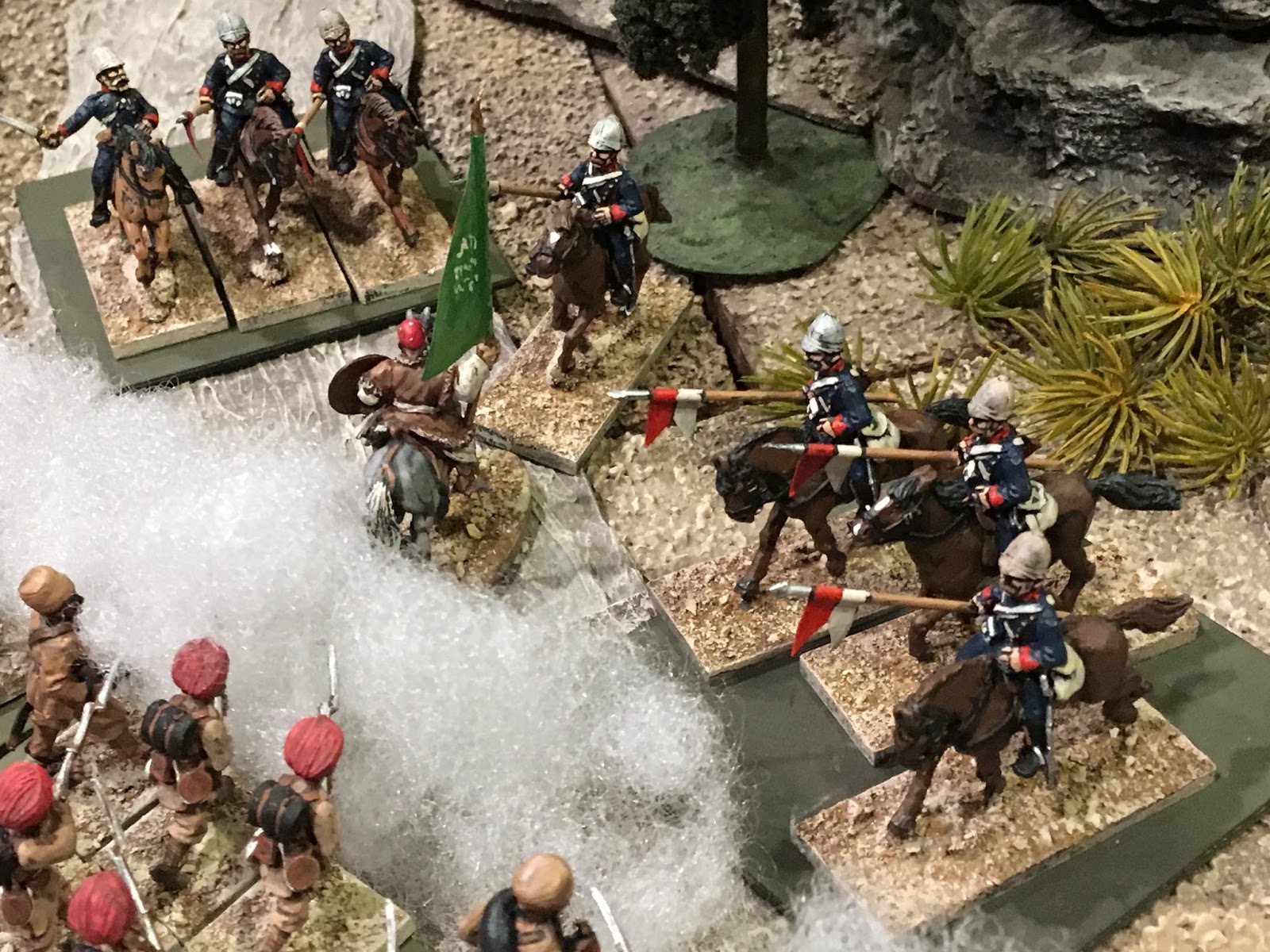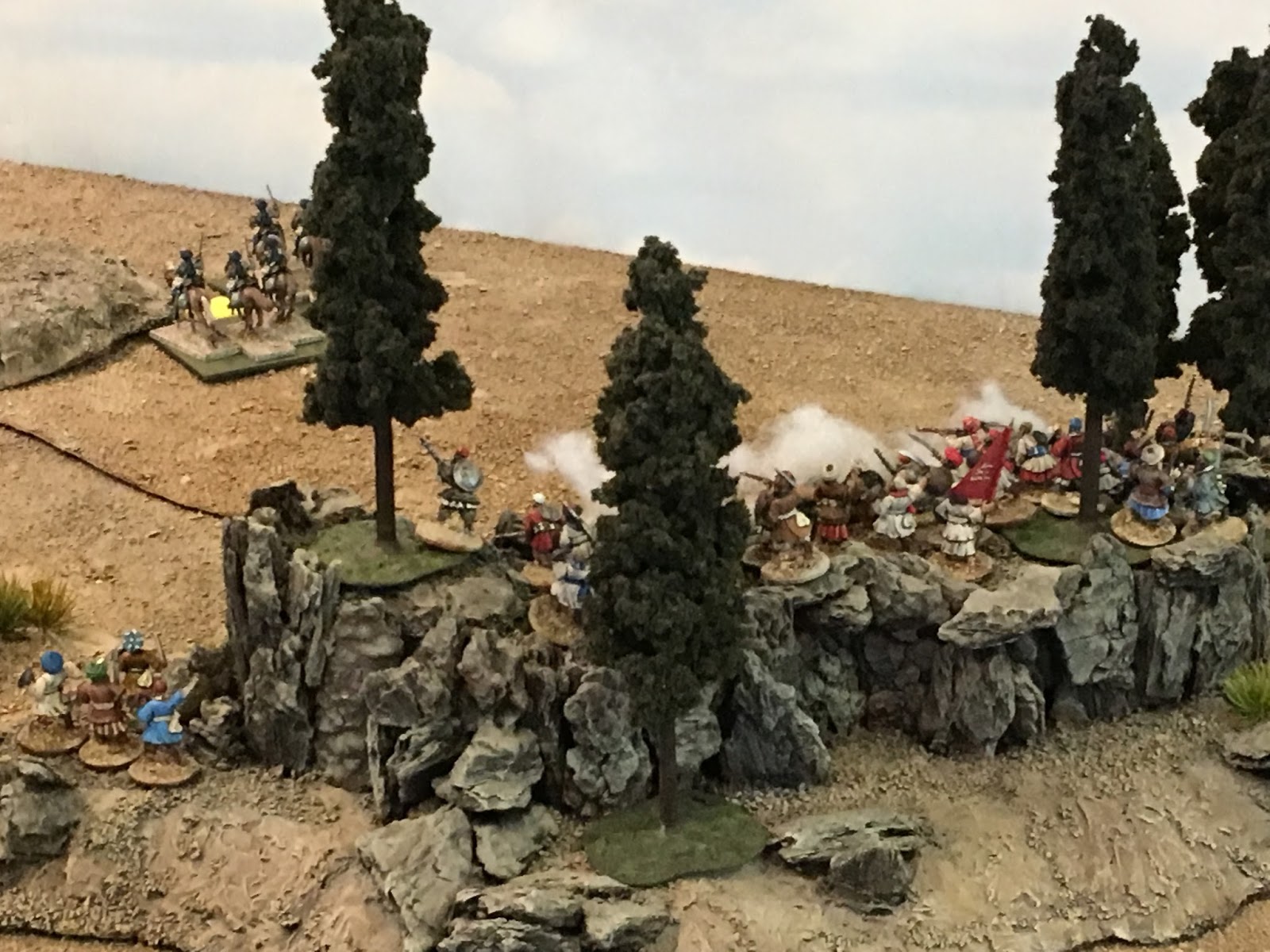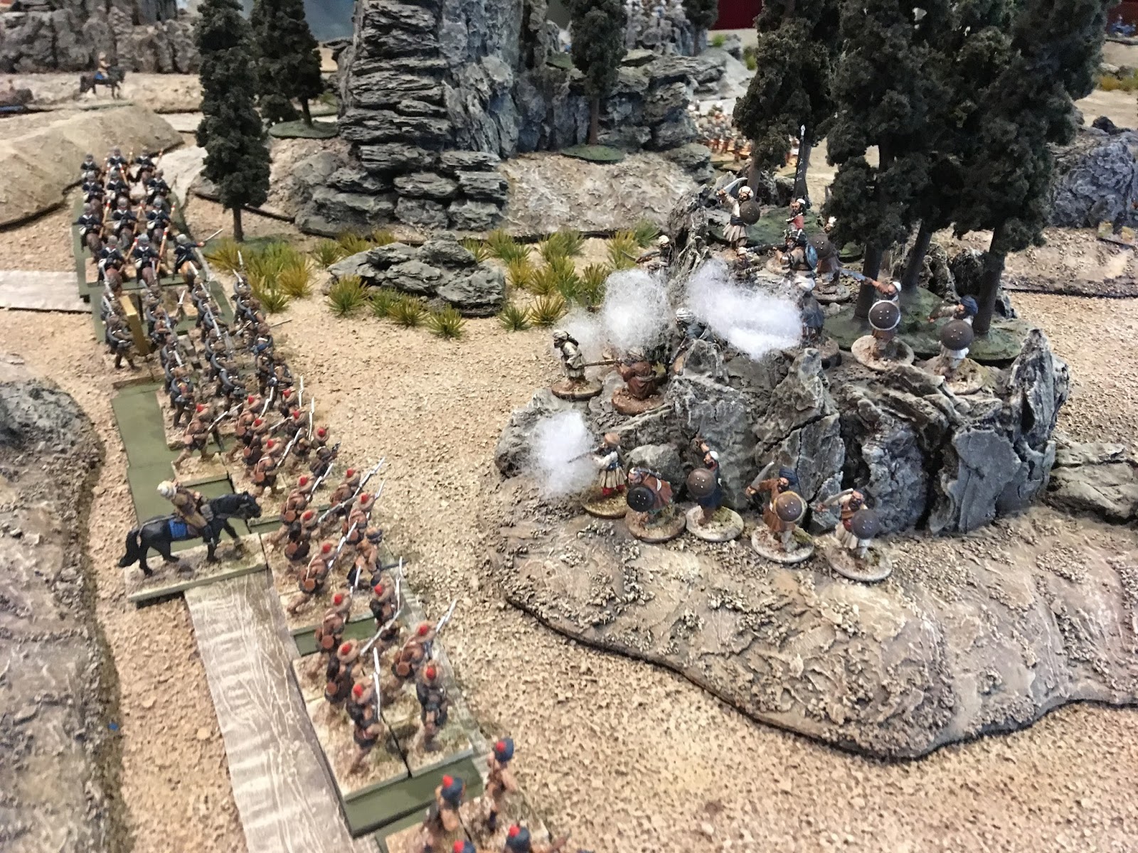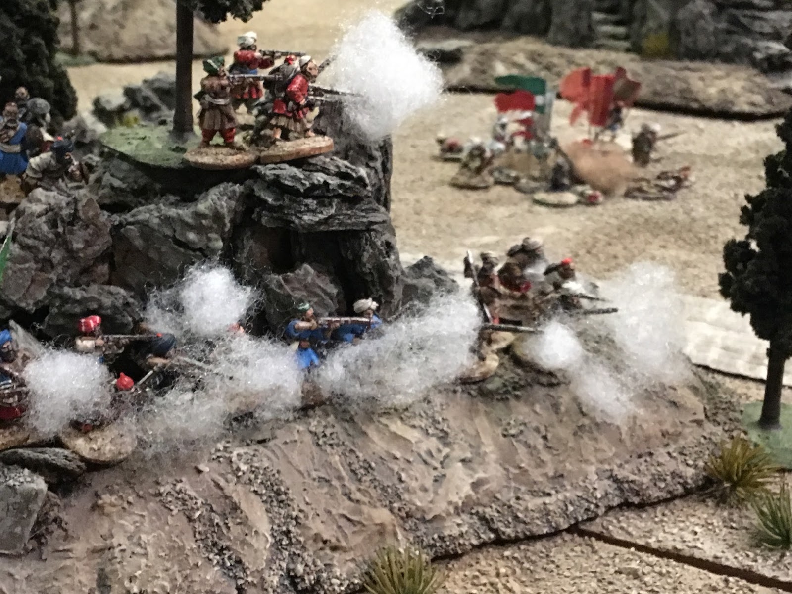 Yorks & Lancs now ensconced on the small rocky hill open fire on the Tribal cavalry…