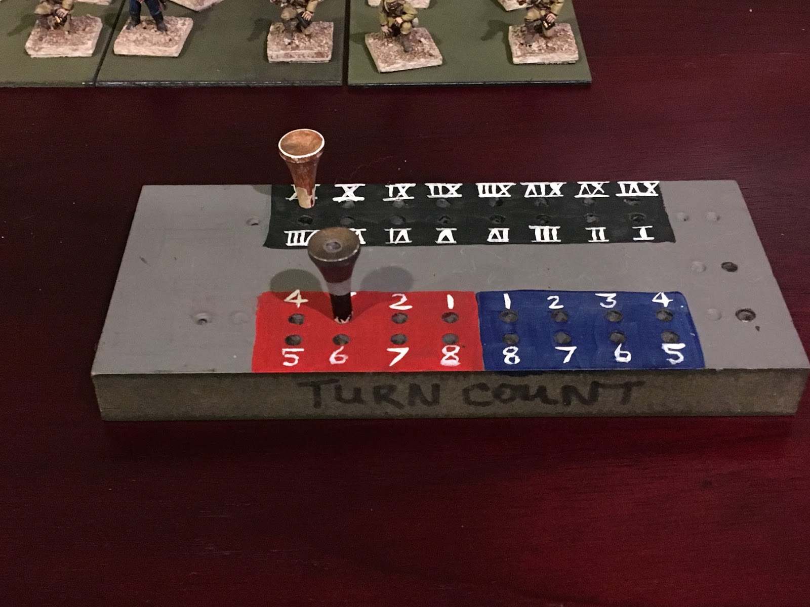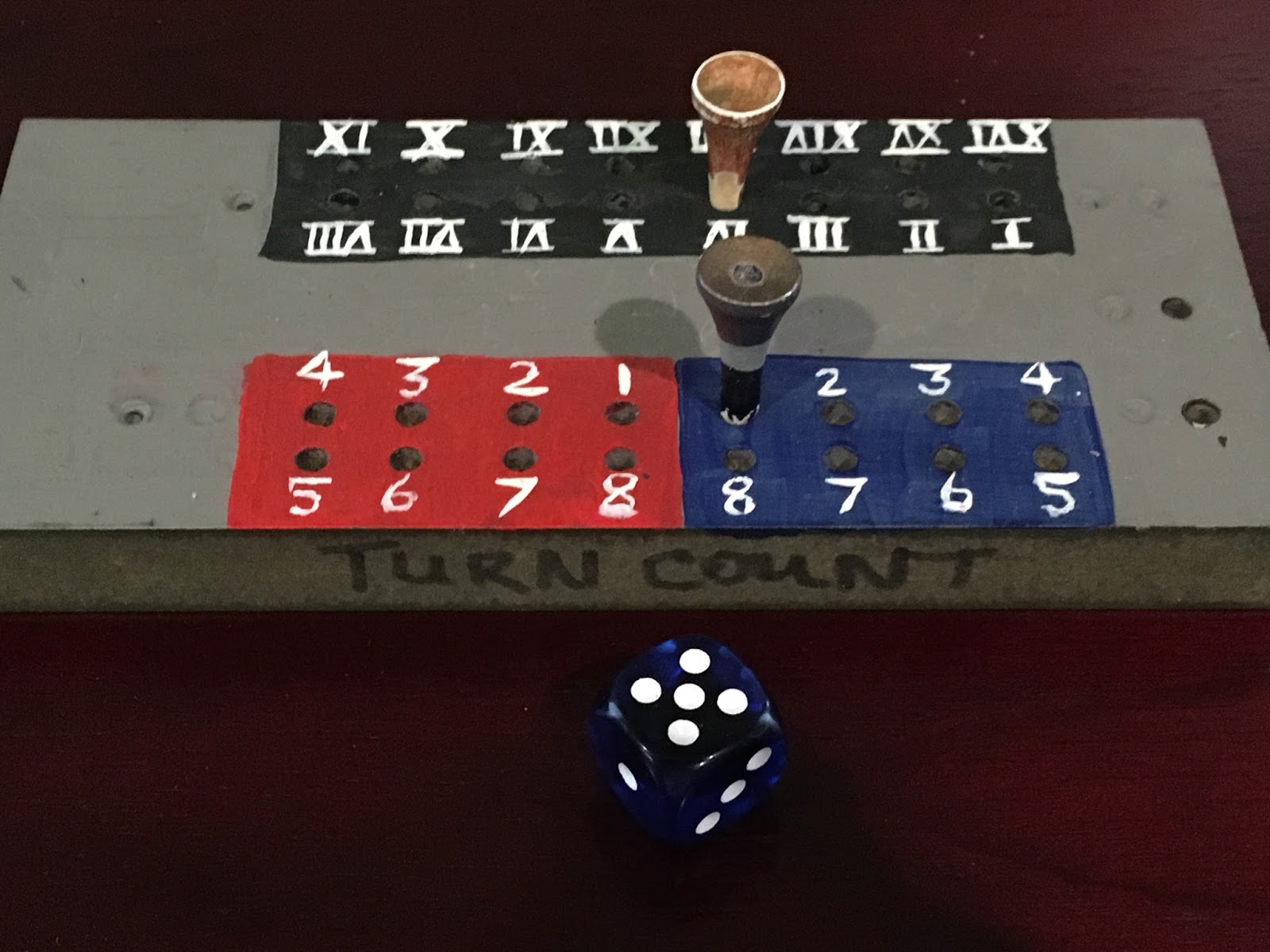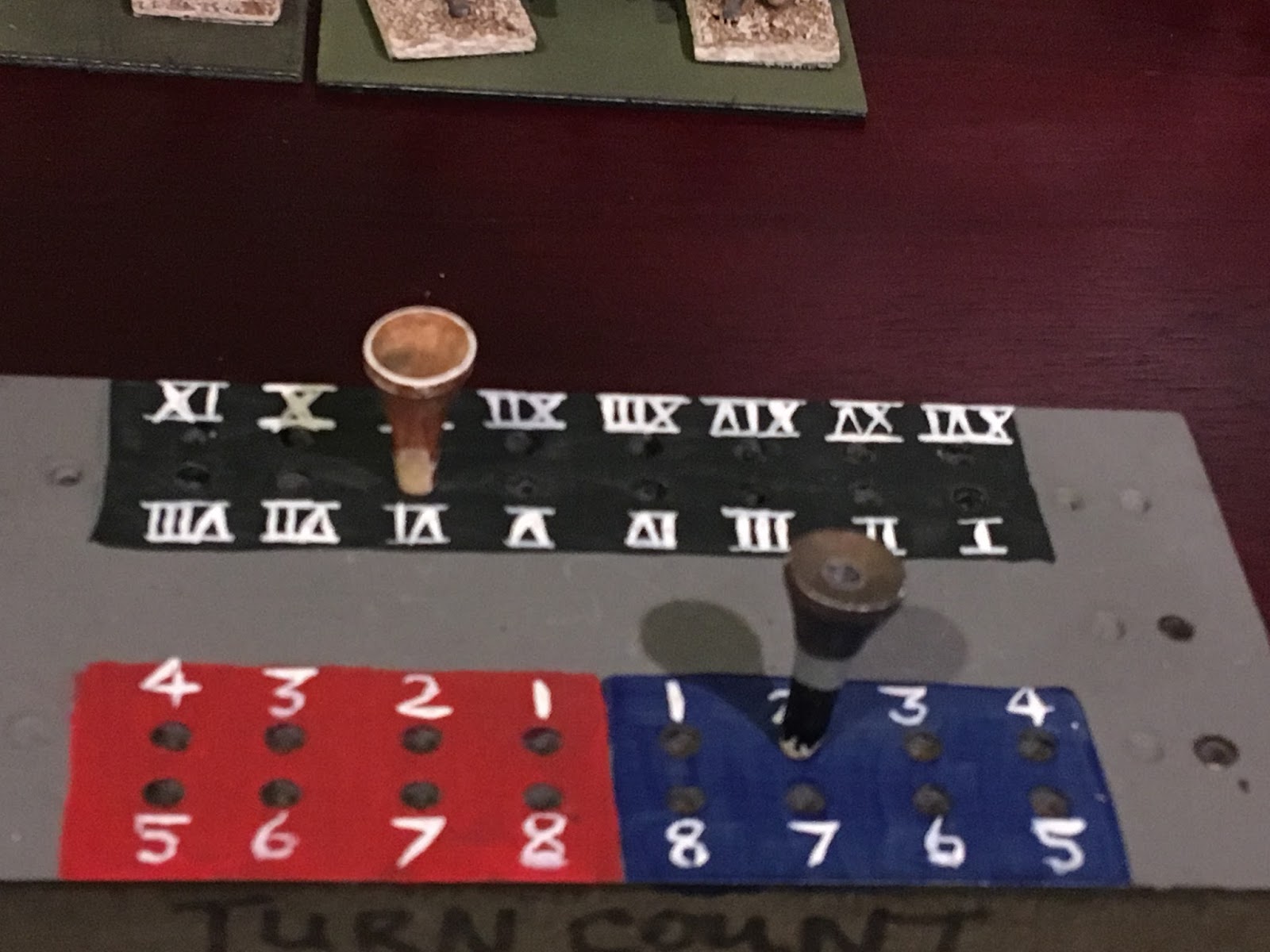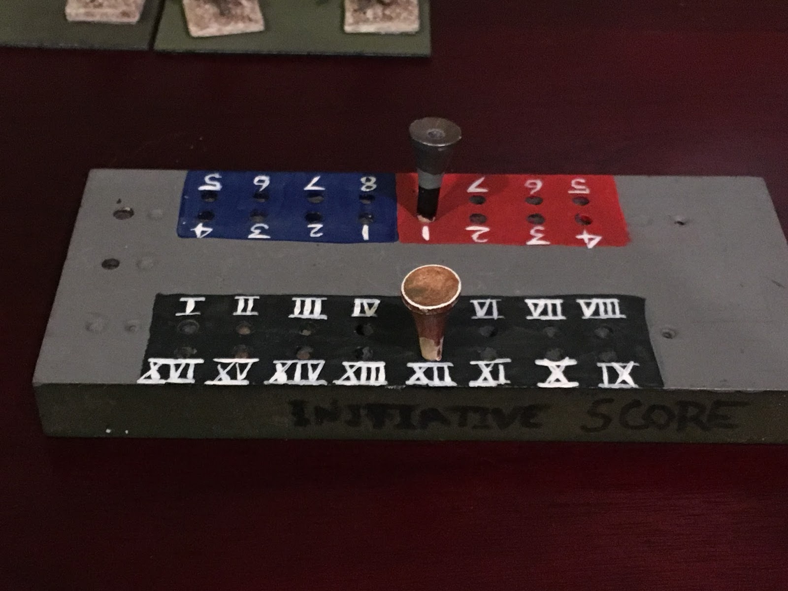 Cribbage board customized for use with “Fire & Maneuver” rules: the Arabic numerals marked on RED & BLUE sides denote INITIATIVE BONUS added to that side’s INITIATIVE ROLL that turn, based on that side having achieved meaningful objectives, such as BREAKING AN ENEMY UNIT or TAKING POSSESSION OF A KEY TERRAIN FEATURE. This device/mechanic encourages success in battle to lead to more success, but still does not guarantee of victory, since the tables can quickly turn…