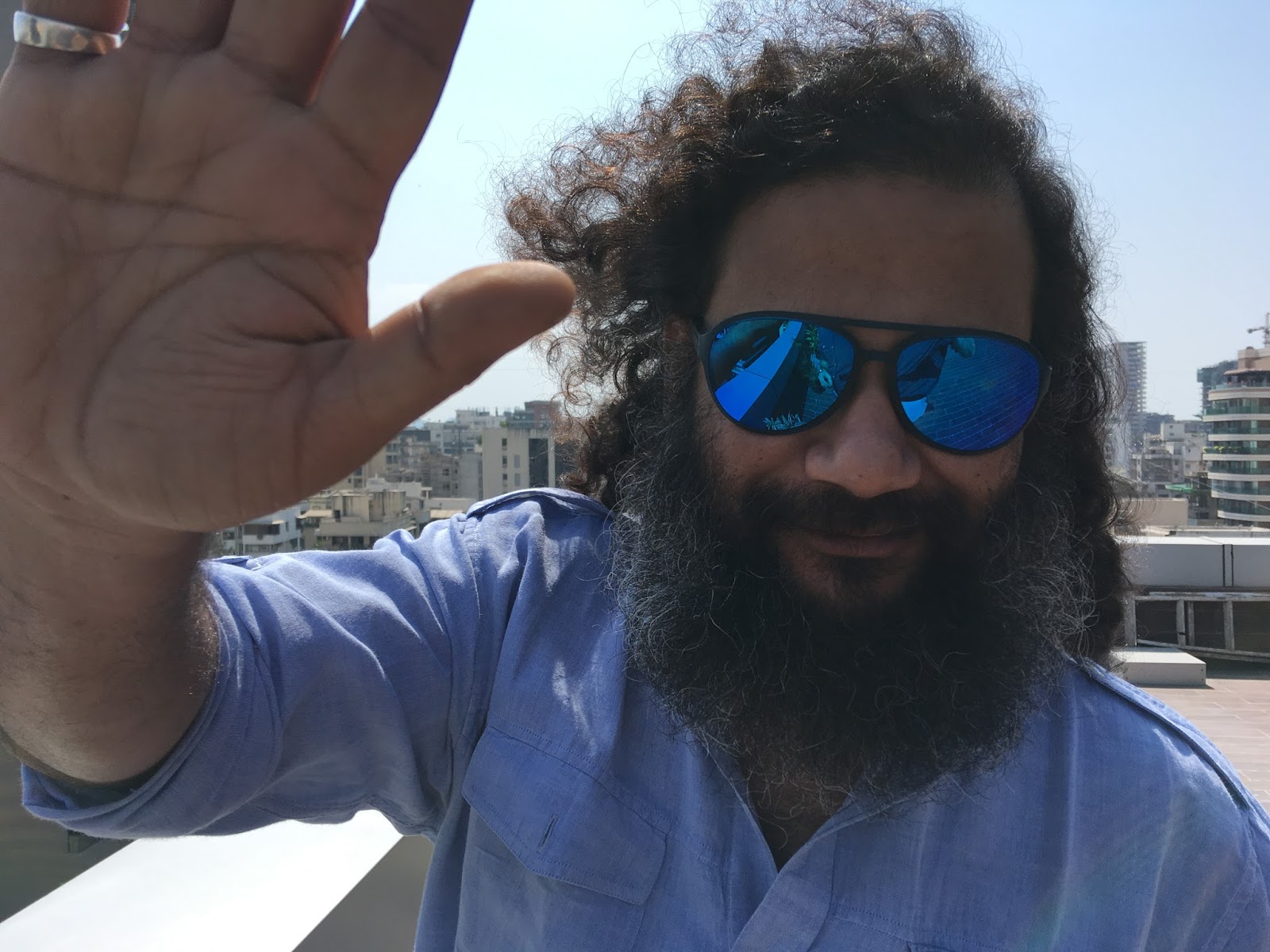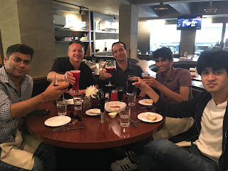Our team in Mumbai: my partner, myself, 3 top-notch screenwriters (Bhavani Iyer; Mayank Tewari [big beard] & Siraj Ahmed [trimmed beard]), 1 top-notch production executive (Gaurav Verma in glasses), 1 boy-wonder novelist (Bilal Siddiqui – young enough to be anyone else in the picture’s son!) and — in sunglasses at the center — Bollywood superstar Shah Rukh Khan AKA: SRK…