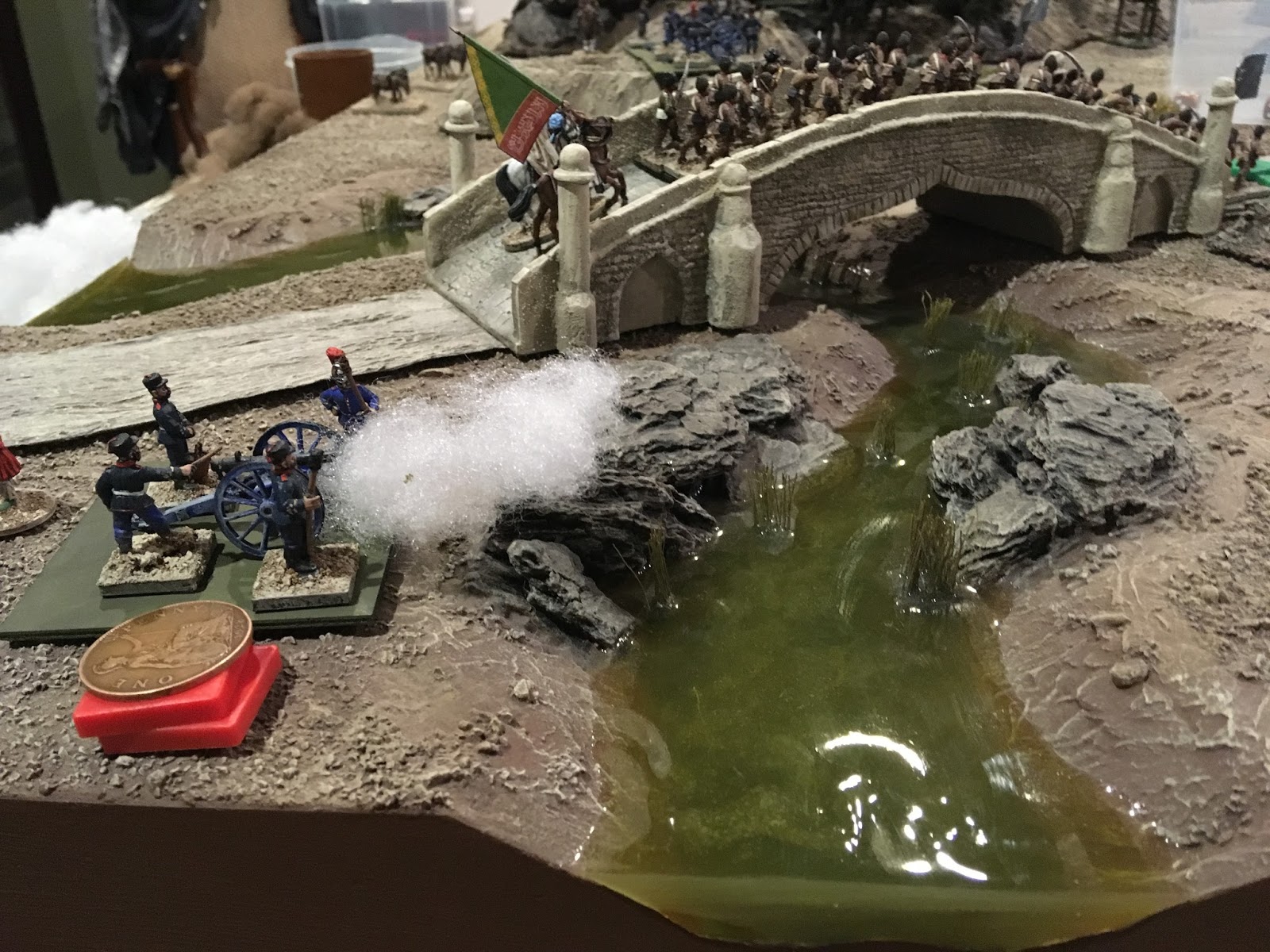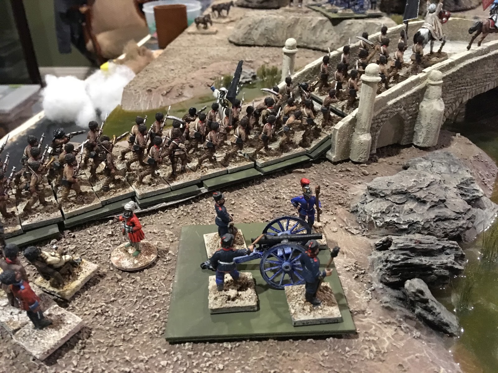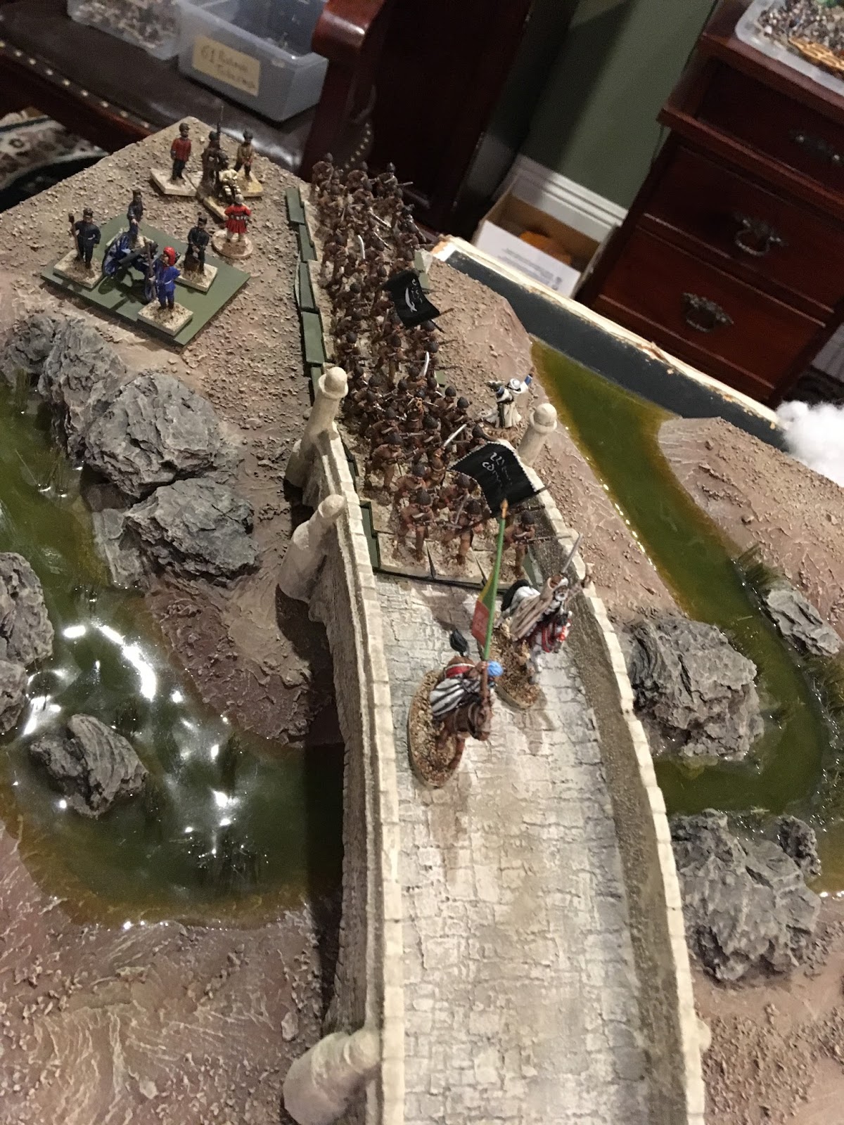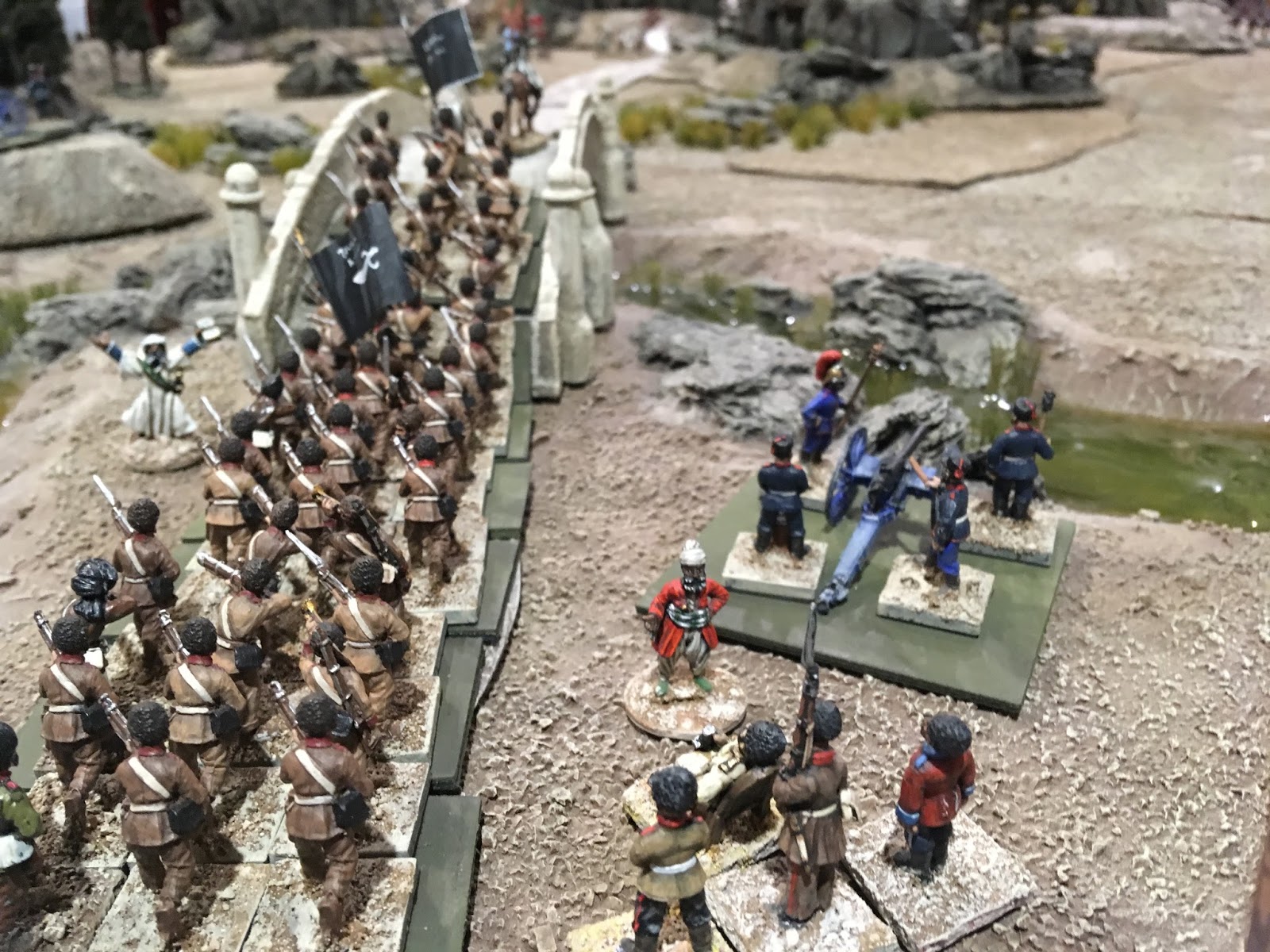 The Afghan Regular Infantry finally manage to find their way to the bridge over the Logar River (finally made the die-roll required to appear) and march South to the sound of the guns…