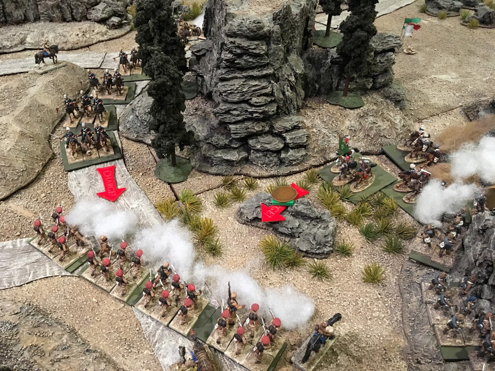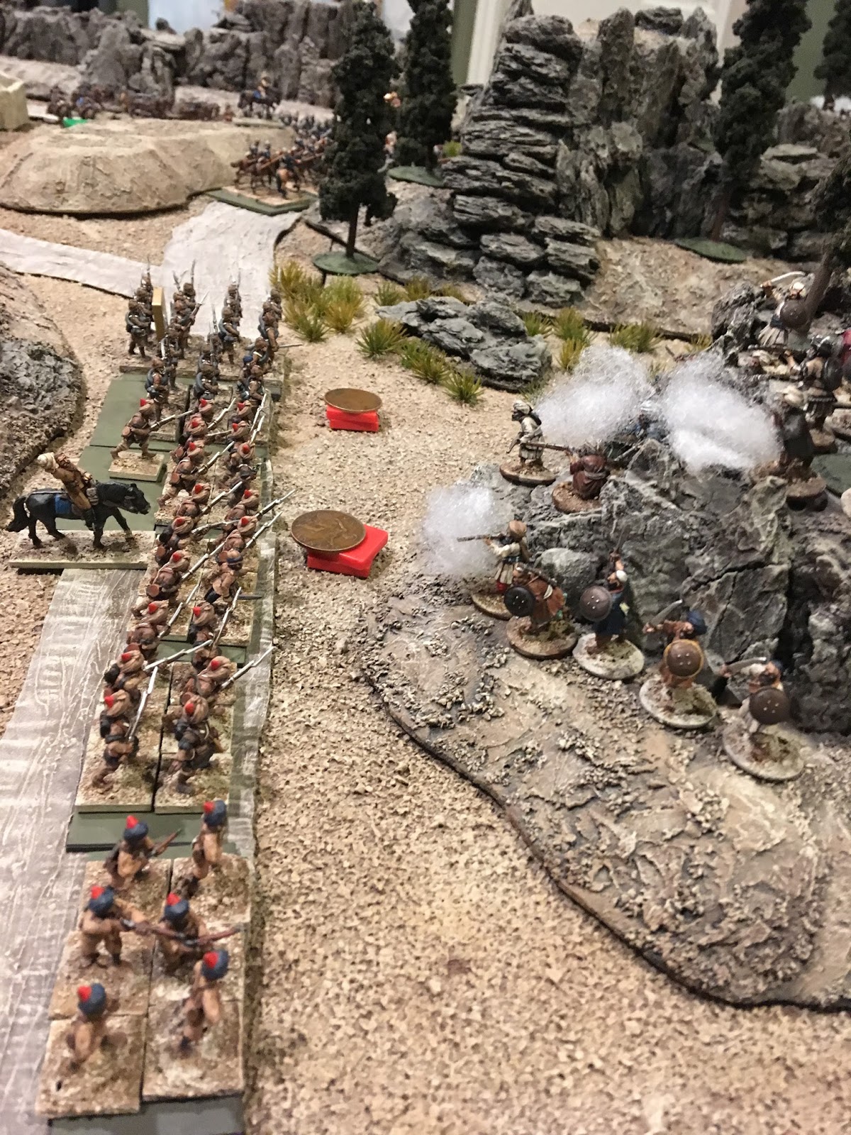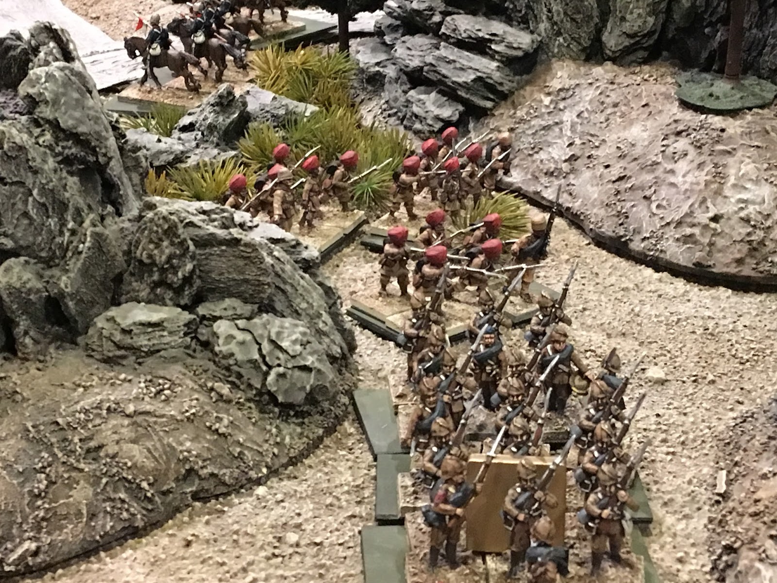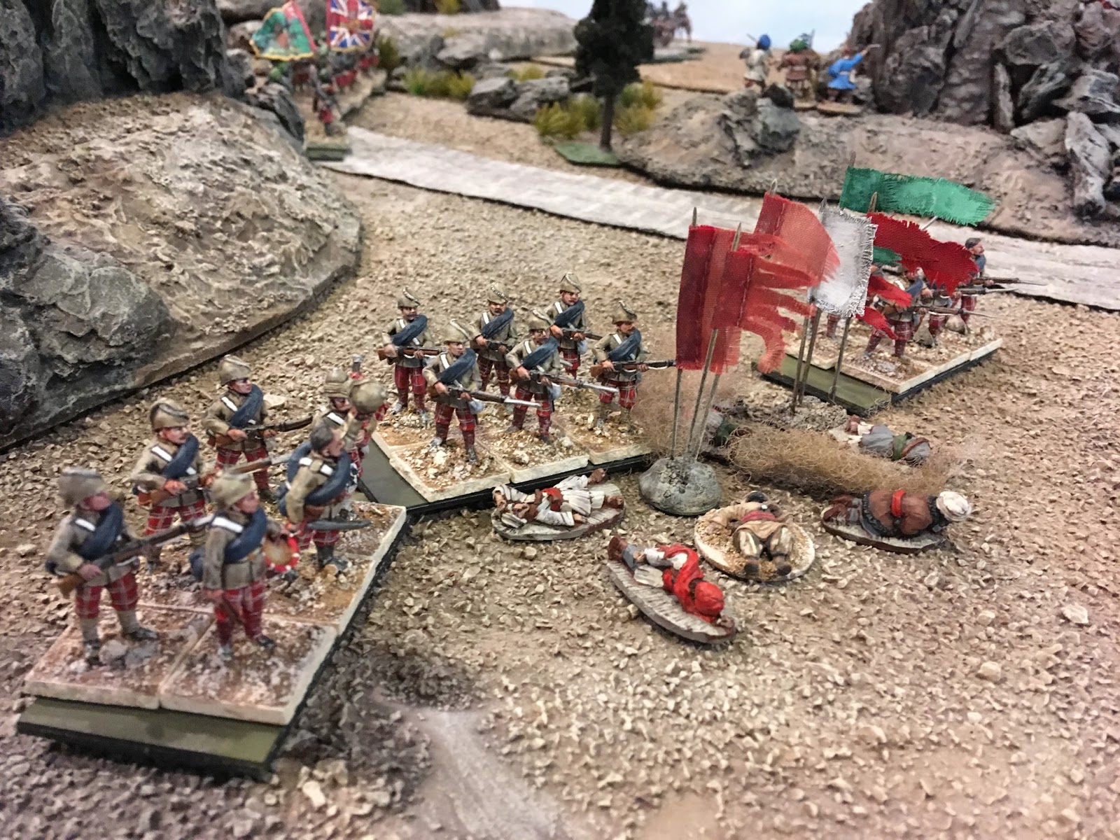 Back in the middle of the battlefield Jacob’s Rifles remain astride the road firing at the Tribesmen on the narrow rocky hill to their front while the Punjabis advance across the ridge to their left…
