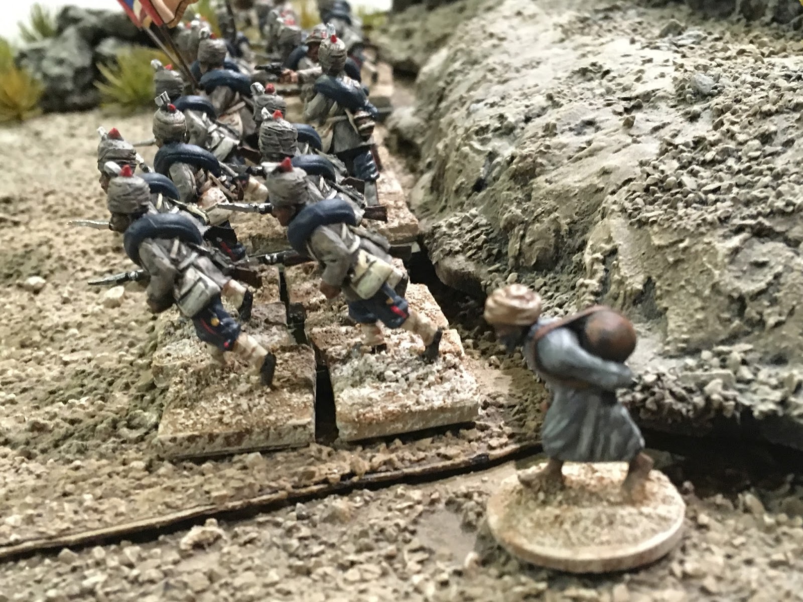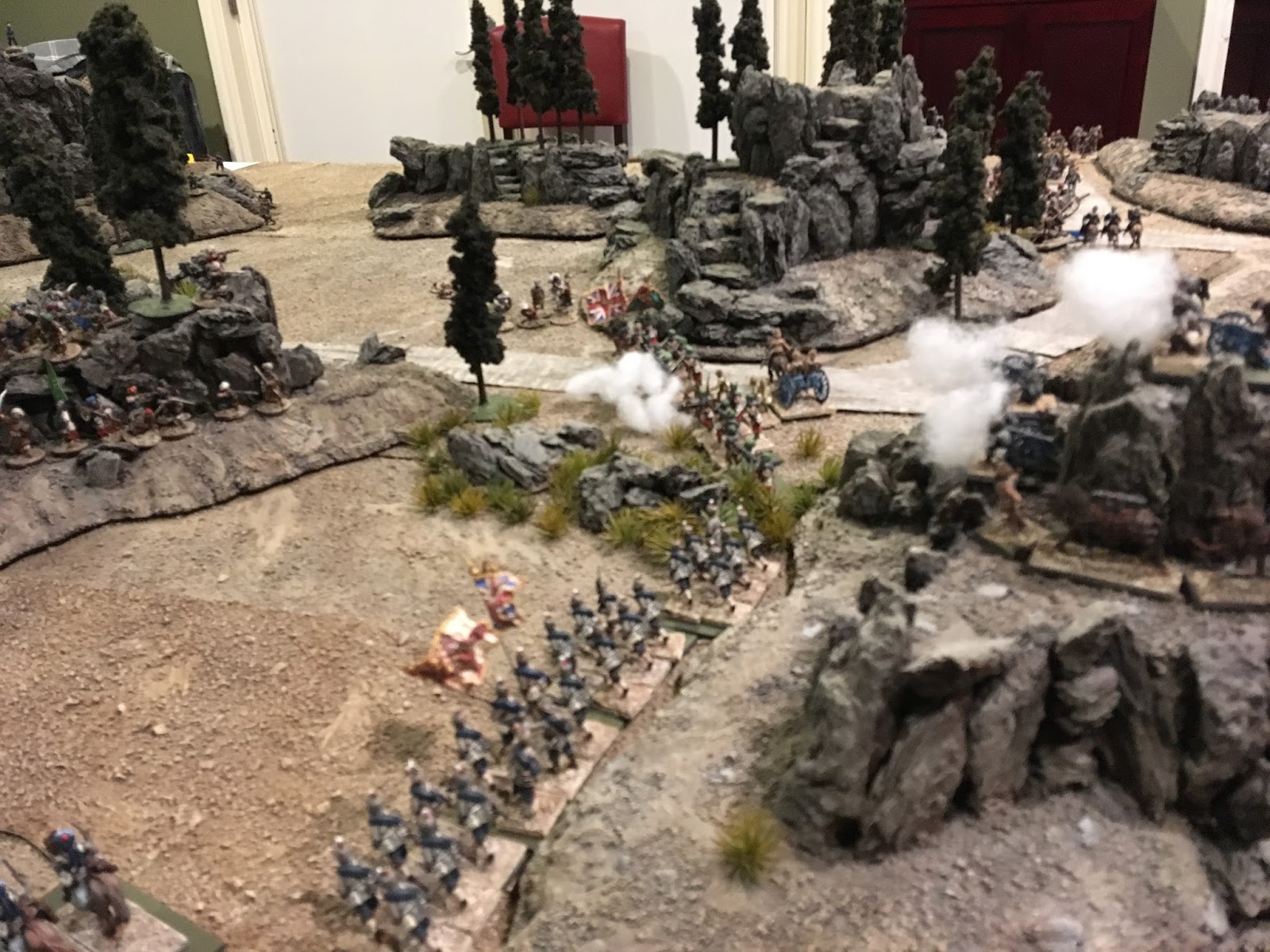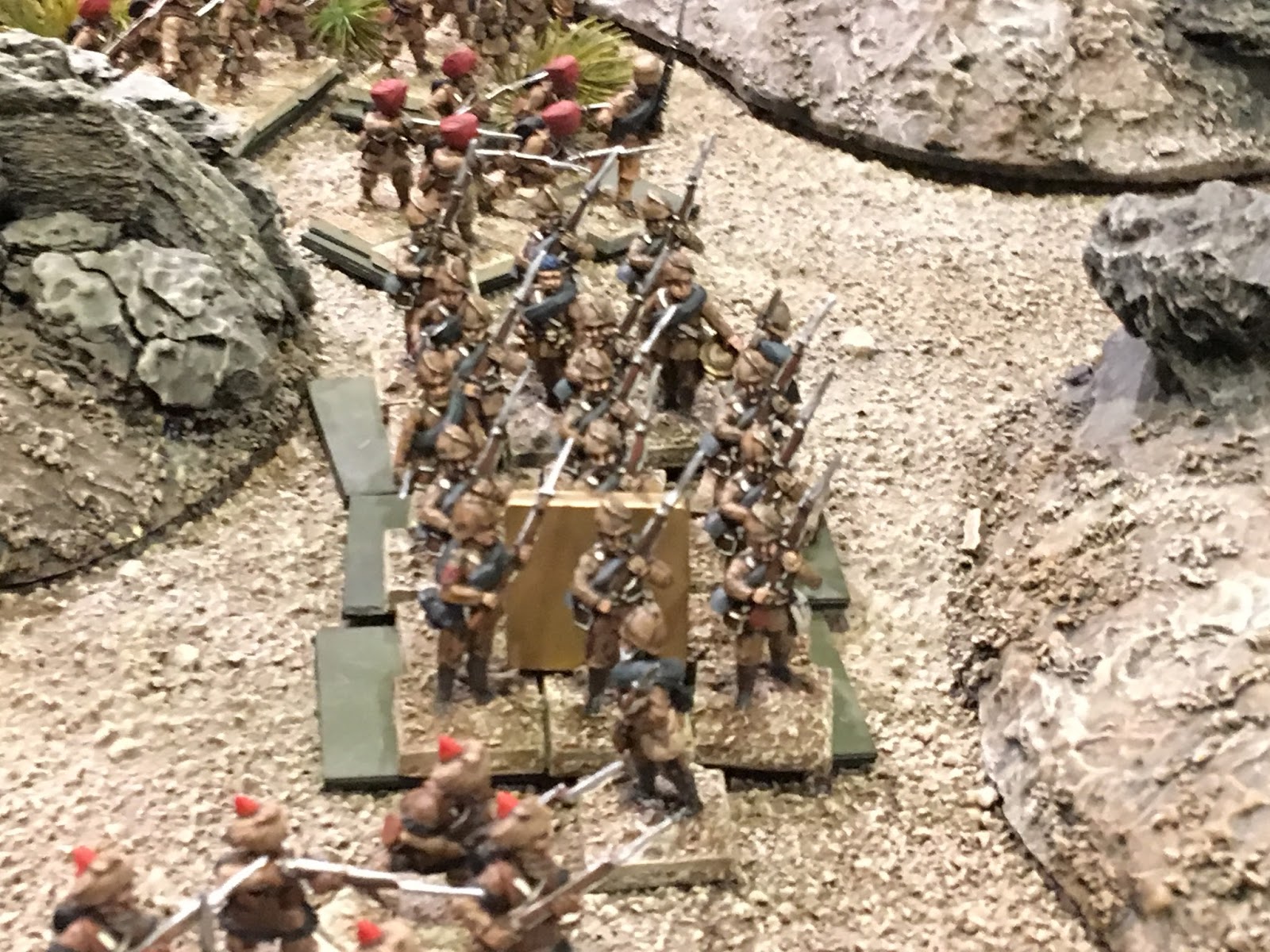 Back in the middle of the battlefield Jacob’s Rifles remain astride the road firing at the Tribesmen on the narrow rocky hill to their front while the Punjabis advance across the ridge to their left…