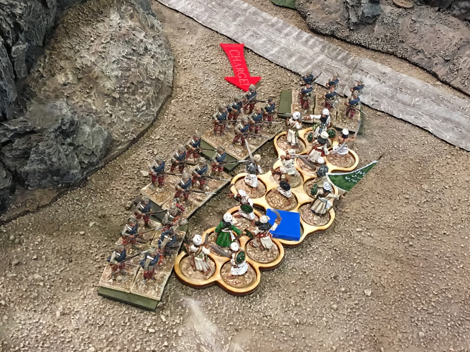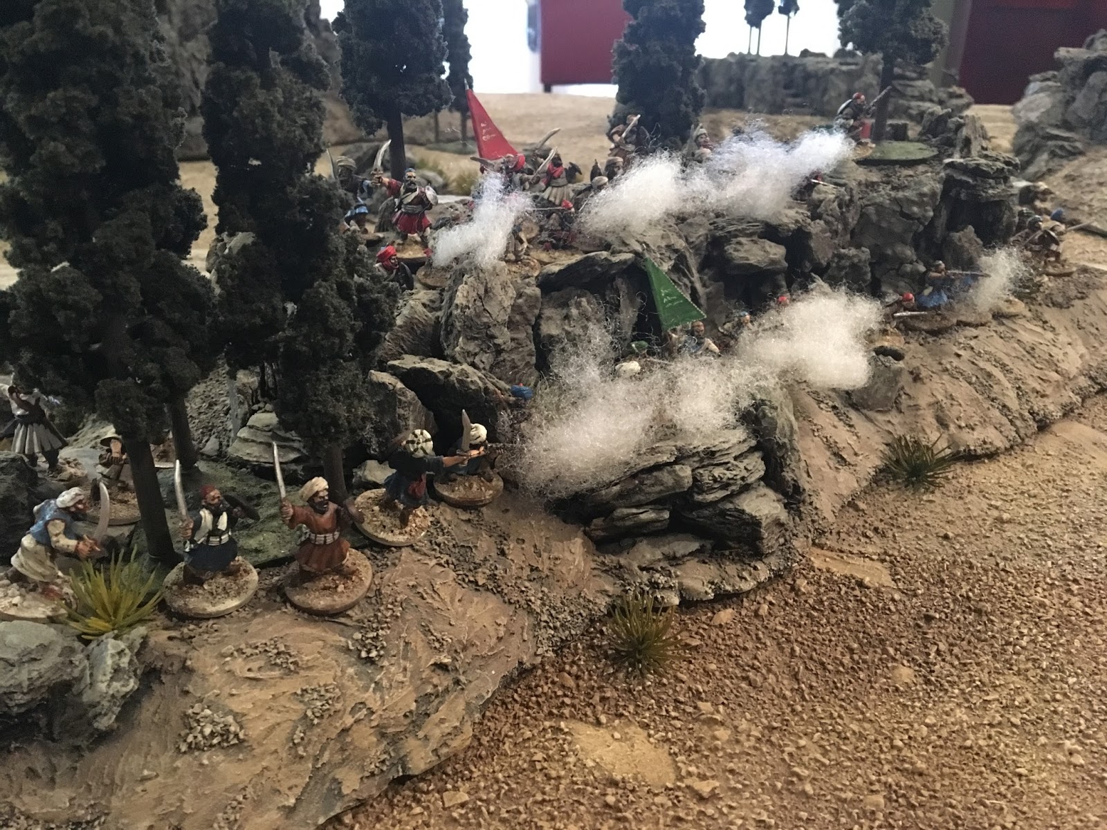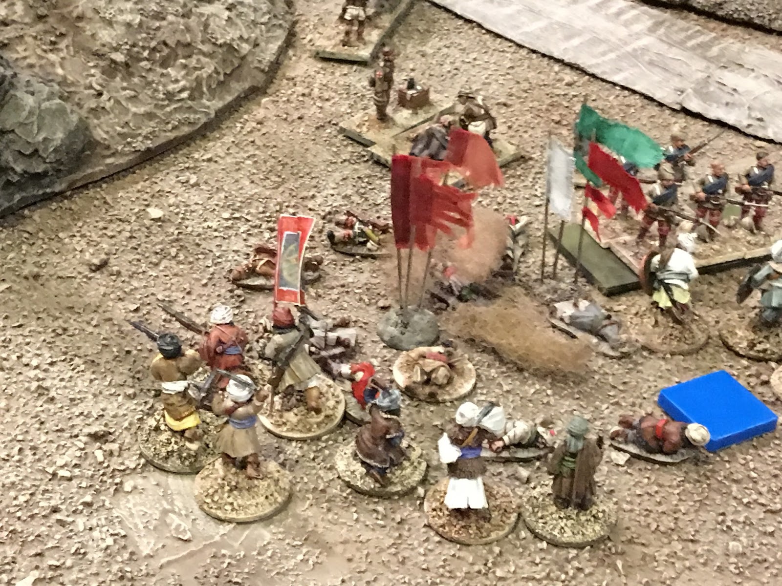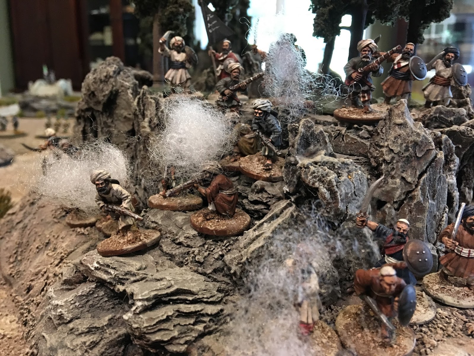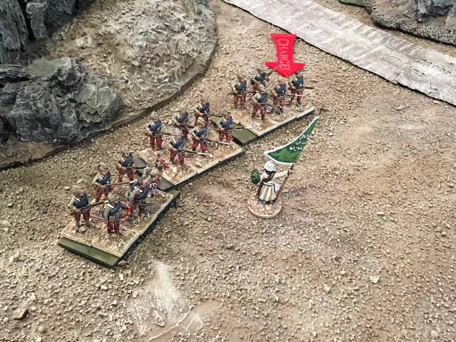 Suddenly a swarm of Ghazis clothed in pure white charges out of the rocky terrain at the Gurkhas who are strung out in open order – not the best formation for receiving fanatics in melee…
