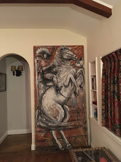 I’m not a Bonapartist but nor am I one who equates Napoleon with Satan or Hitler. My wife and I only own a couple of pieces of original art, but this painting really grabbed me — and I had an idea of where it might fit to be displayed in our house. I made some quick measurements and then a quick call and asked our friend who was house-sitting to take some measurements in our house just to be safe, then spoke again with Adrian, the artist. The next day, with my wife and kids’ support, I went back and bought “Napoleon on a big White Horse” (my name for it, not Adrian’s!) and handed gave him our address for slightly nerve-wracking shipping purposes (as it is a heavy piece, painted onto a rough chipboard panel. We flew home and a week later the Emperor was installed at our place…