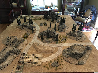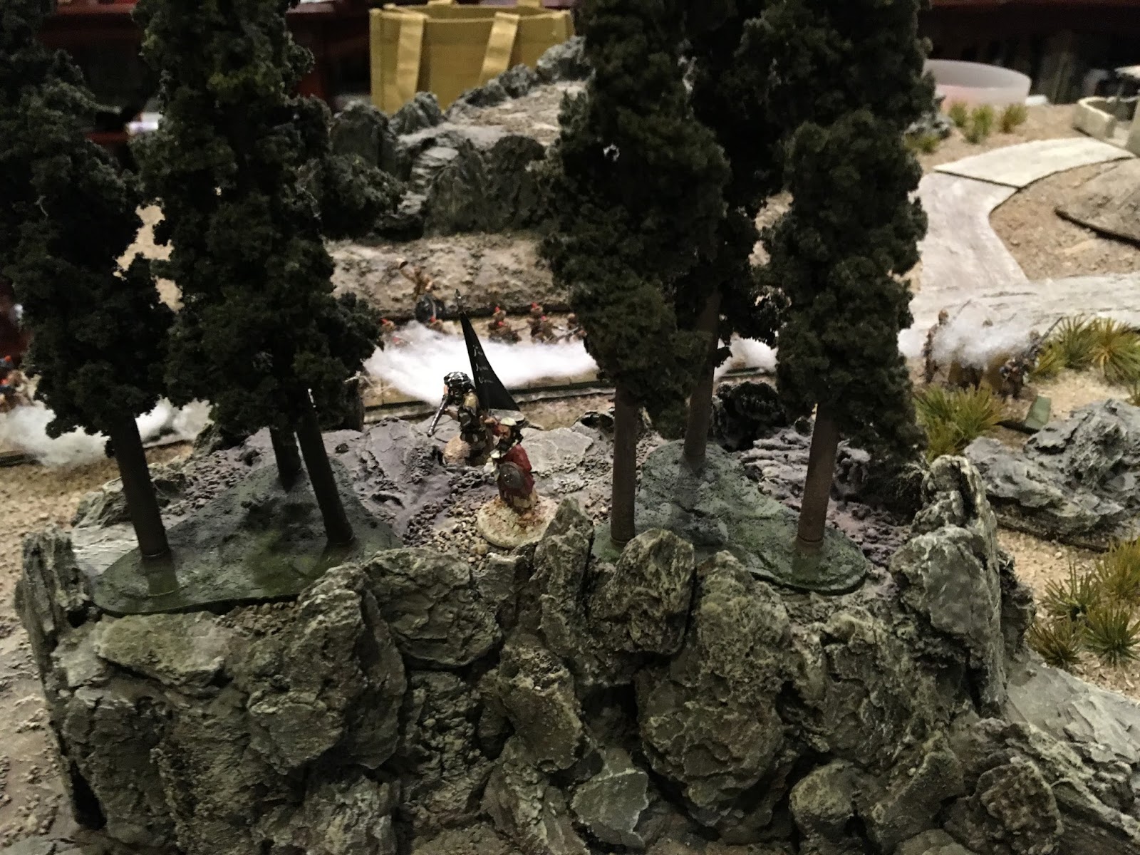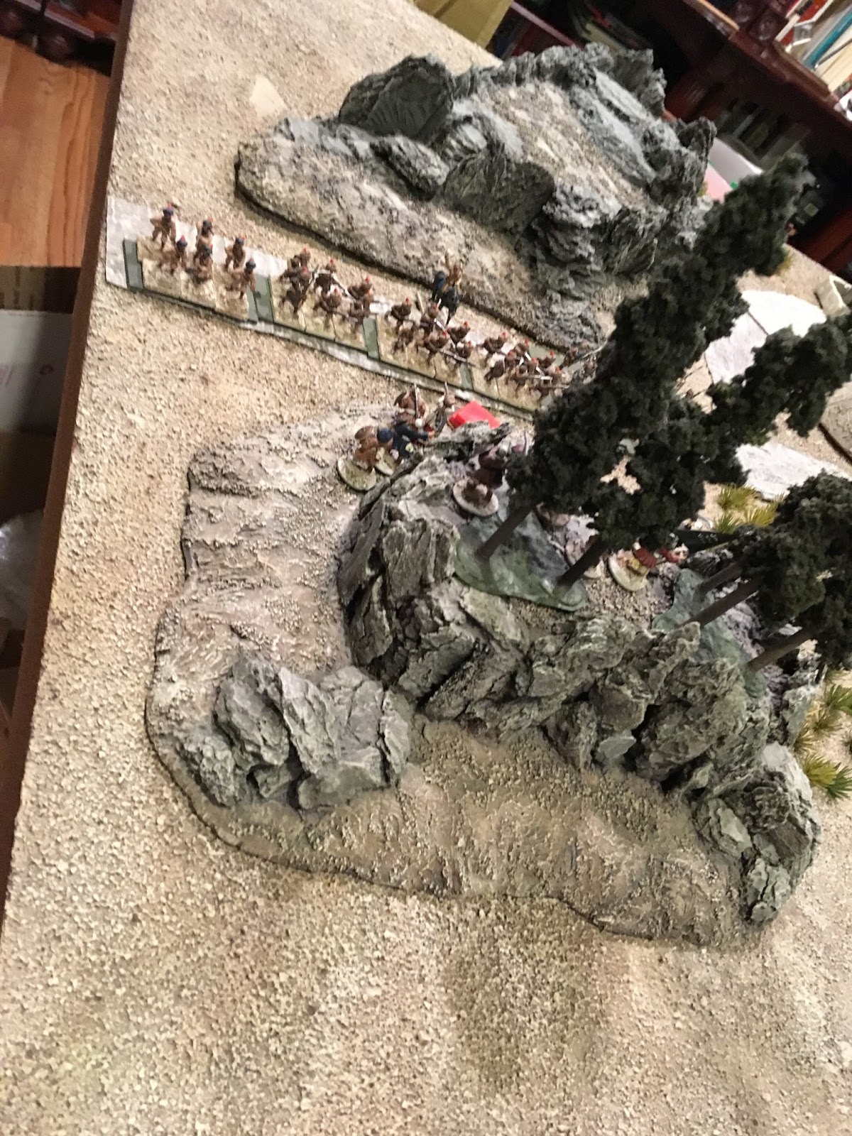 I made some adjustments to the layout I’d used for the previous 2 games, removing the hillfort and adding pine trees to some of the rocky heights.