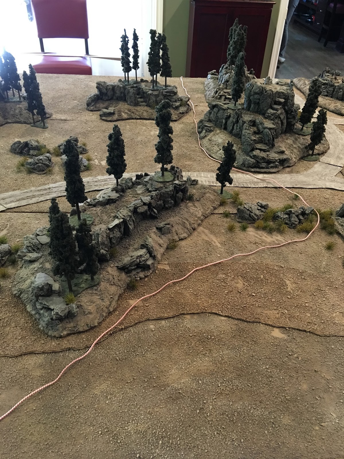 The main road stretched 8′ (about 2.7 miles using my ground scale of 1″=50 yds) up the table from a small village at the South edge of the table to the bridge at the North, but the ground between the British entry-points and that objective was filled with 2 low hills, several areas of rough terrain and 7 rocky pine-covered hills…