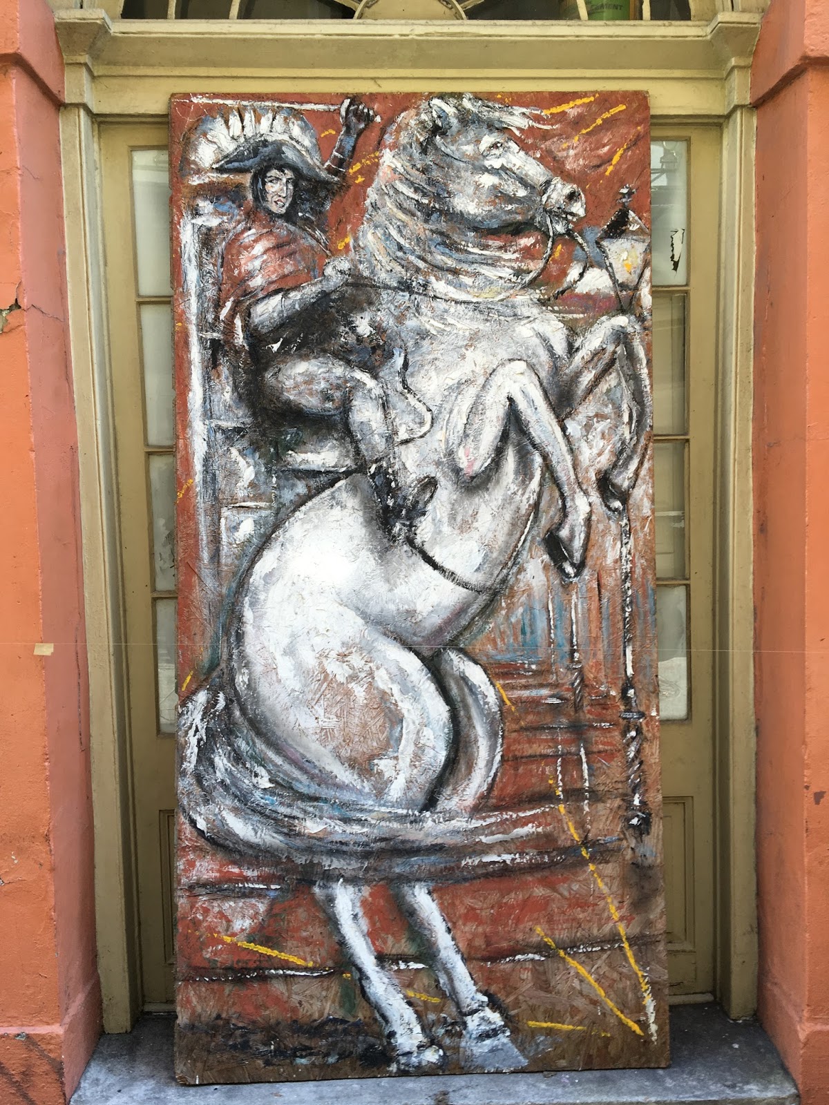 While walking in the French Quarter late one night we passed an artist working on a painting on the street outside his studio alongside his adorable little dog, and struck up a conversation.