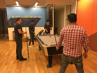 Our team in Mumbai: my partner, myself, 3 top-notch screenwriters (Bhavani Iyer; Mayank Tewari [big beard] & Siraj Ahmed [trimmed beard]), 1 top-notch production executive (Gaurav Verma in glasses), 1 boy-wonder novelist (Bilal Siddiqui – young enough to be anyone else in the picture’s son!) and — in sunglasses at the center — Bollywood superstar Shah Rukh Khan AKA: SRK…