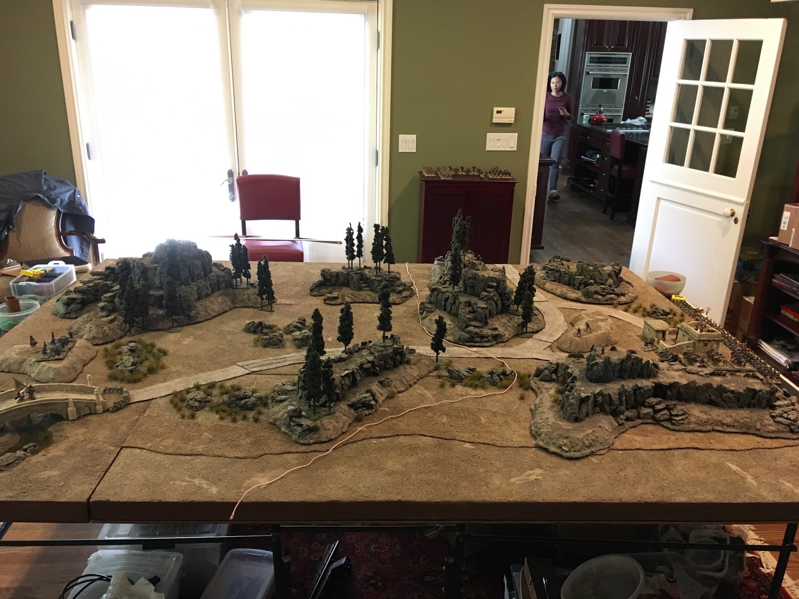 The main road stretched 8′ (about 2.7 miles using my ground scale of 1″=50 yds) up the table from a small village at the South edge of the table to the bridge at the North, but the ground between the British entry-points and that objective was filled with 2 low hills, several areas of rough terrain and 7 rocky pine-covered hills…