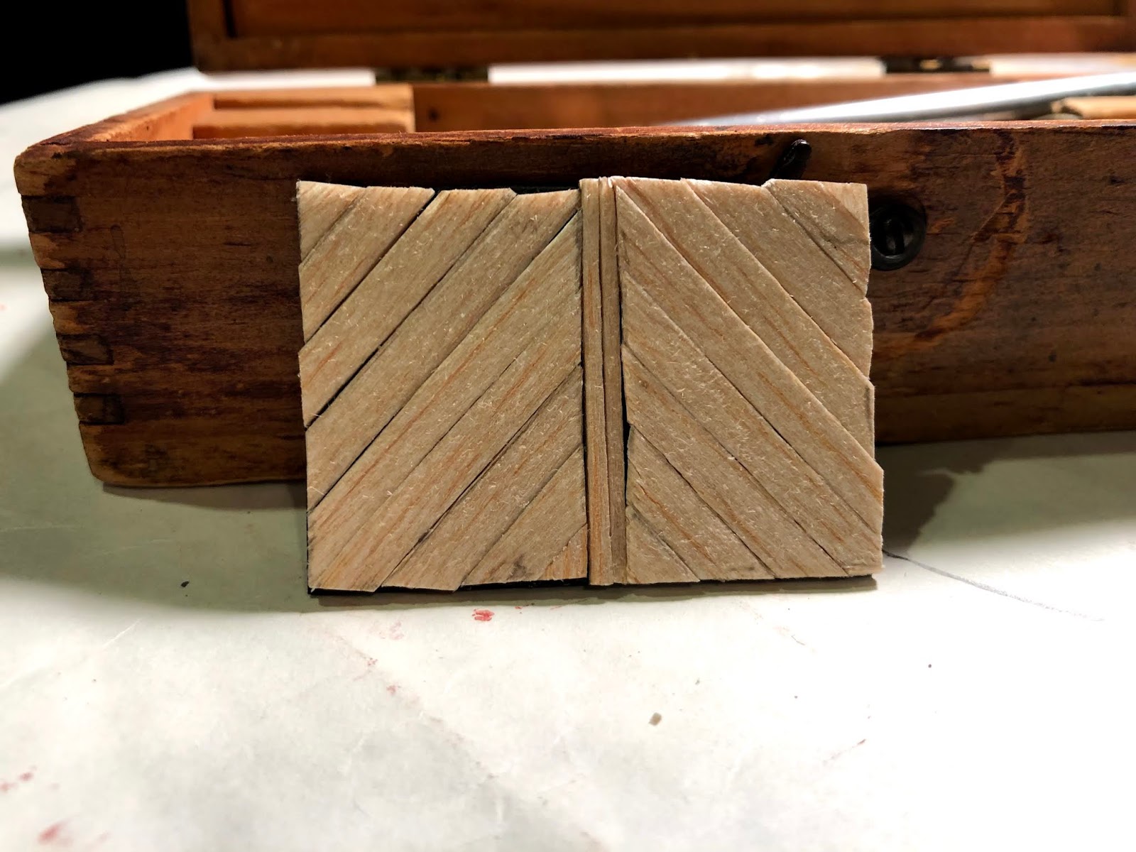 I am a woodworker’s son but sadly no woodworker, be it in 1:1 or 1:56th scale. Still, I wanted to transfer the colorful door design from cardboard to wood. So I dug out a piece of BALSA and my old wooden box of X-Acto knives and gave it a go…