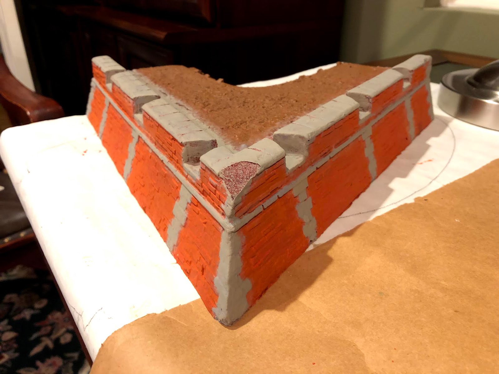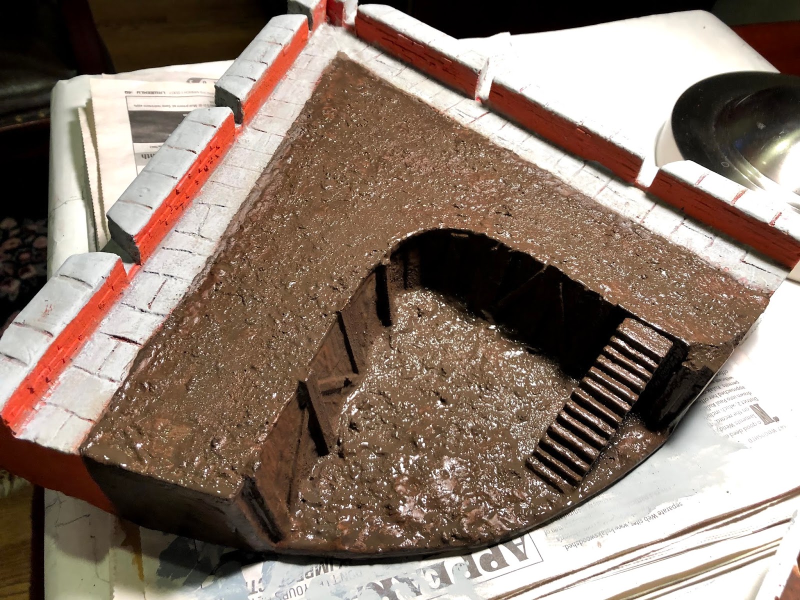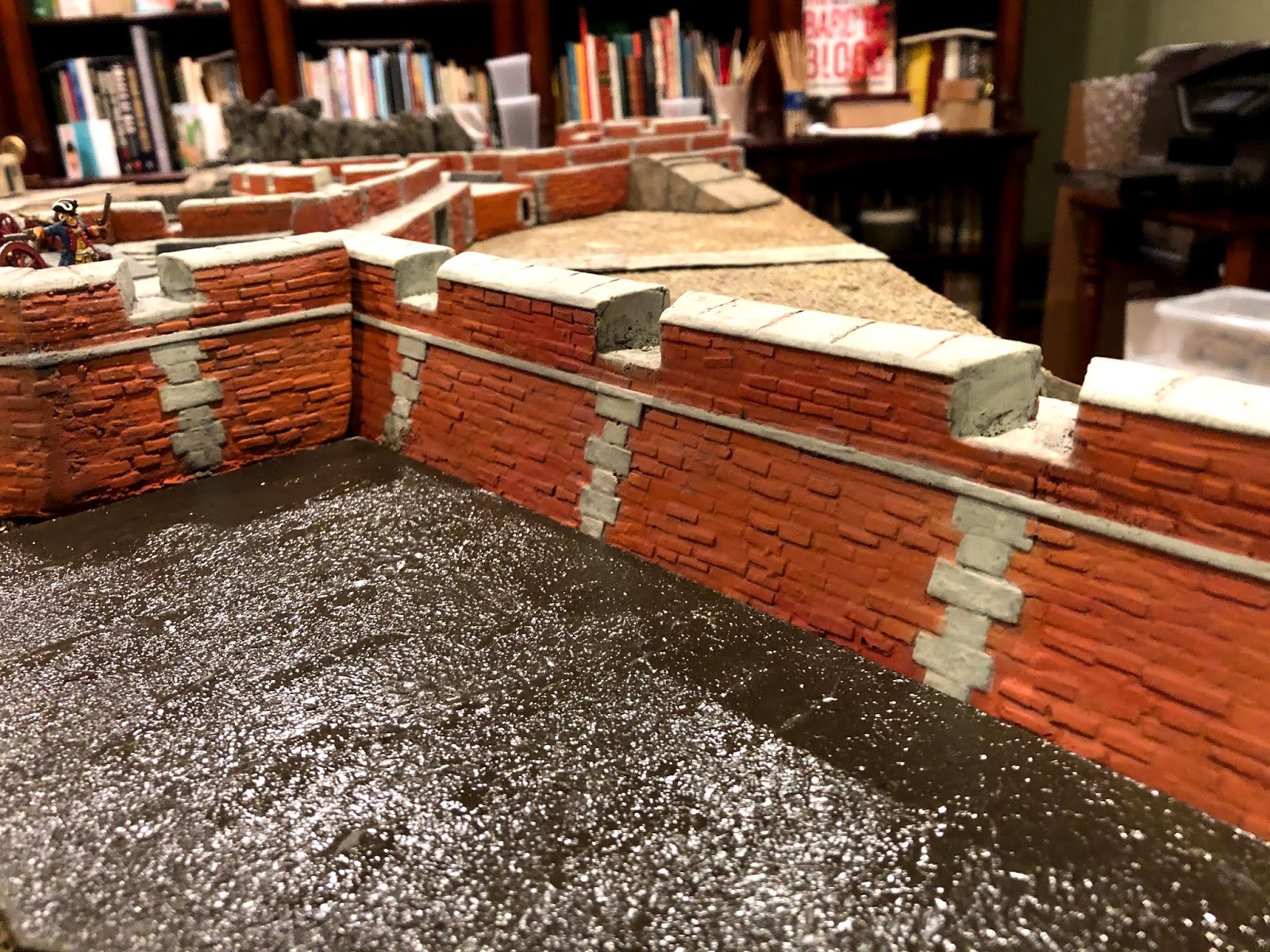 While digging around in my hobby closet I came across a small test-piece I’d done before making a canal for a US Airborne jump into Eindhoven, Market Garden game* for another gaming friend a few years ago, and thought it might fit in a corner where the wall joins a bastion. It did…