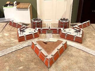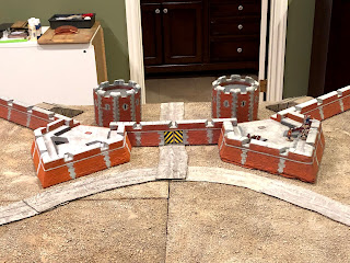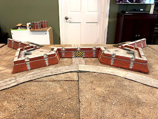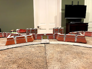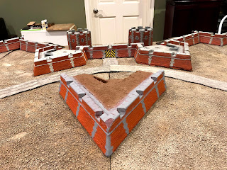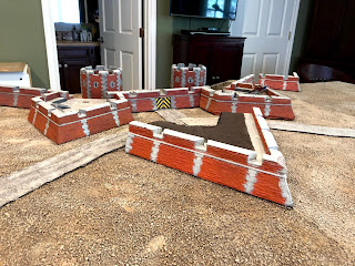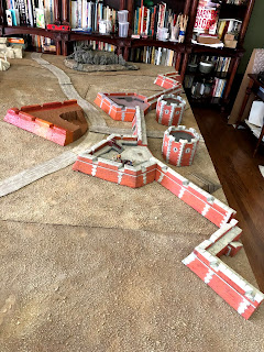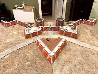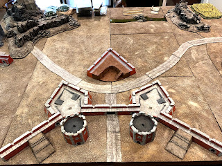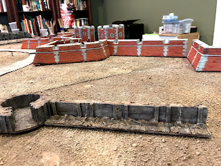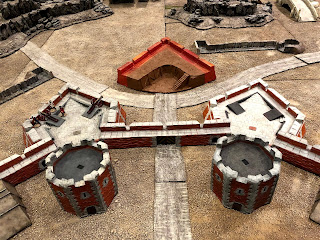 By now I had removed all of the scatter terrain pieces that were on the board before I started this project and shifted around some of the terrain boards, removing the river that had run through the middle of the table and making room for the whole fortress to be set up along one long end…